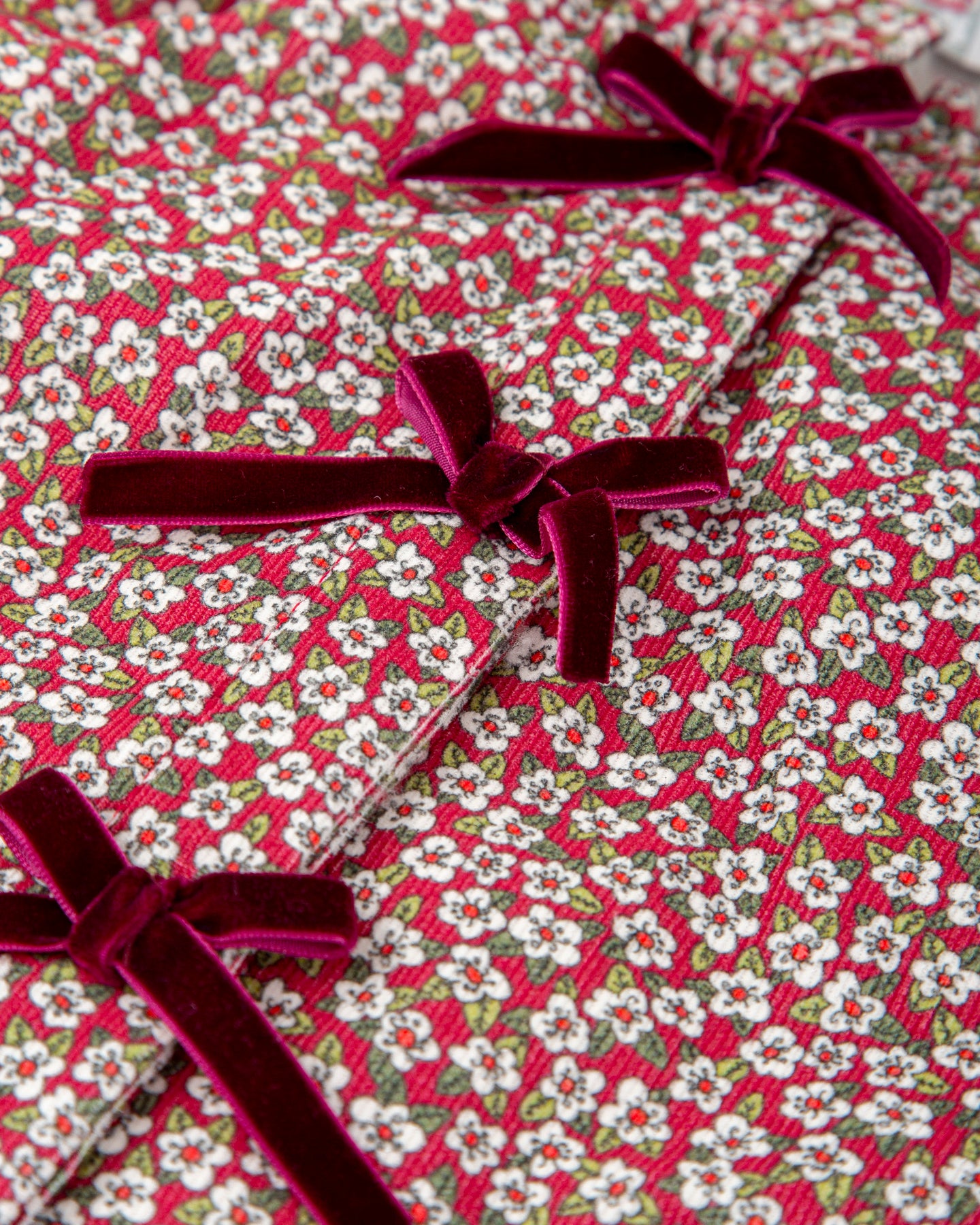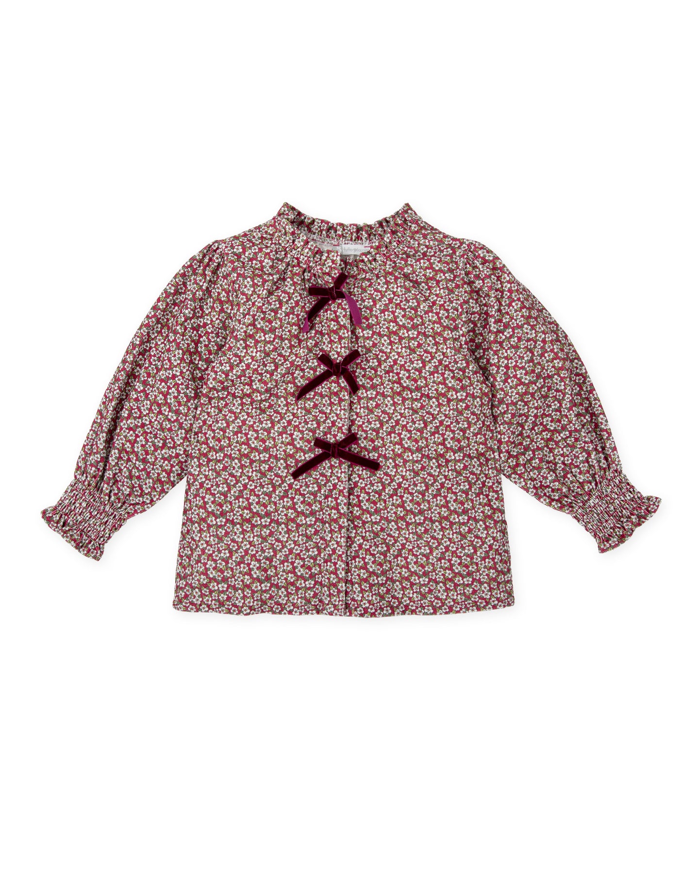 Long-sleeved blouse in printed micro-corduroy with little flowers. Bow details on the front and elastic cuffs. Hidden front opening with buttons.