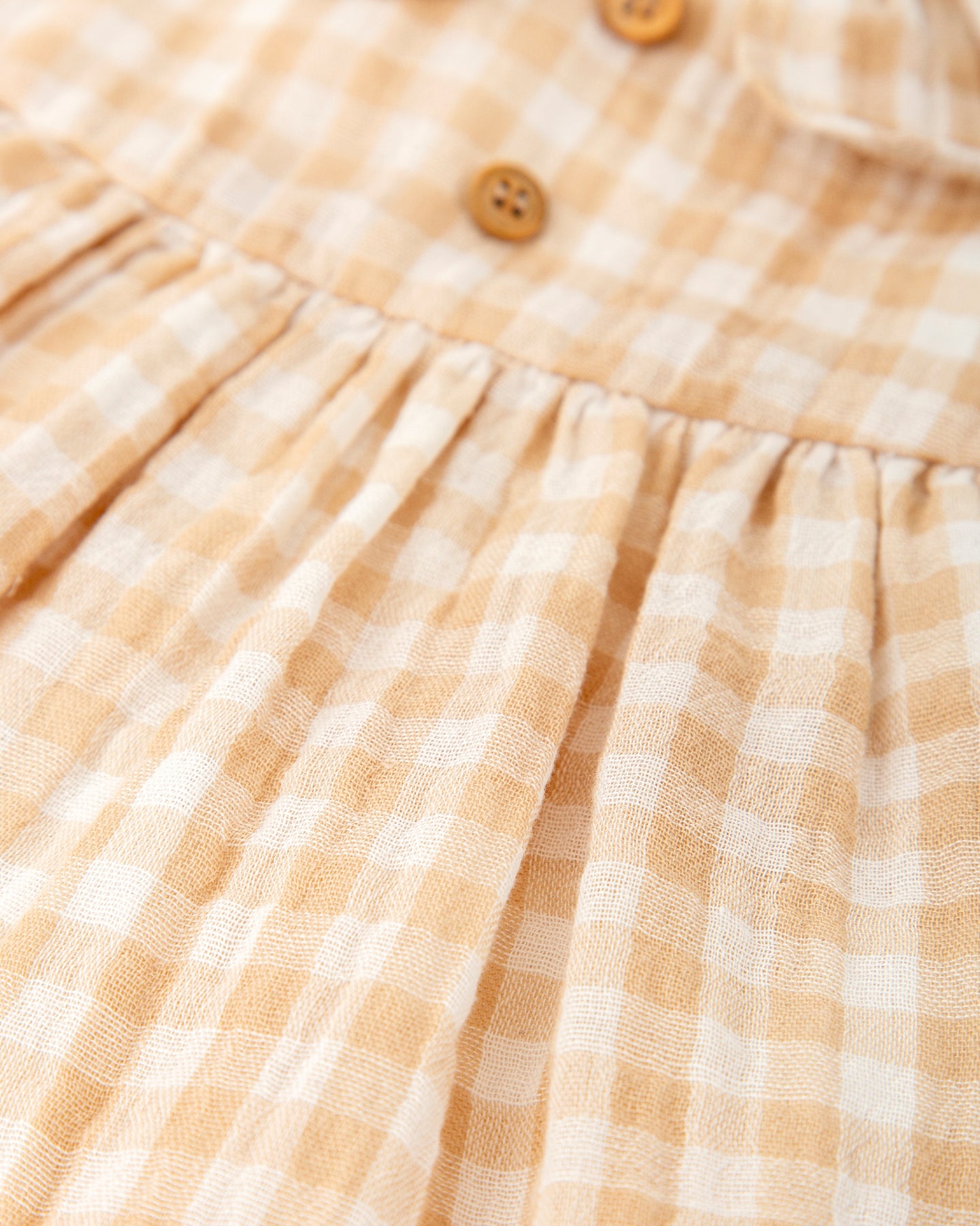 Sand-colored gingham dress. Yoke with soft poplin lining. Back opening with buttons.