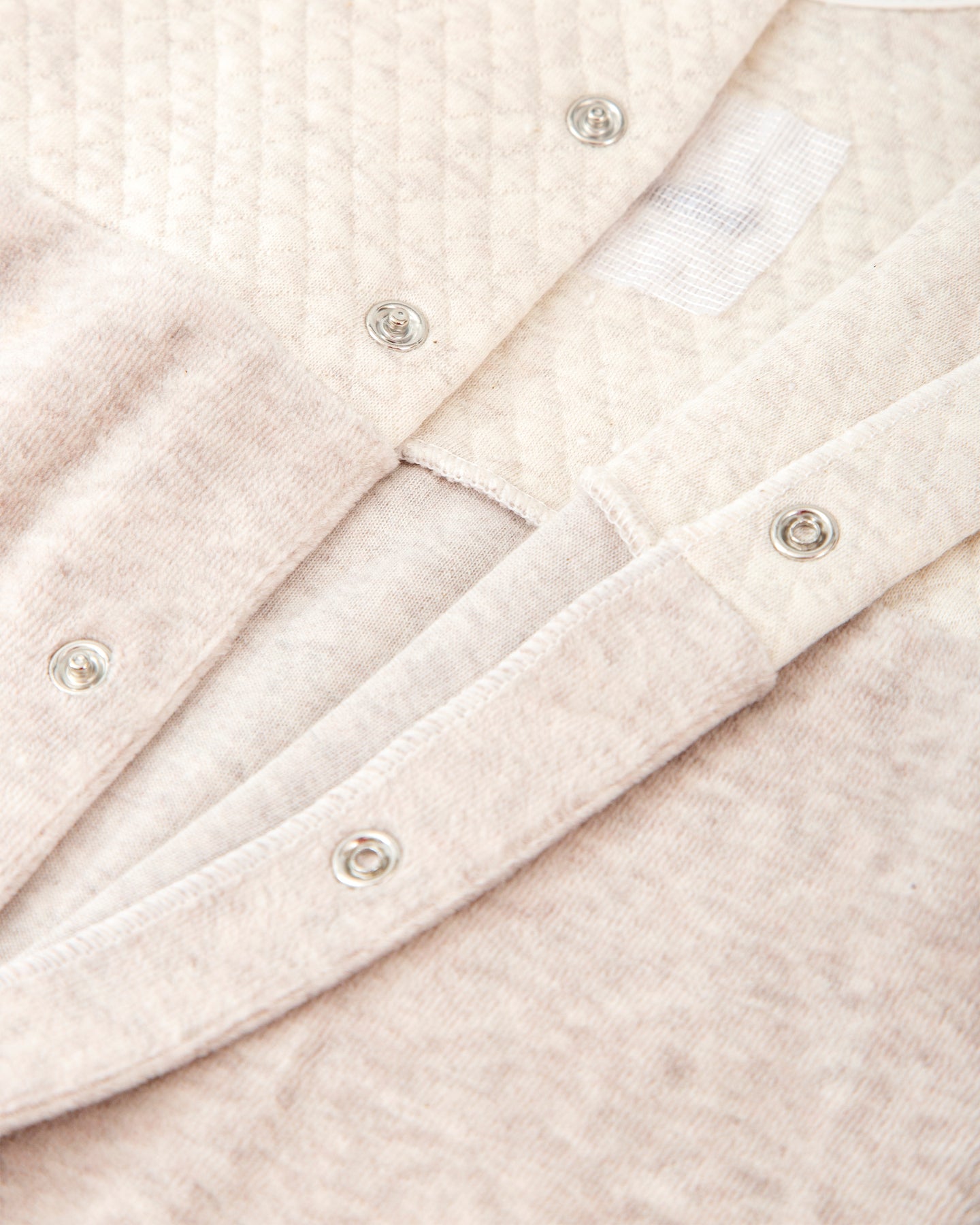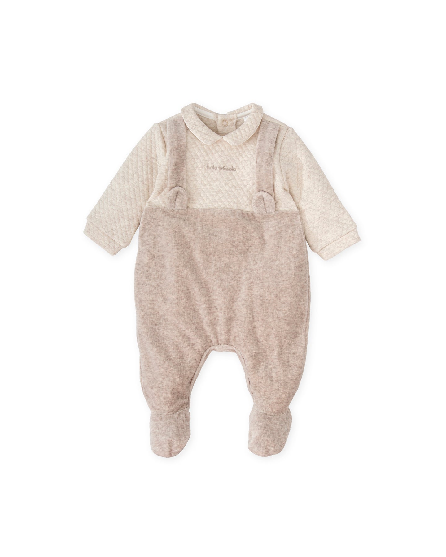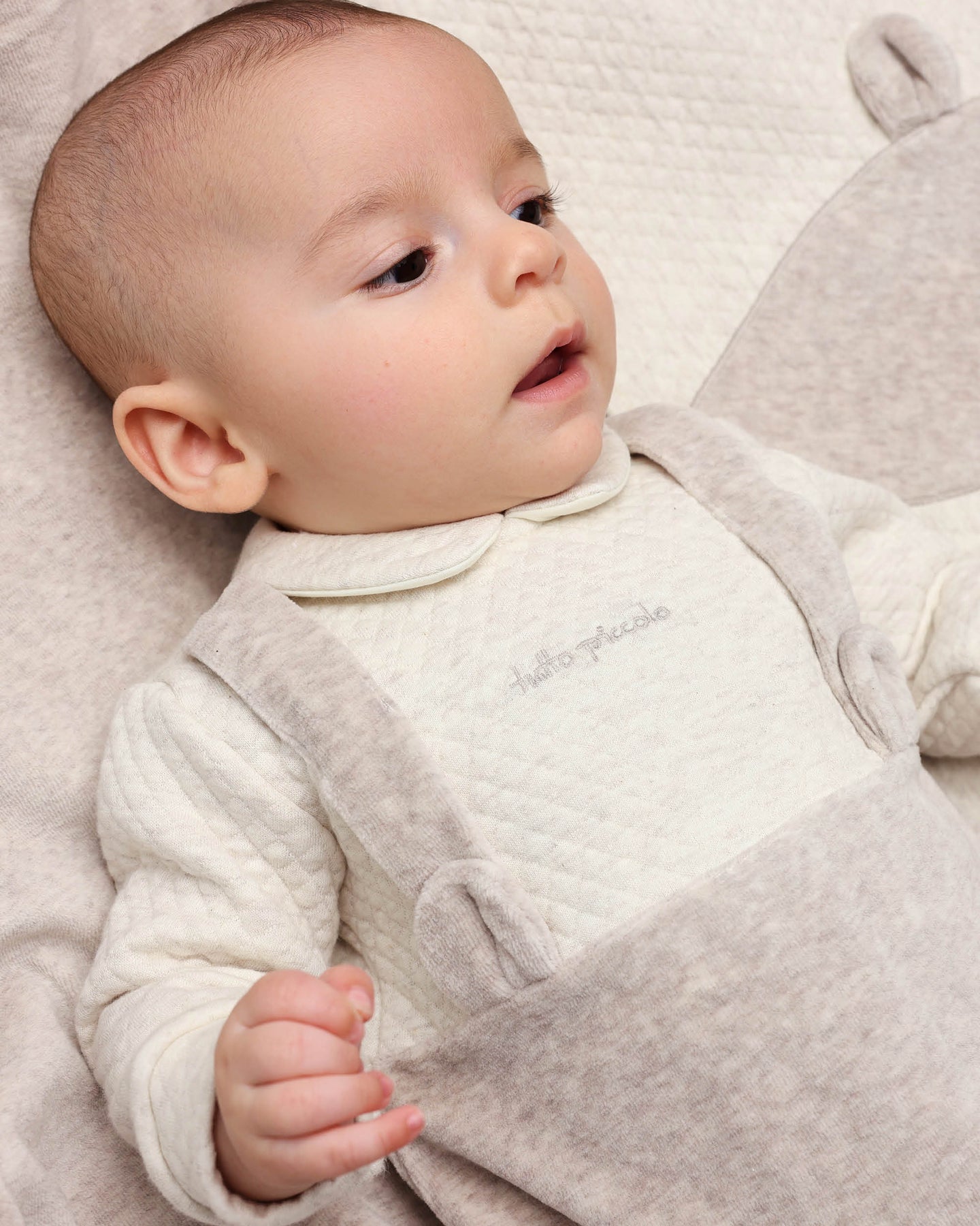 Long romper with feet in ecru interlock fabric with a quilted effect combined with grey tundosado fabric to simulate two pieces. Embroidered logo detail and footprint on the sole of the foot. Back opening and crotch with press stud.