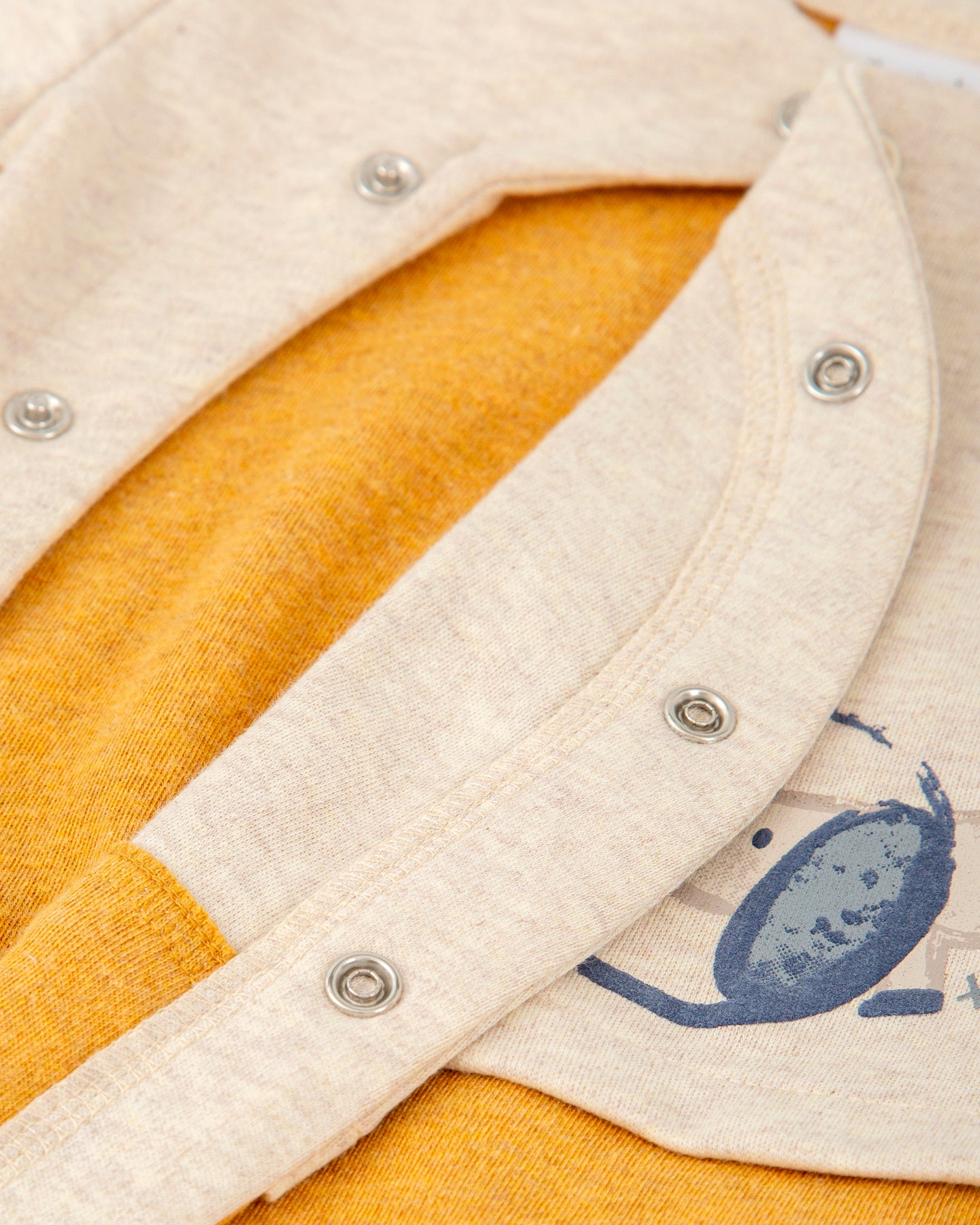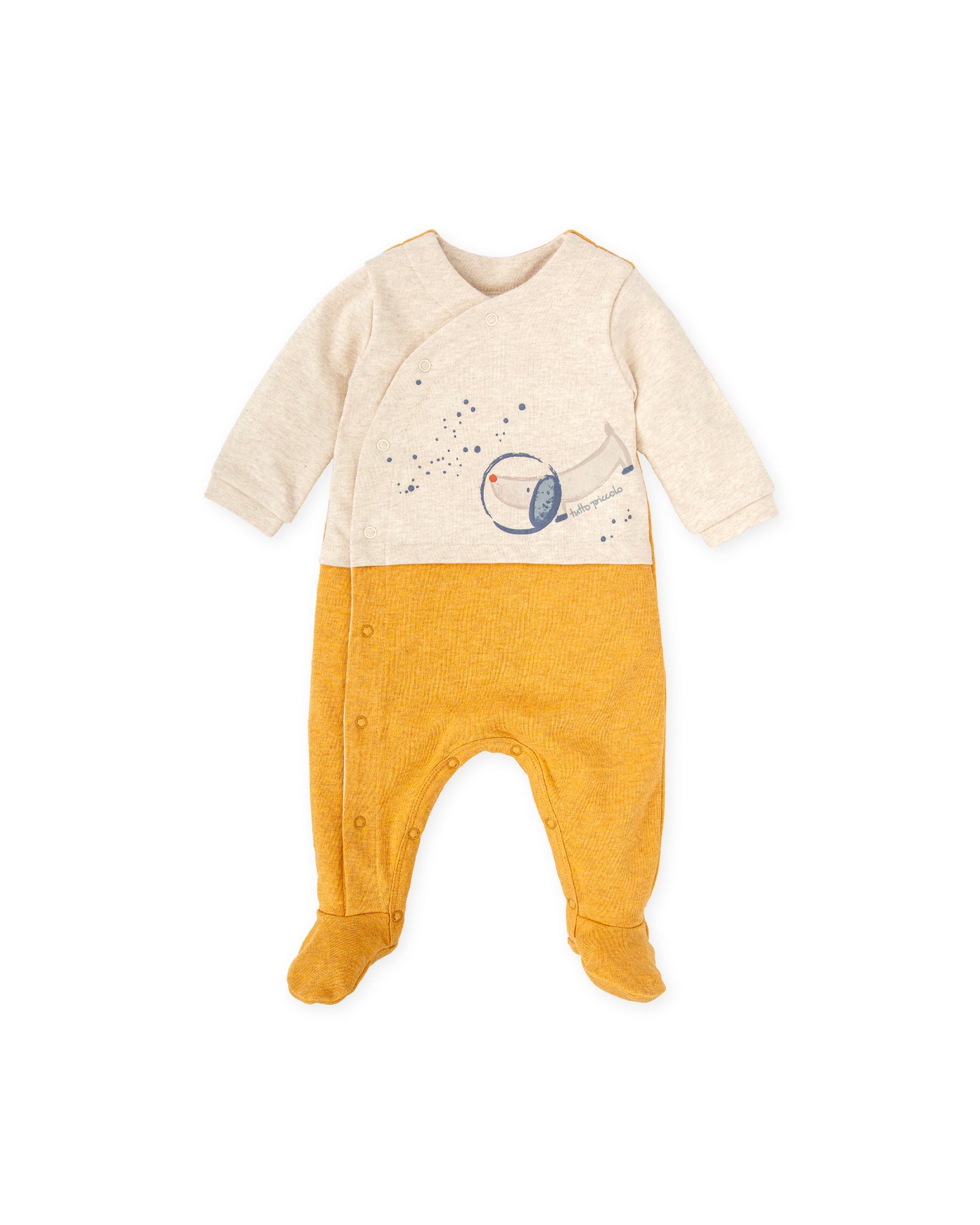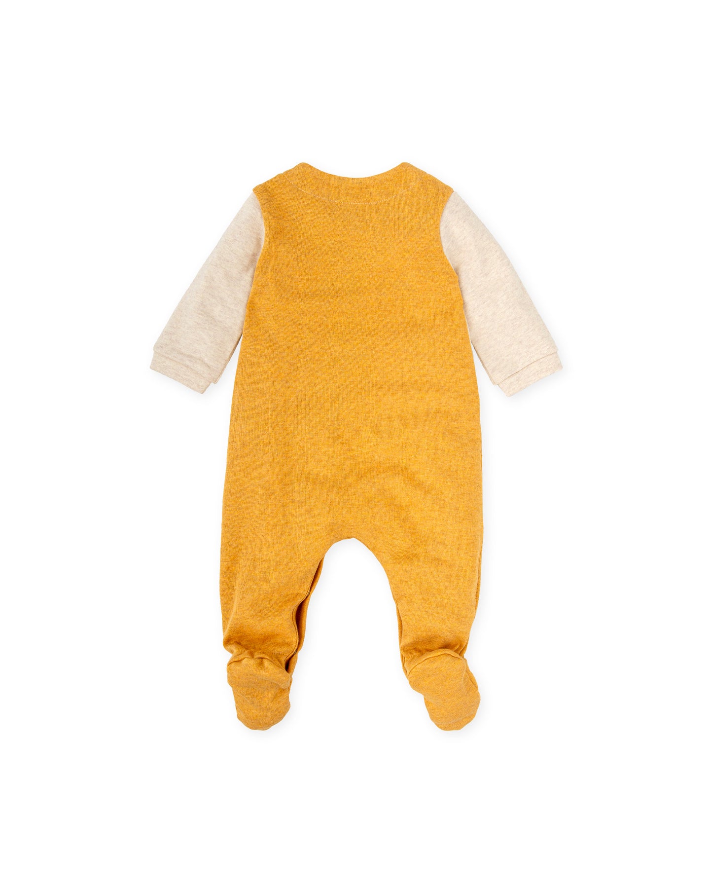 Long footed romper in ecru and mustard interlock with a mottled effect. Dog detail with printed logo. Front opening and crotch with press stud.