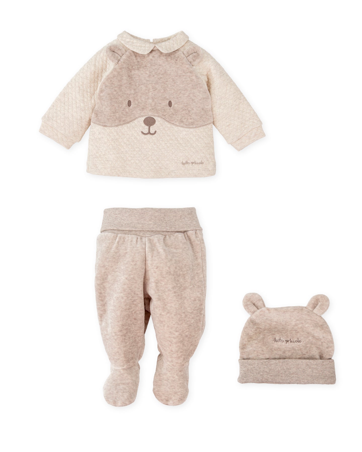 Newborn set with two pieces with feet in ecru interlock fabric with a quilted effect combined with grey ribbing. Embroidered bear face detail. Back opening with press stud. Waistband with soft ribbing and footprint embroidery. Hat with ears.