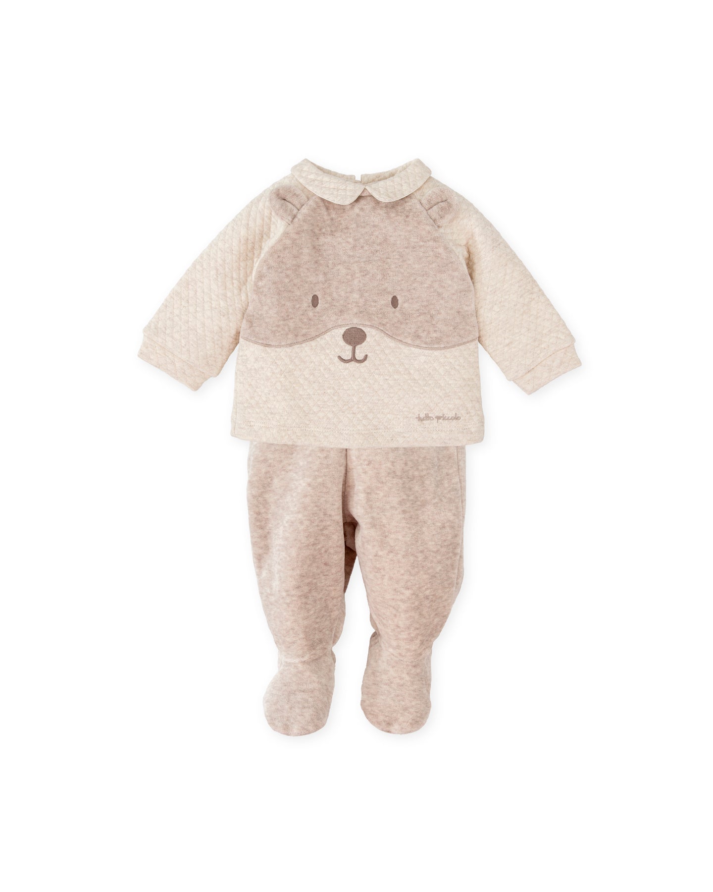 Two-piece set with foot in ecru interlock with quilted effect combined with grey. Embroidered bear face detail. Back opening with press stud. Waistband with soft ribbing and paw print embroidery on the sole.
