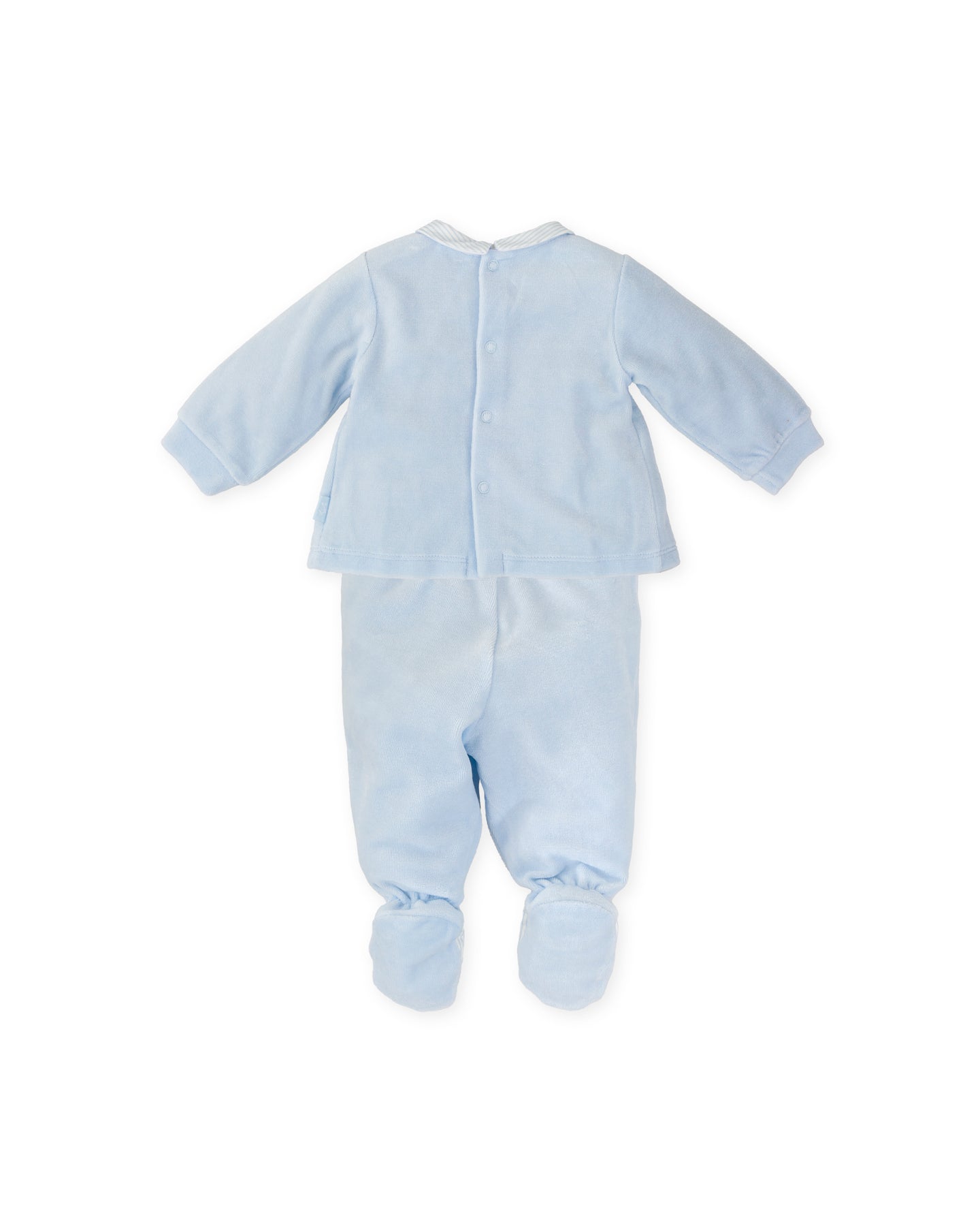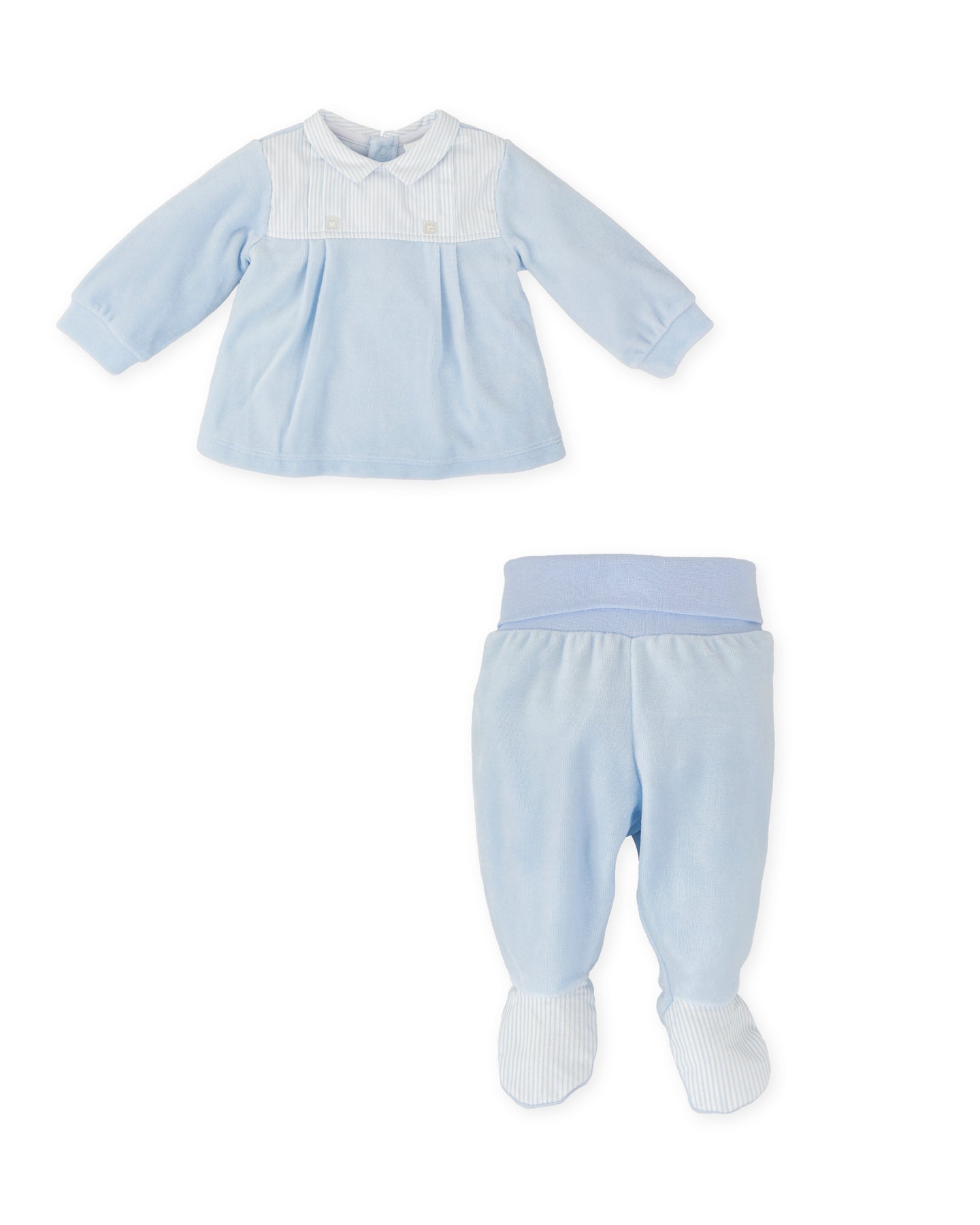 Two-piece set with light blue ribbed foot, collar, yoke and feet in striped poplin. Soft ribbing at the waist. Back opening with press stud.