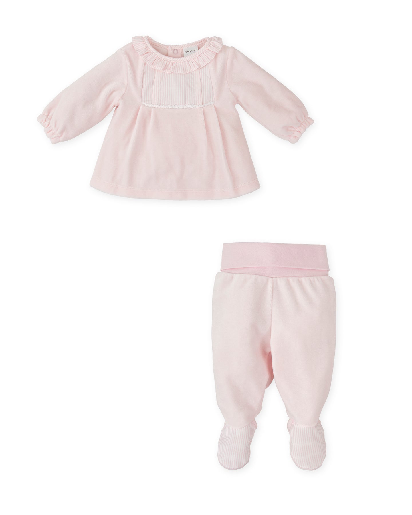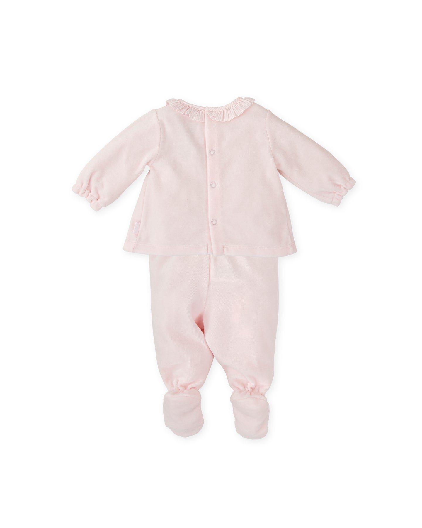 Two-piece set with pink tumbled foot with ruffle and striped poplin yoke. Soft elastic cuffs. Back opening with press stud. Soft ribbed waistband.