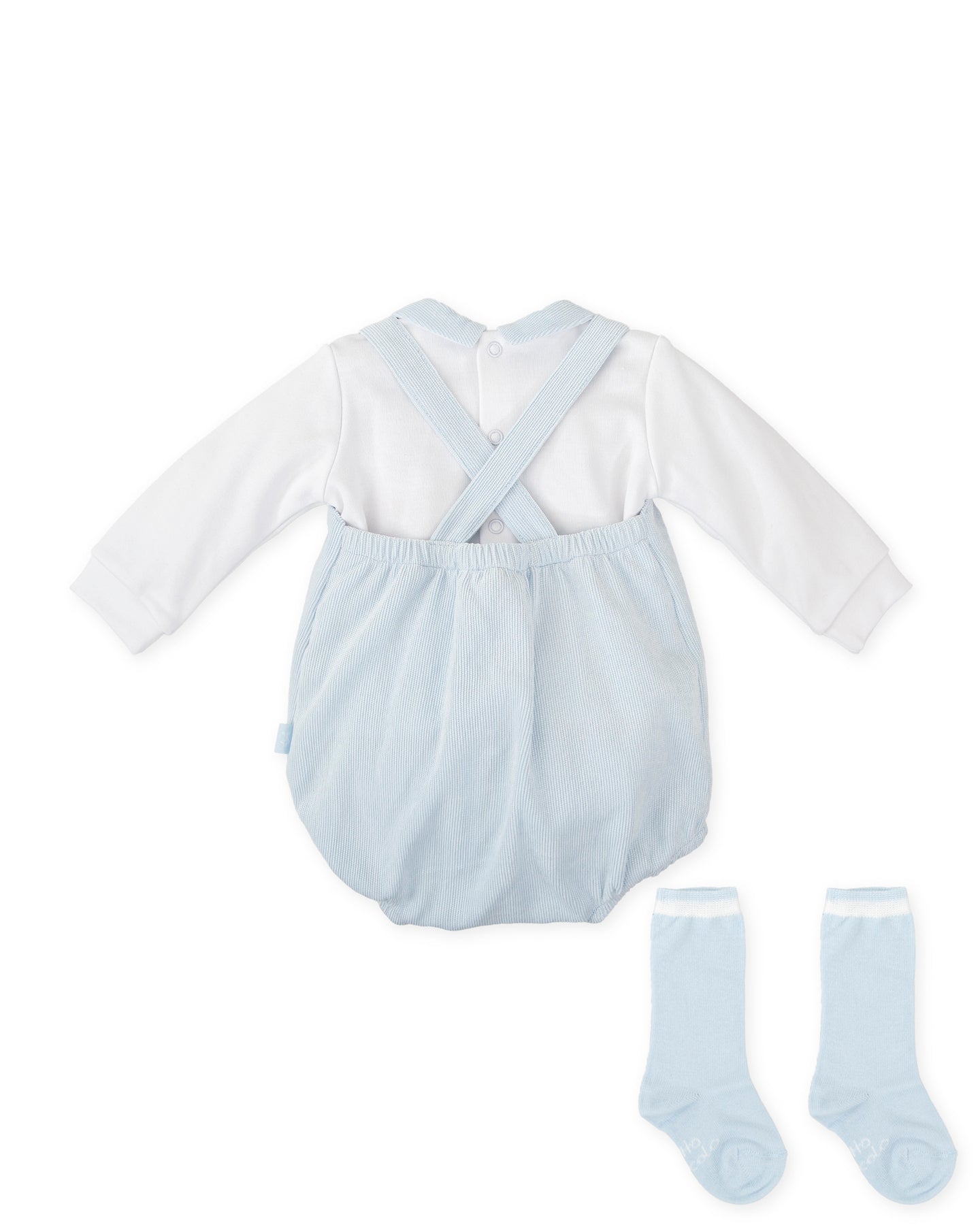 Set consisting of a light blue micro corduroy romper and interlock shirt. Soft elastic at the back and thighs. Buttoned straps and press stud fly. White interlock T-shirt with micro corduroy collar and press stud opening at the back. Makes a set with light blue socks.