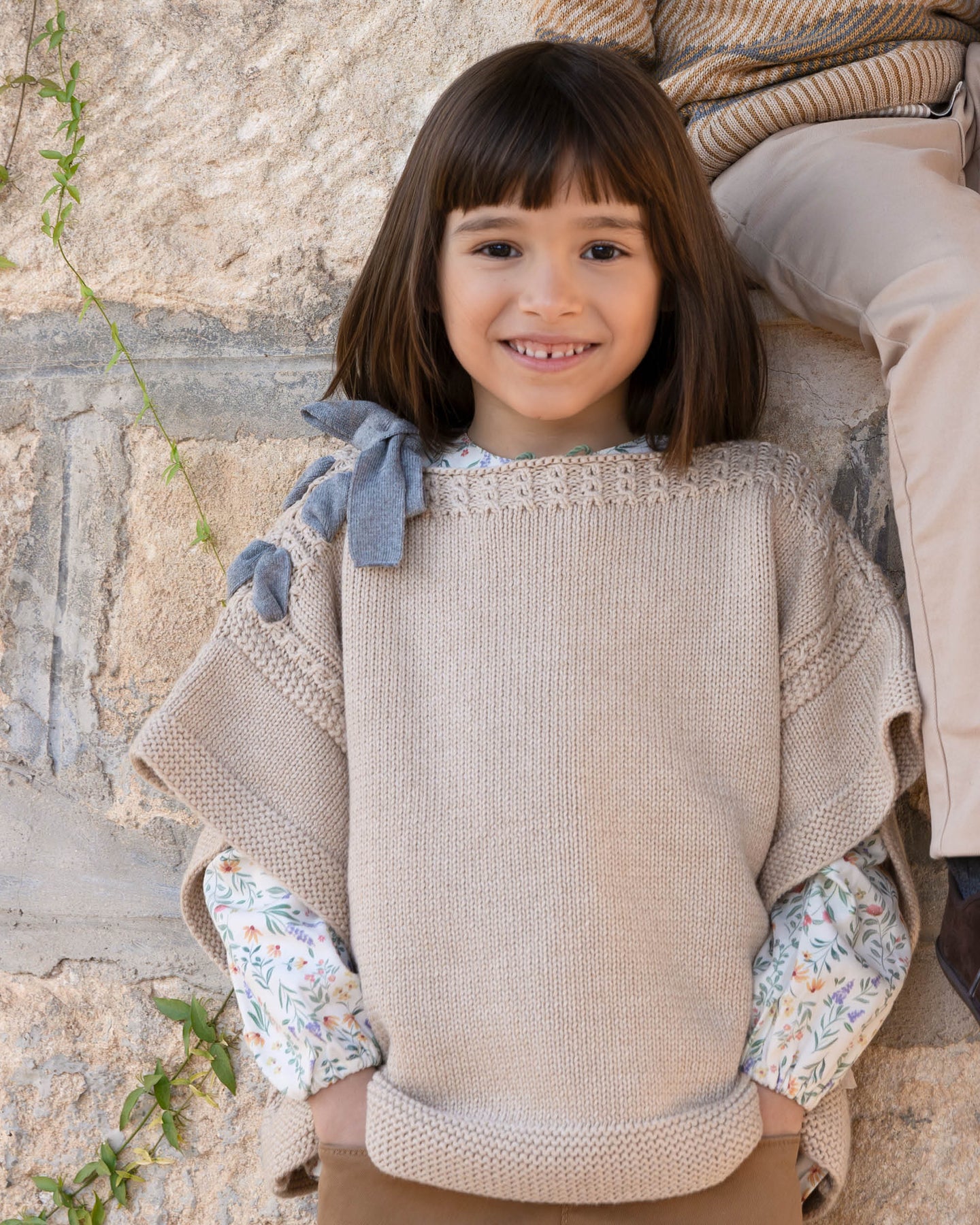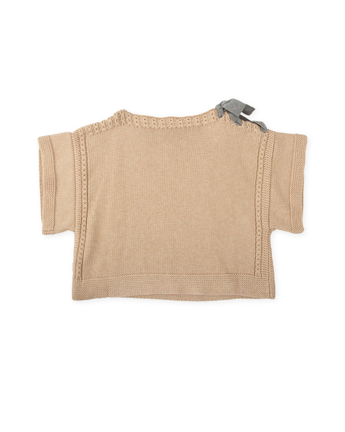 Sand-colored knitted cape with decorative bow detail.