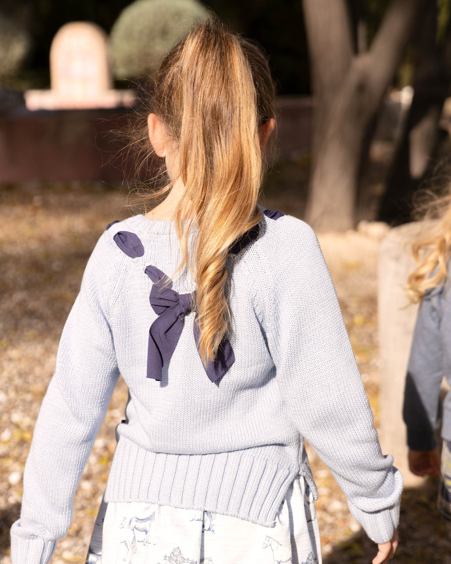 Porcelain-coloured knitted jumper with shiny accents. Bow detail on the back.