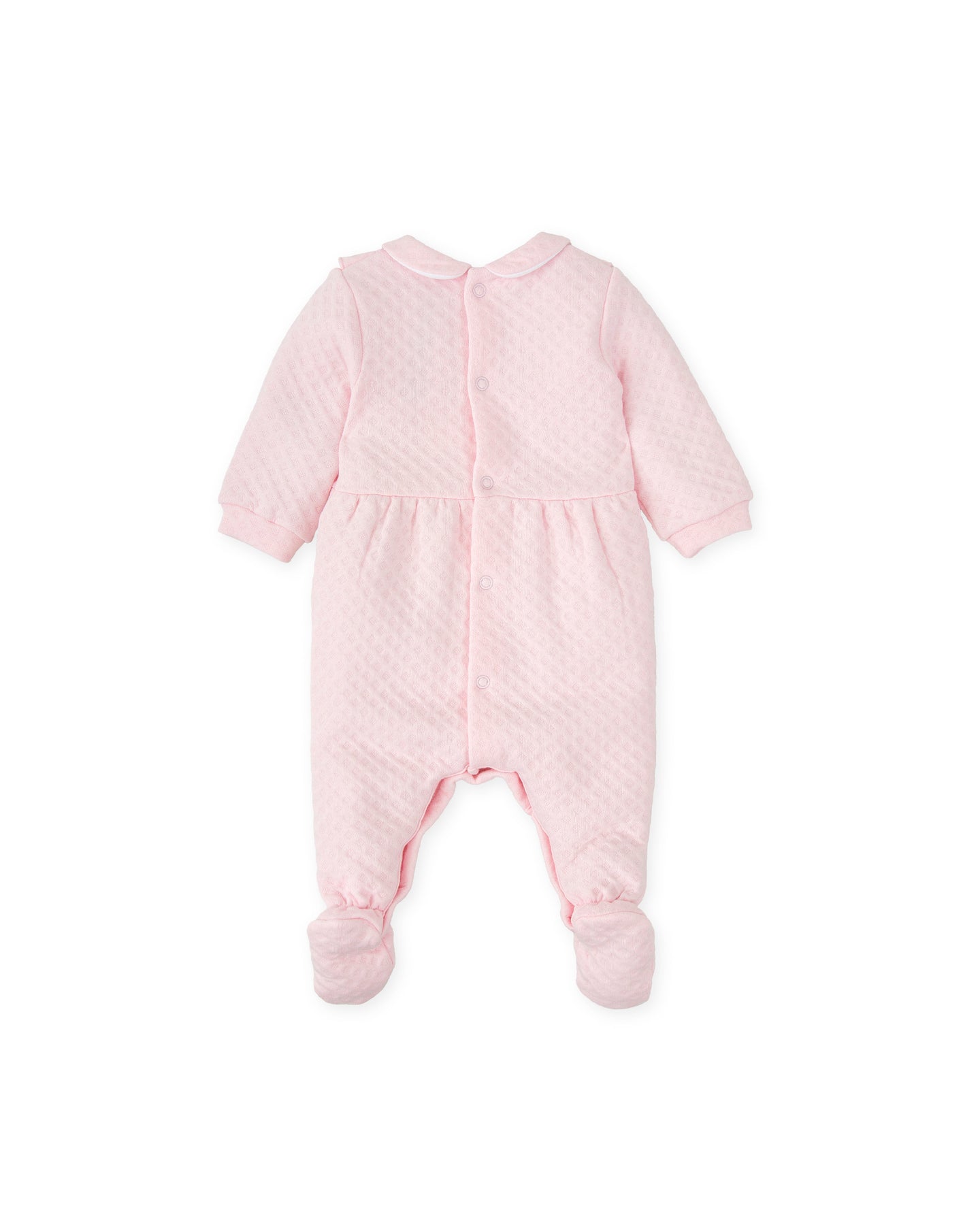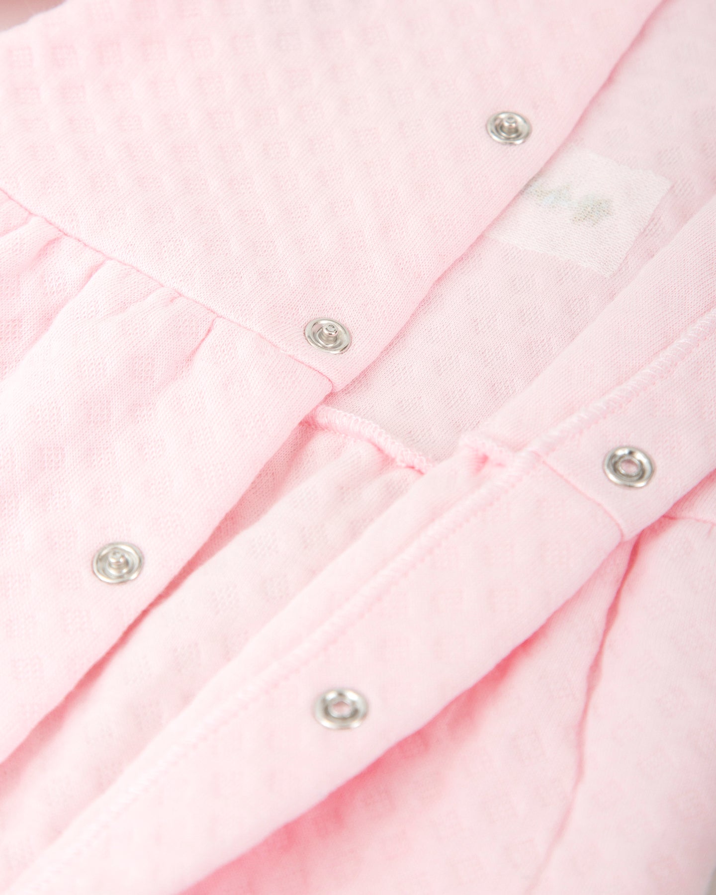 Long pink quilted interlock romper with ruffles on the sides, back opening and snap buttons at the crotch.