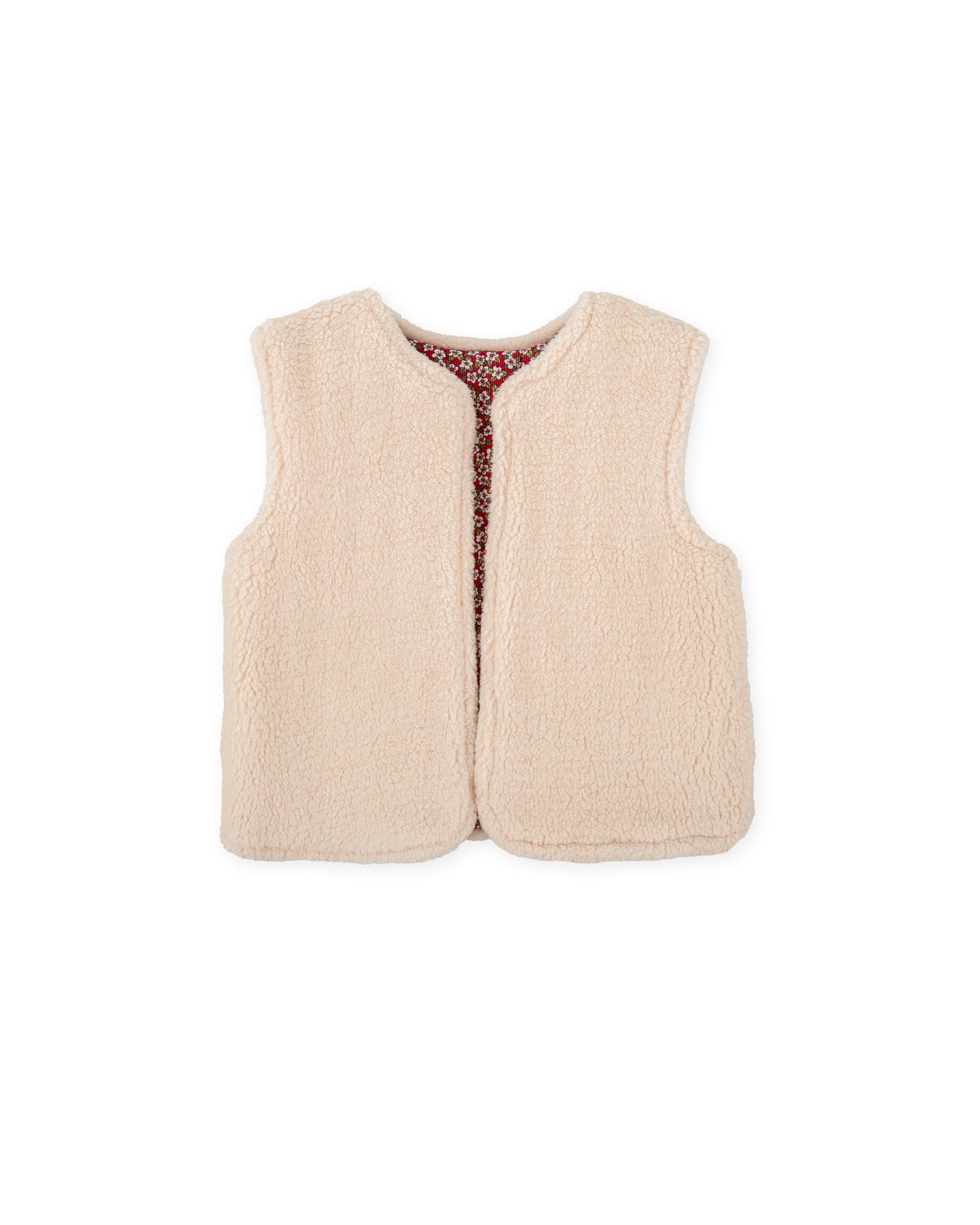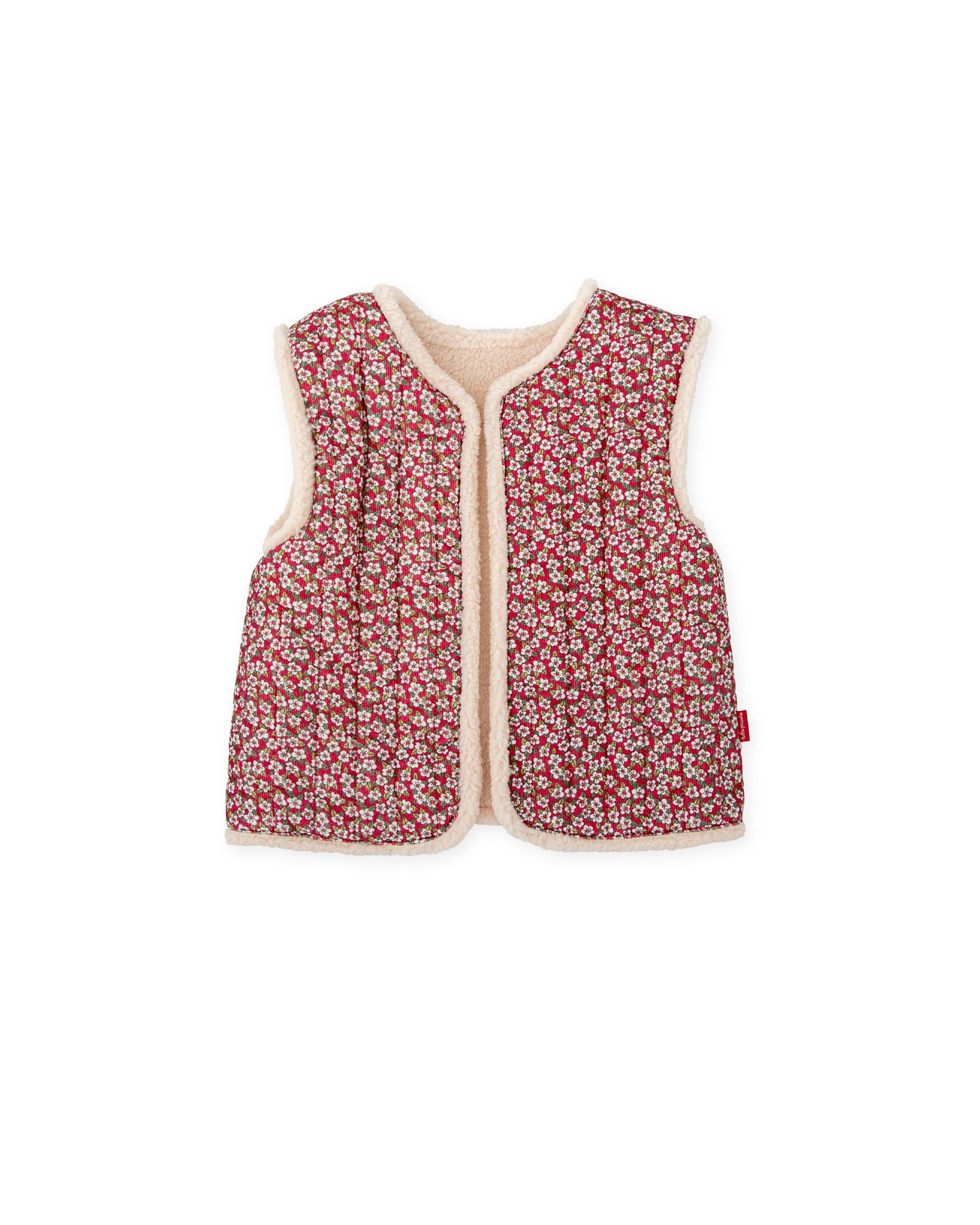 Reversible padded micro-corduroy vest with floral print combined with ecru lamb fabric.