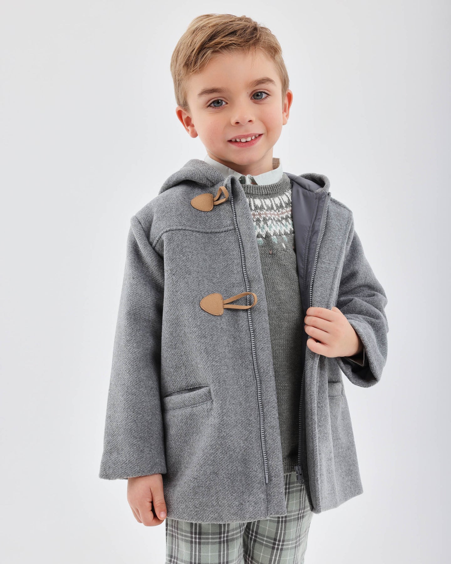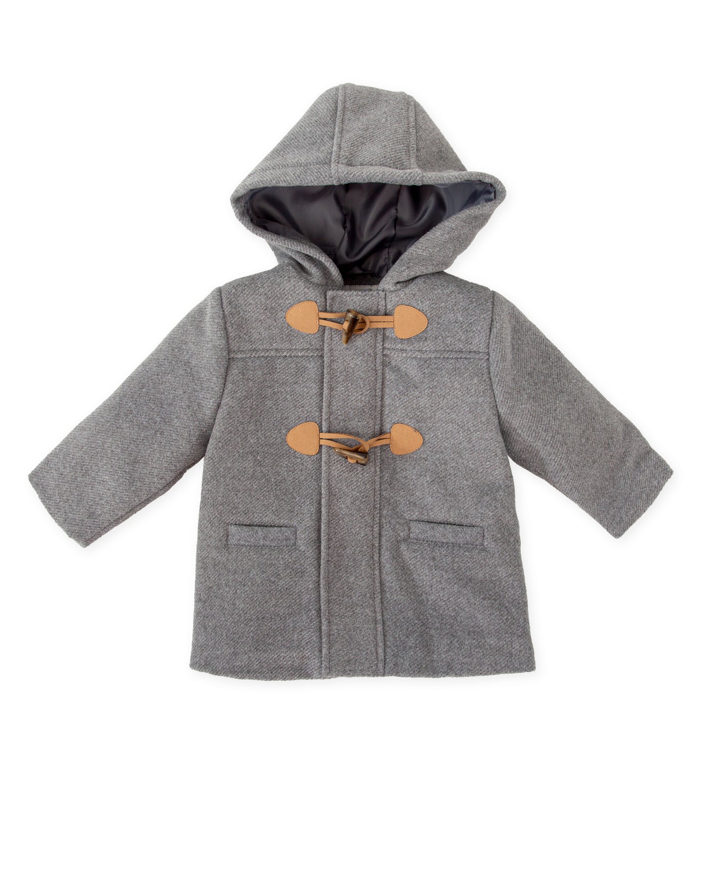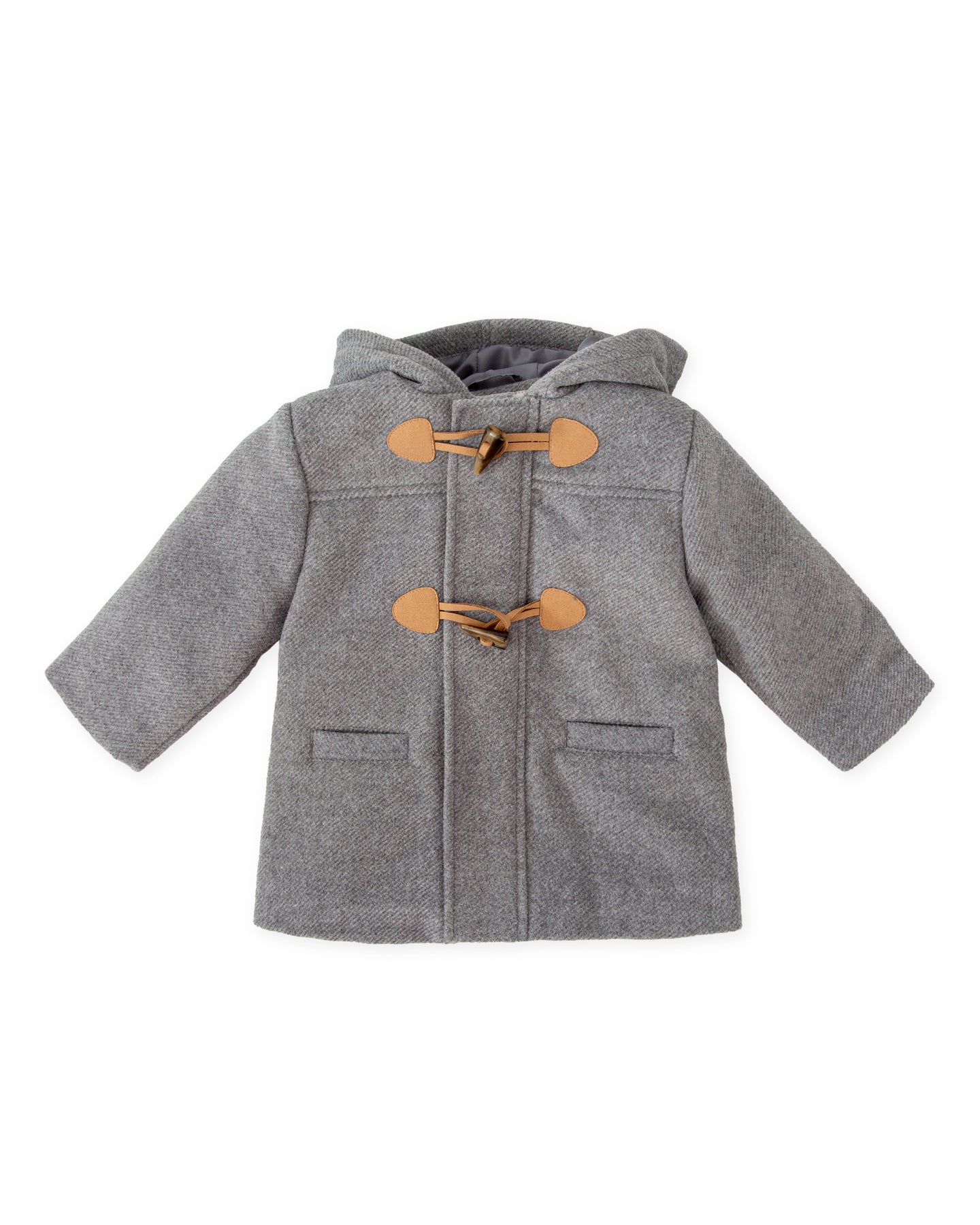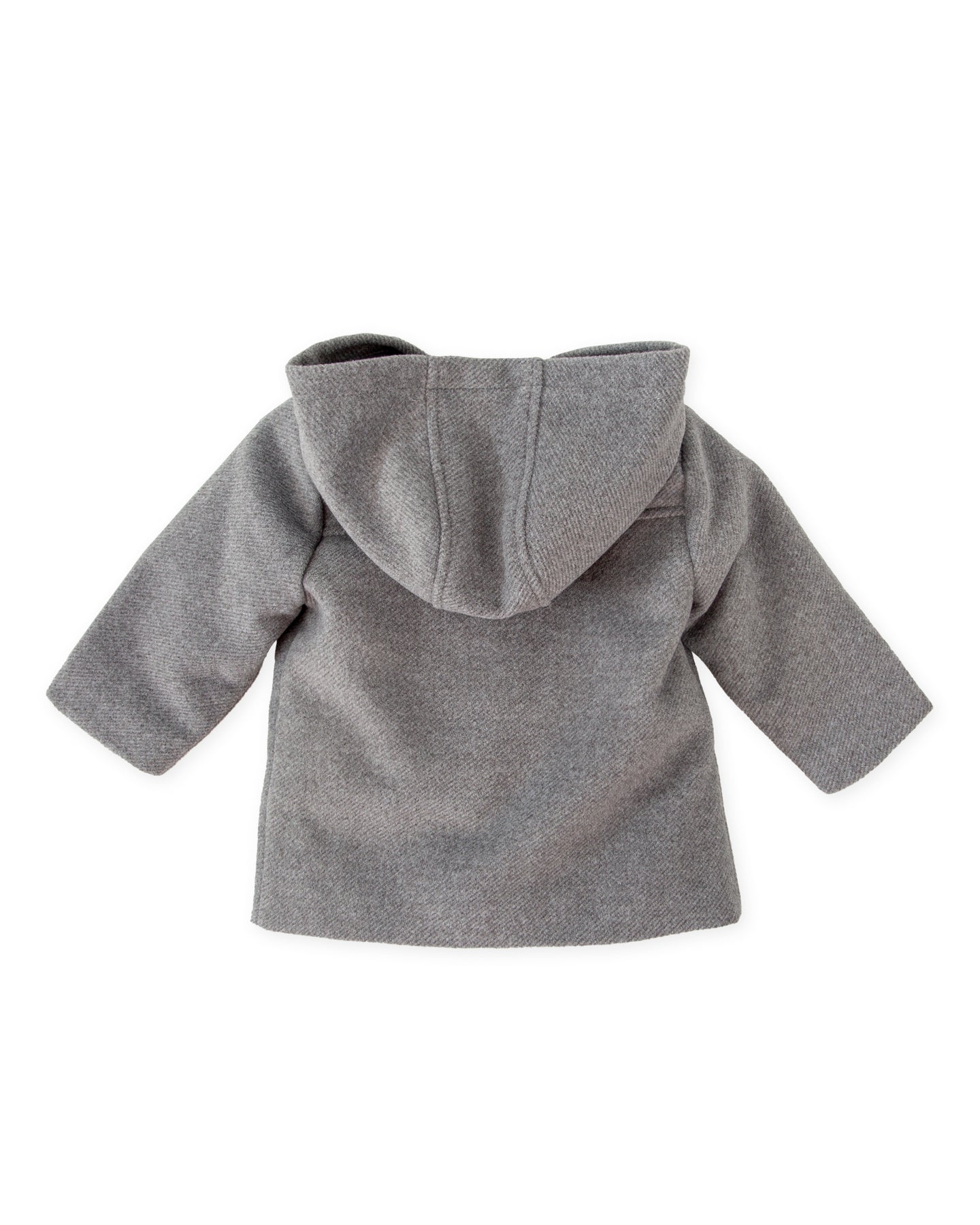 Cloth coat with hood in grey color with soft matching lining. Front pocket detail. Front opening with zipper and toggles.
