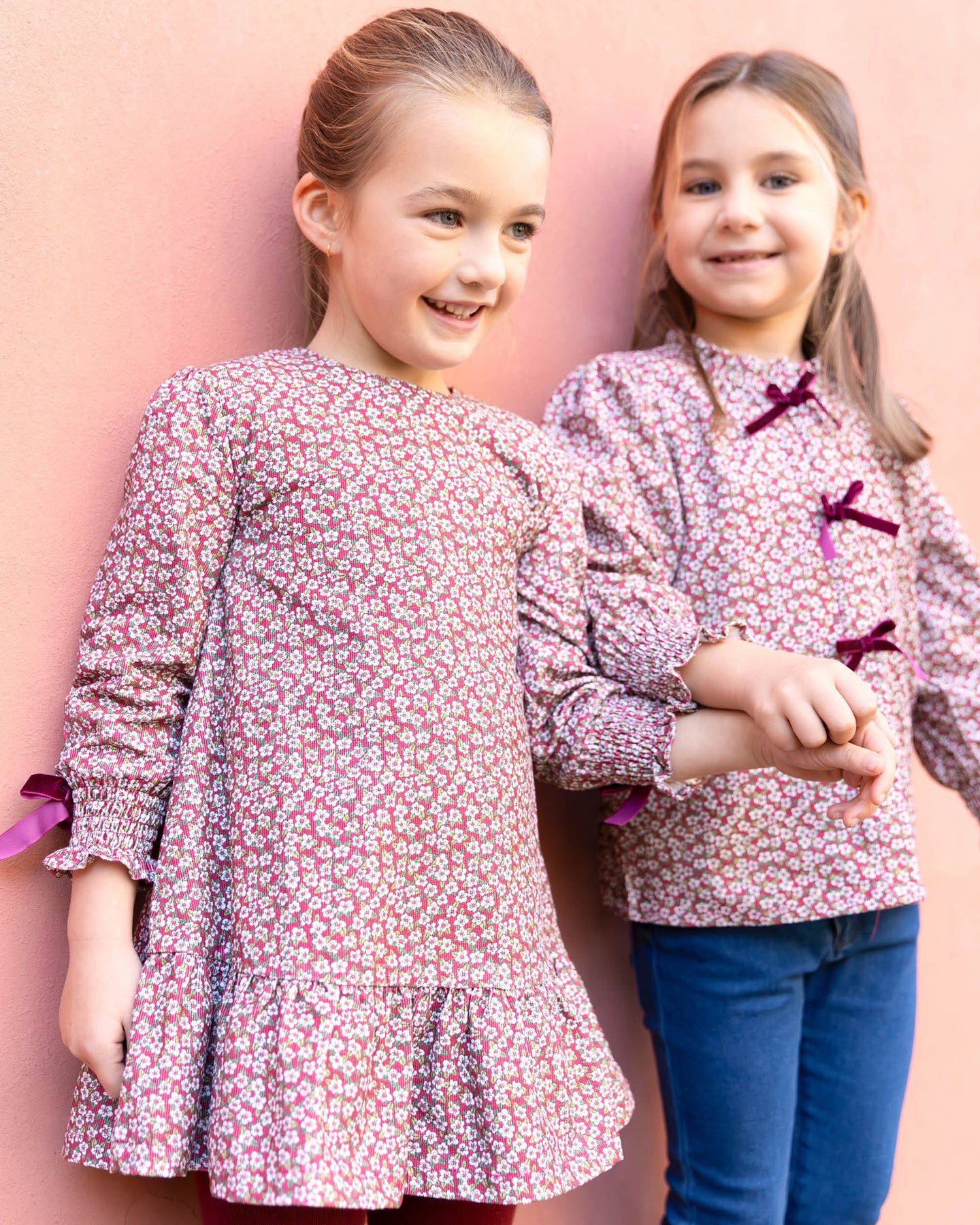Dress in micro corduroy with floral print and elasticated cuffs. Bow detail on sleeves. Back zip fastening. Makes a set with maroon tights.