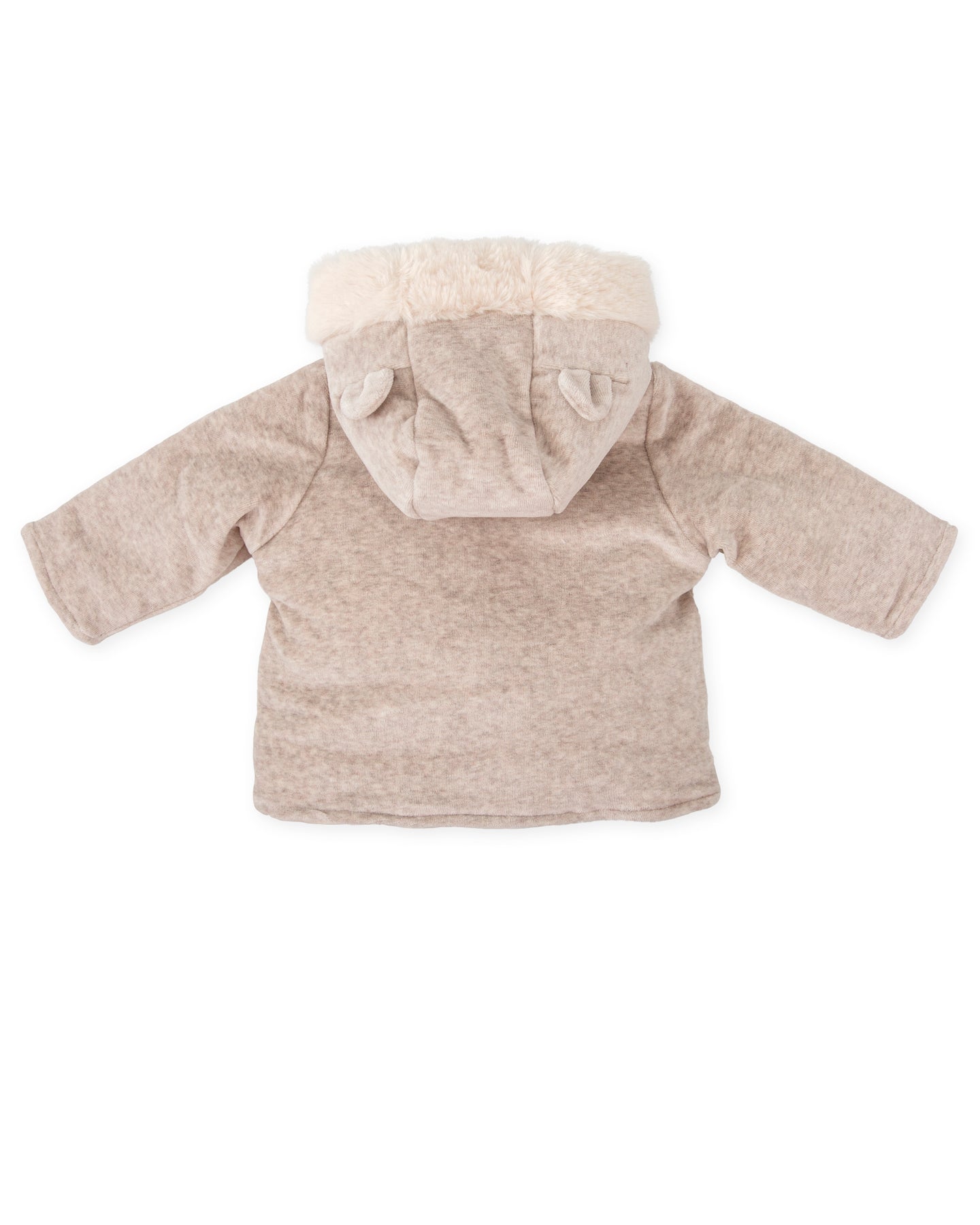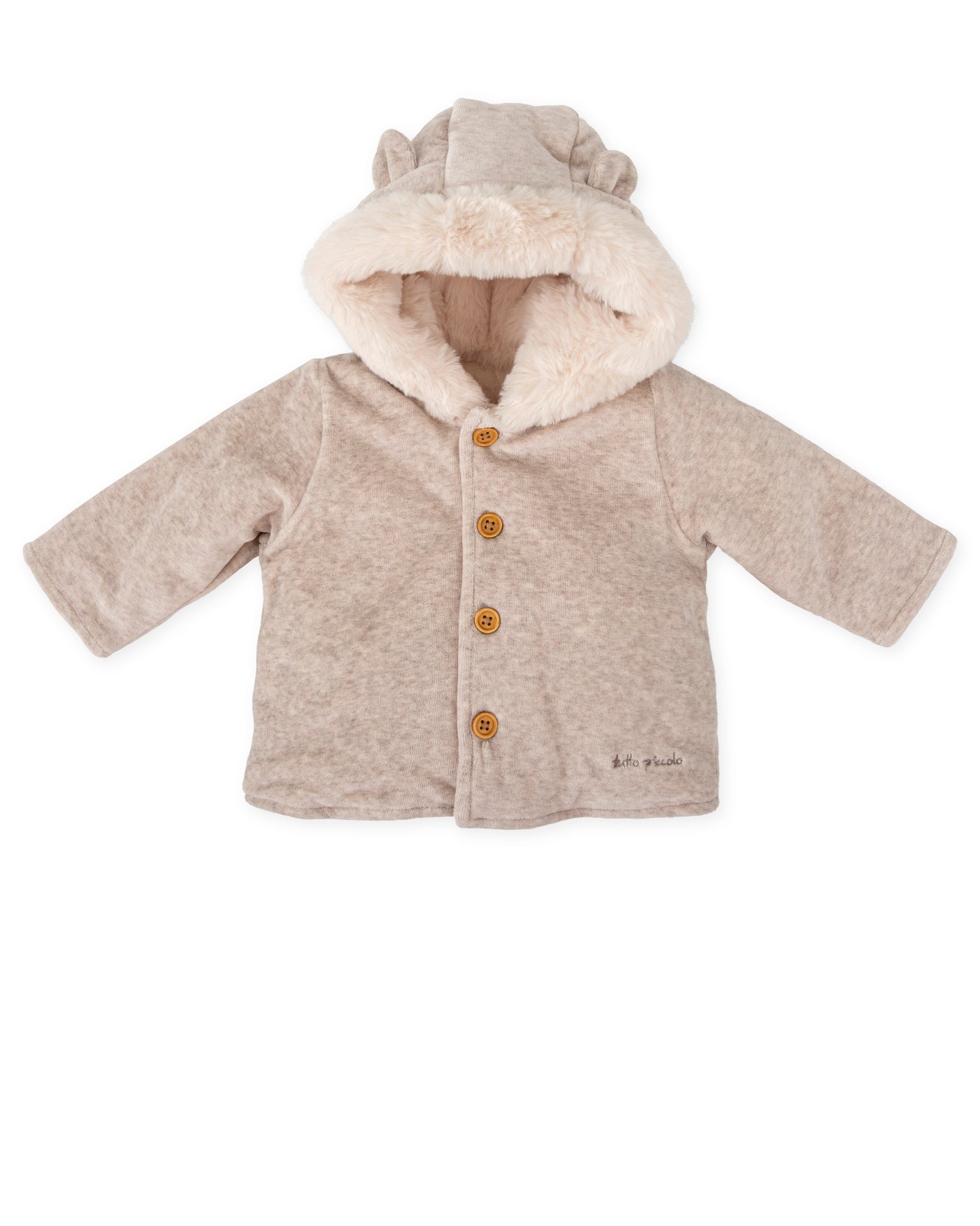 Combed velvet jacket in grey color with soft off-white fur lining. Hood with little ears. Embroidered logo detail. Front opening with buttons.