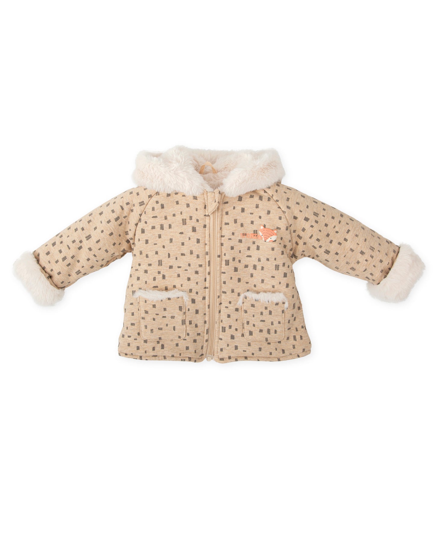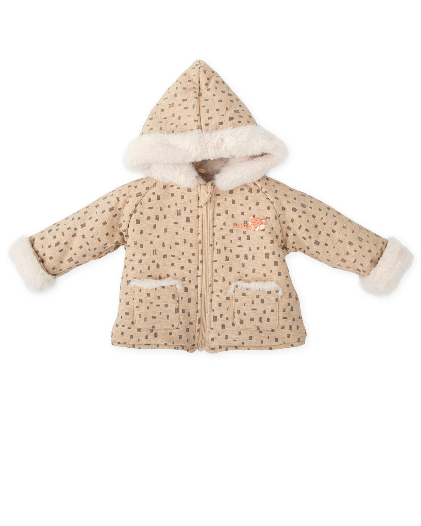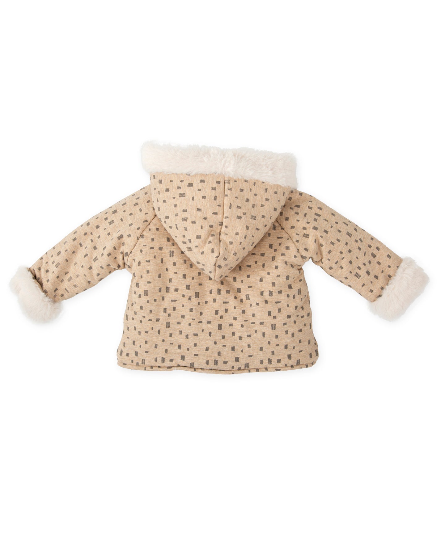 Plush printed jacket in sand color with hood, soft fur lining and padded interior. Front opening with zipper.