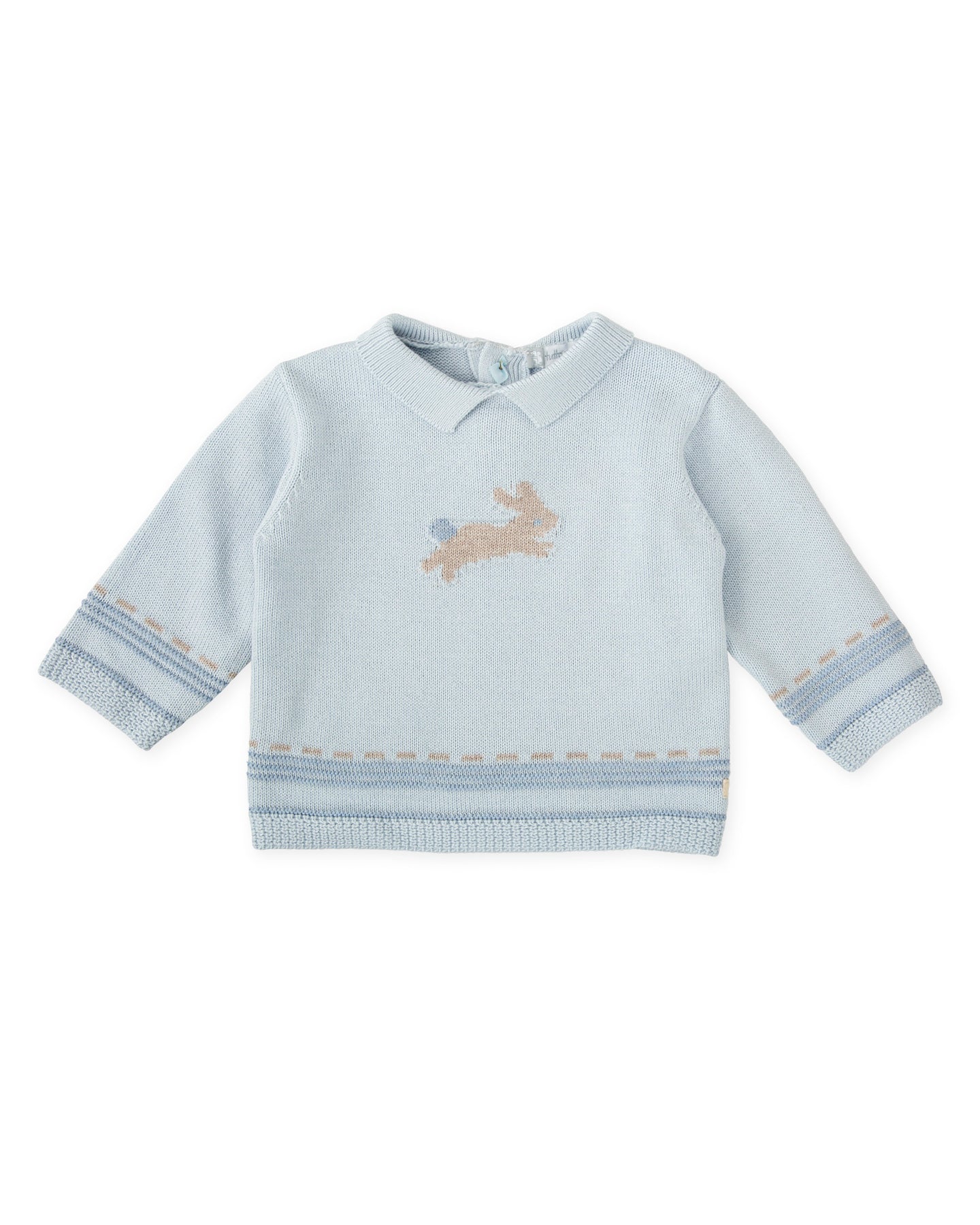 Porcelain-colored knitted jumper with a collar of the same knitting, bunny decoration. Back opening with buttons.