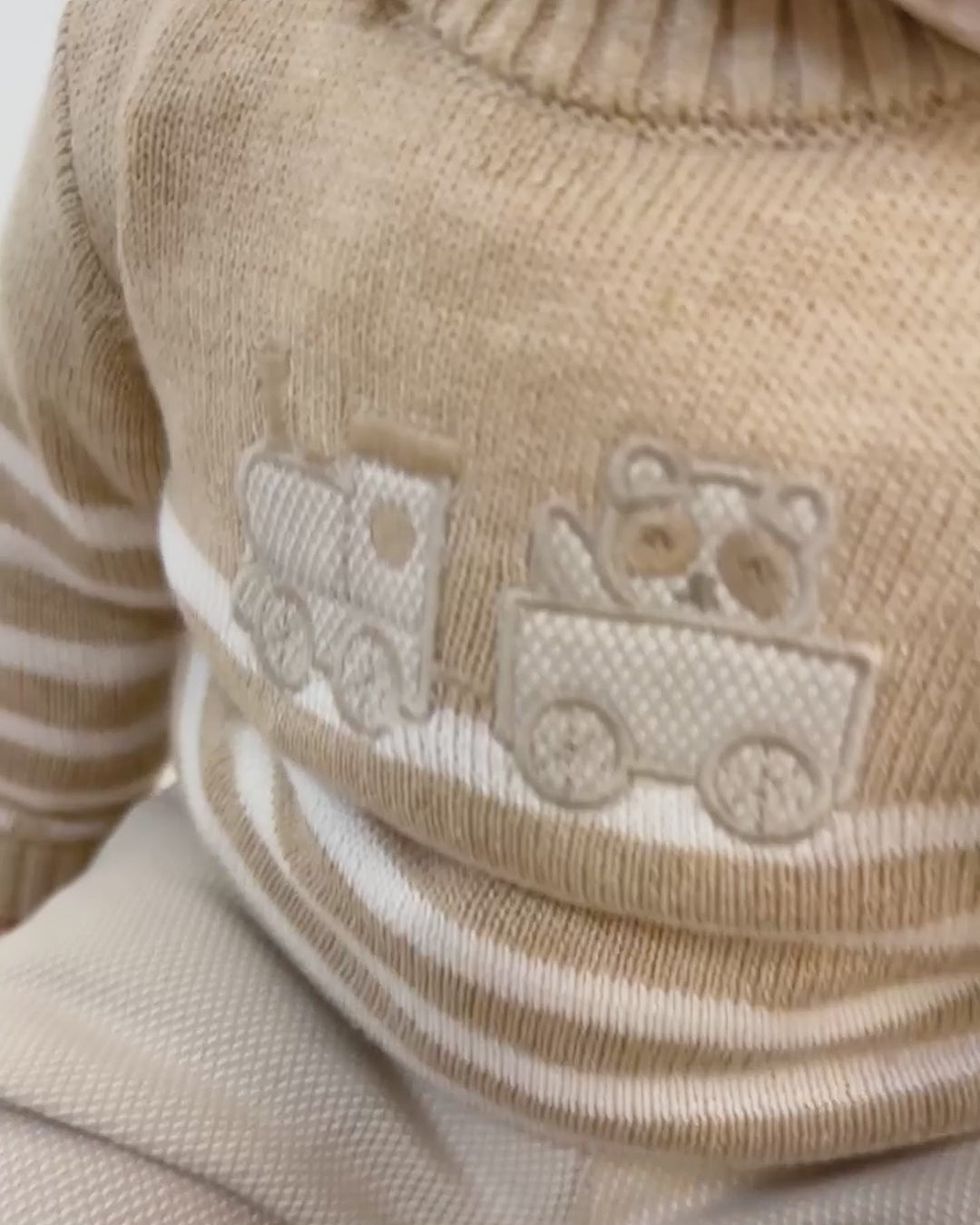 Knitteds sand jumper with off-white stripes. Embroidered train detail. Shoulder opening with buttons.