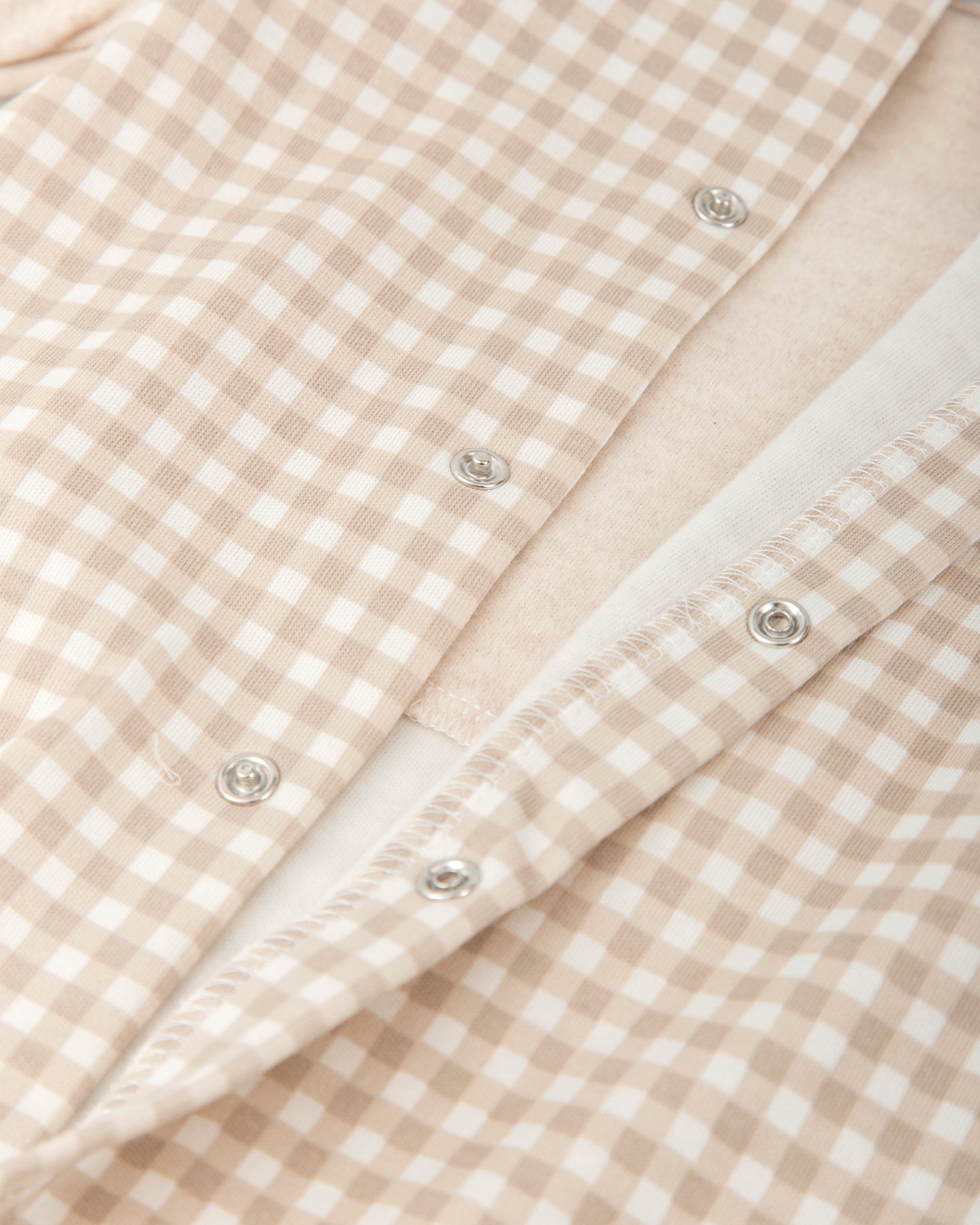 Long romper without feet combined in smooth sand-colored interlock and simulated bib in checkered interlock, cuffs with elastic and back and crotch opening with snap buttons.