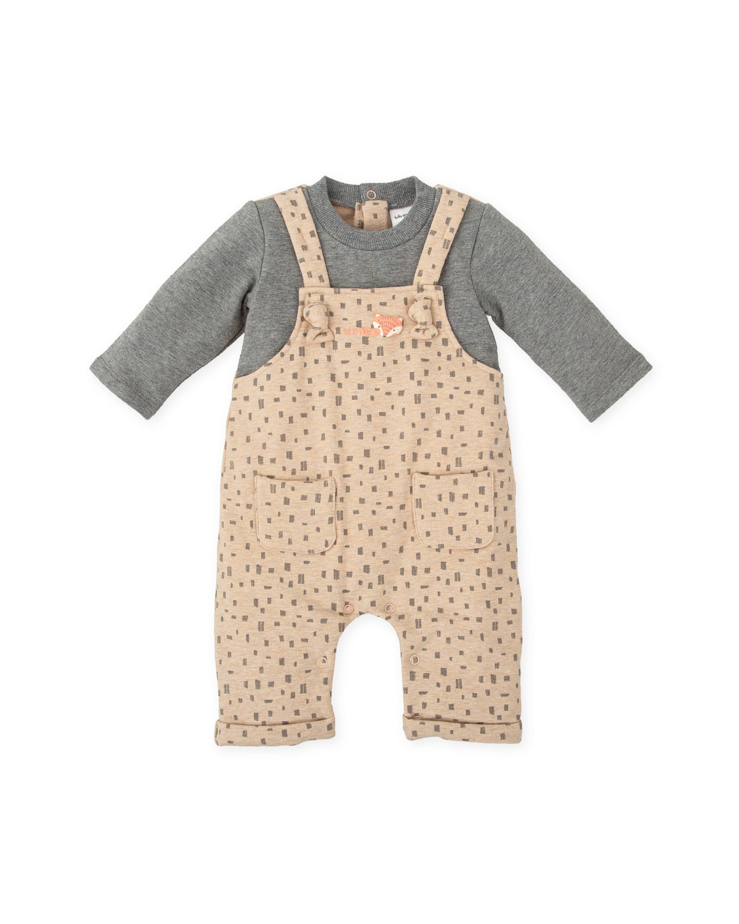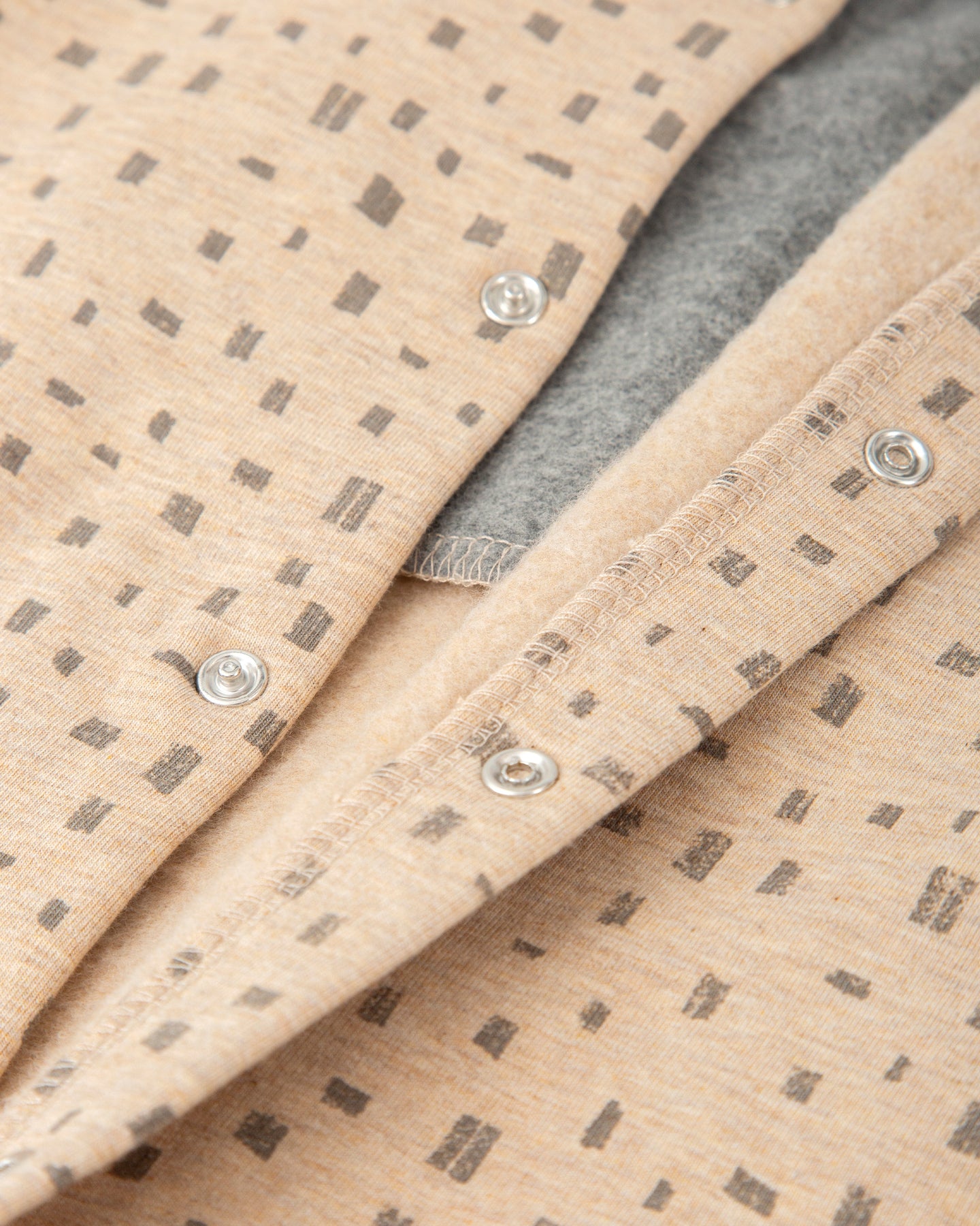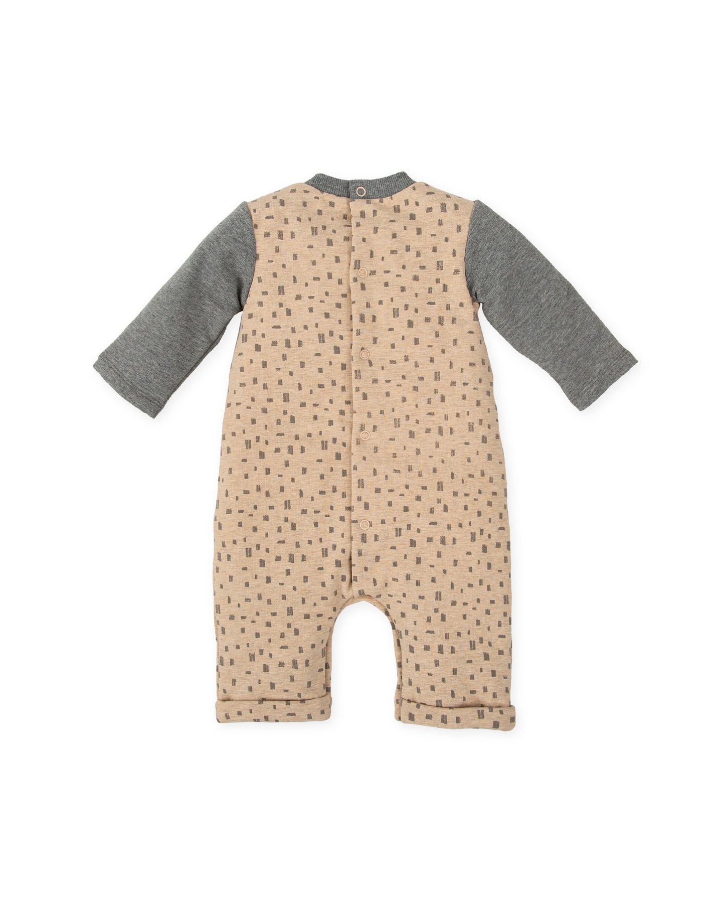 Anthracite-coloured fleece romper combined with sand-coloured printed fleece. Pocket detail and front embroidery. Popper fastening at the back and crotch.