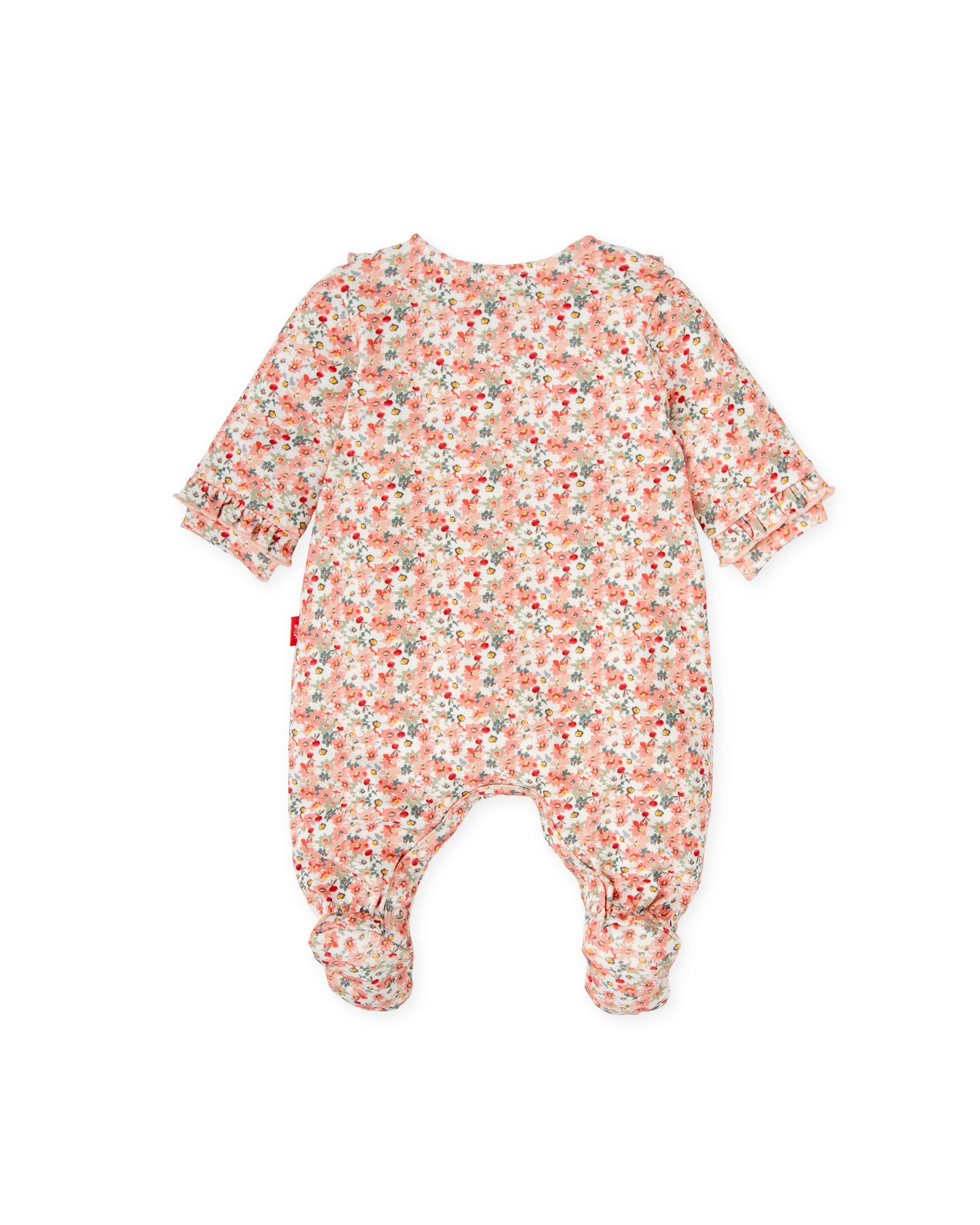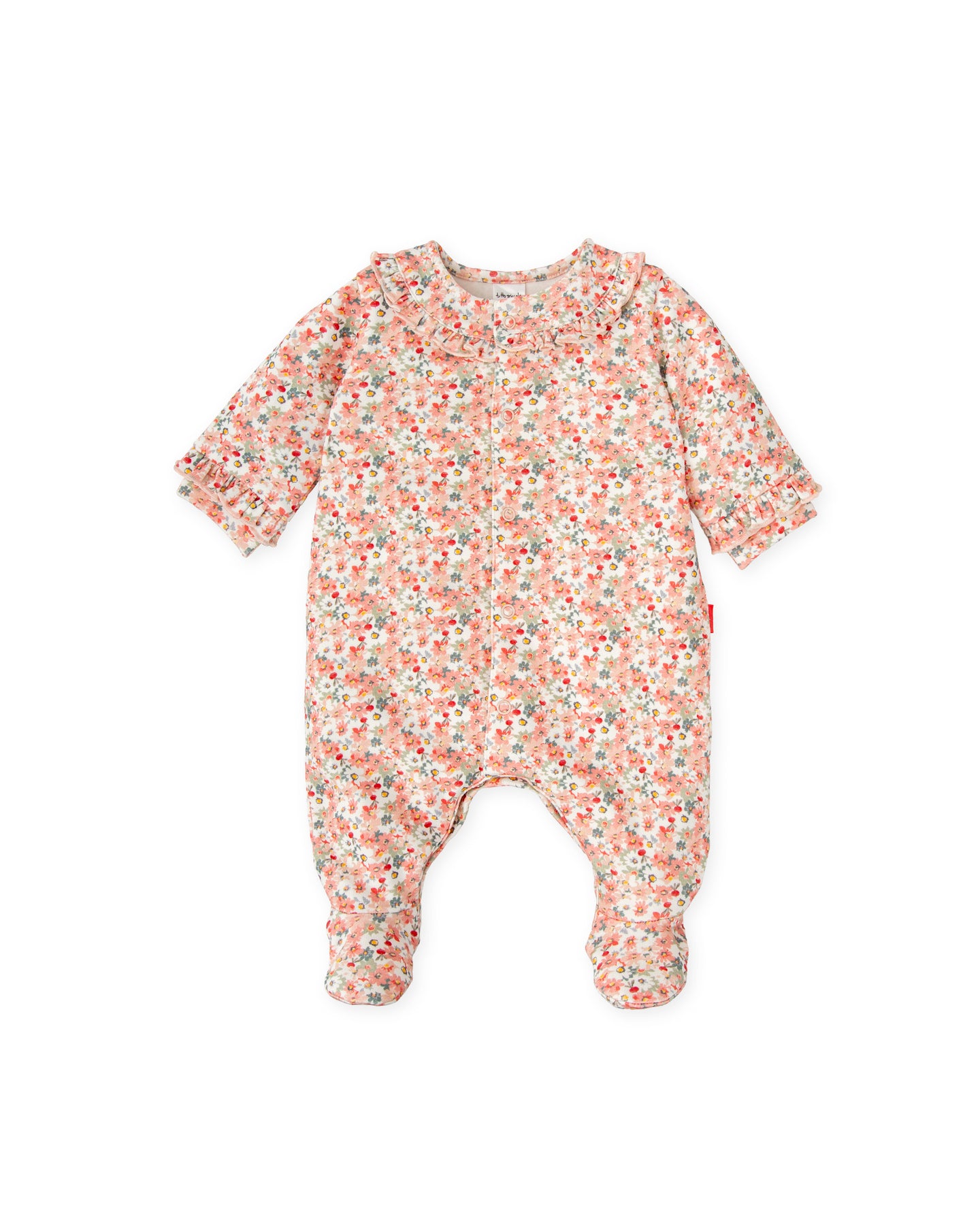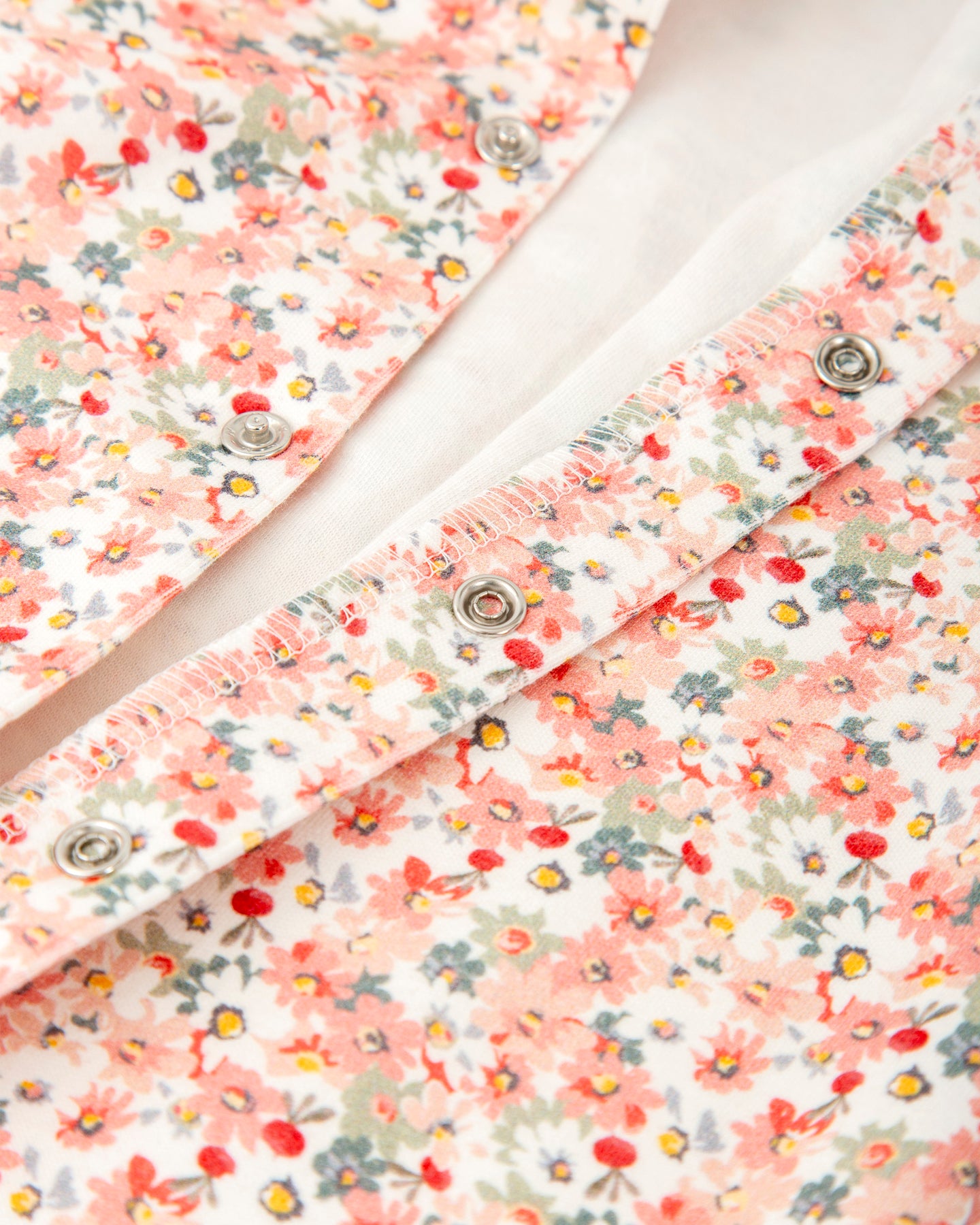 Long interlock romper with floral print, front opening and snap fasteners at the crotch, ruffle detail at the neckline and cuffs.