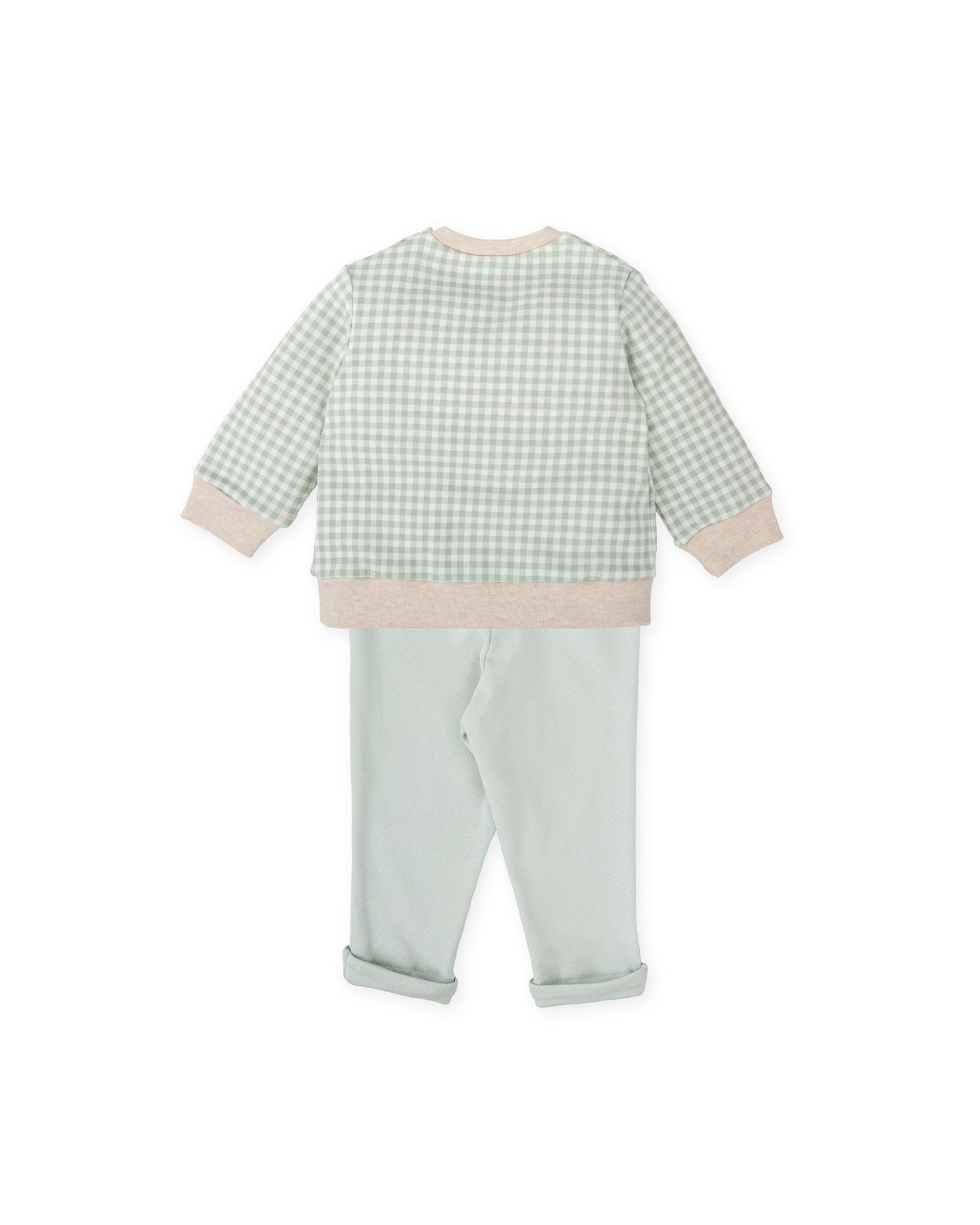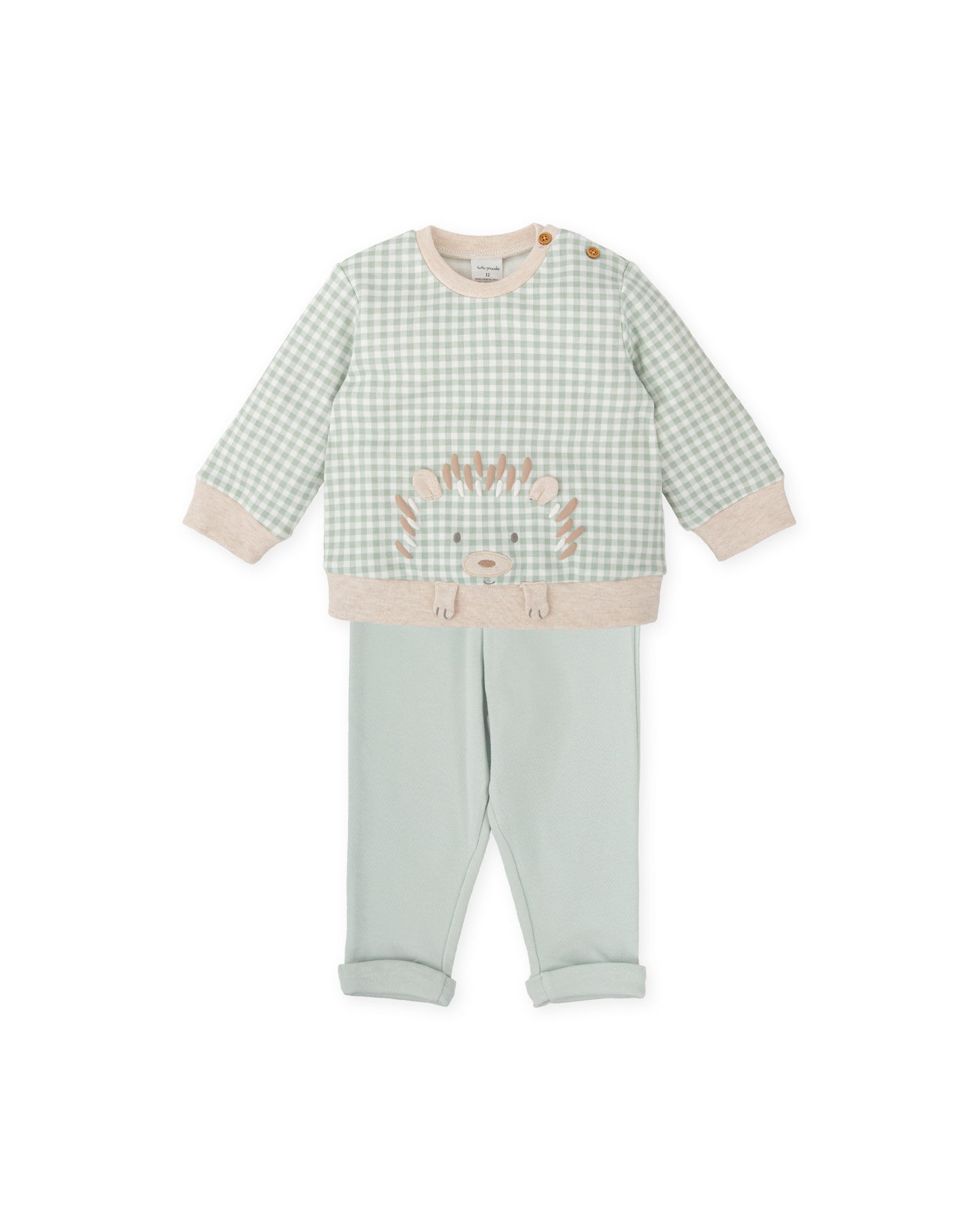 Set consisting of a checked interlock T-shirt with sand-coloured details, open shoulder in all sizes with buttons. Hedgehog print and embroidery decoration. Green interlock trousers with elasticated waistband and turn-ups at the bottom.