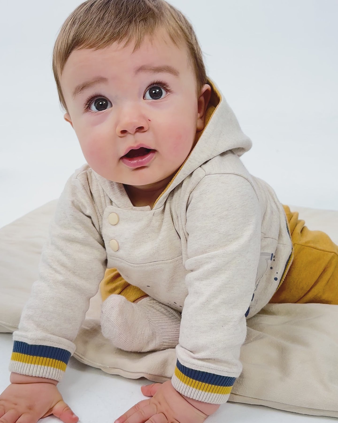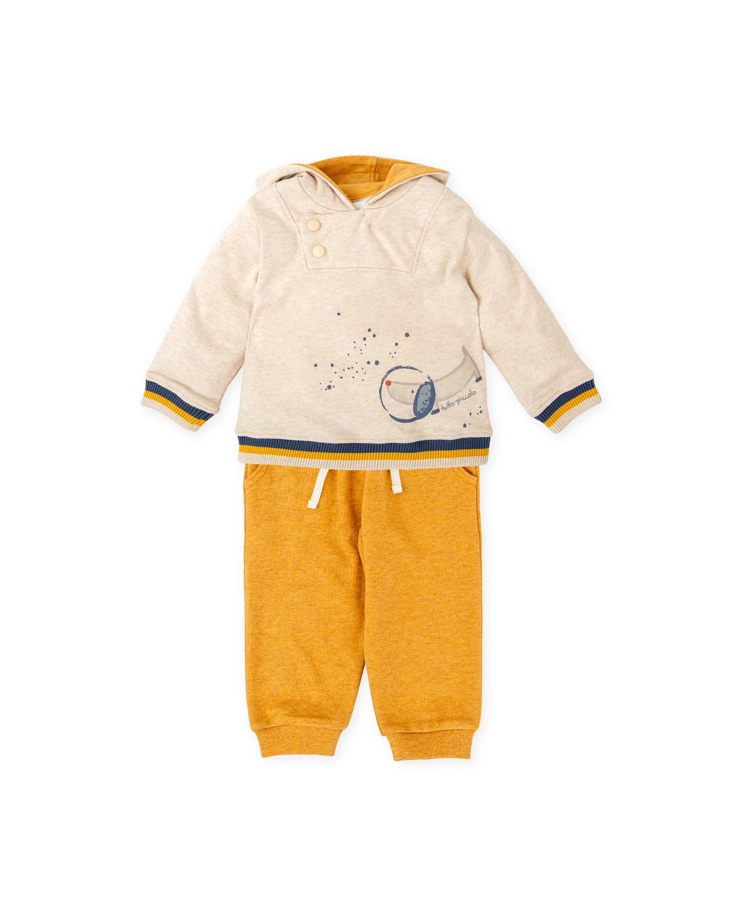 Two-piece set without feet in ecru and mustard interlock with a melange effect. Hooded sweatshirt. Ribbed cuffs and hem. Dog detail with printed logo. Trousers with soft elasticated waistband and ribbed hem.