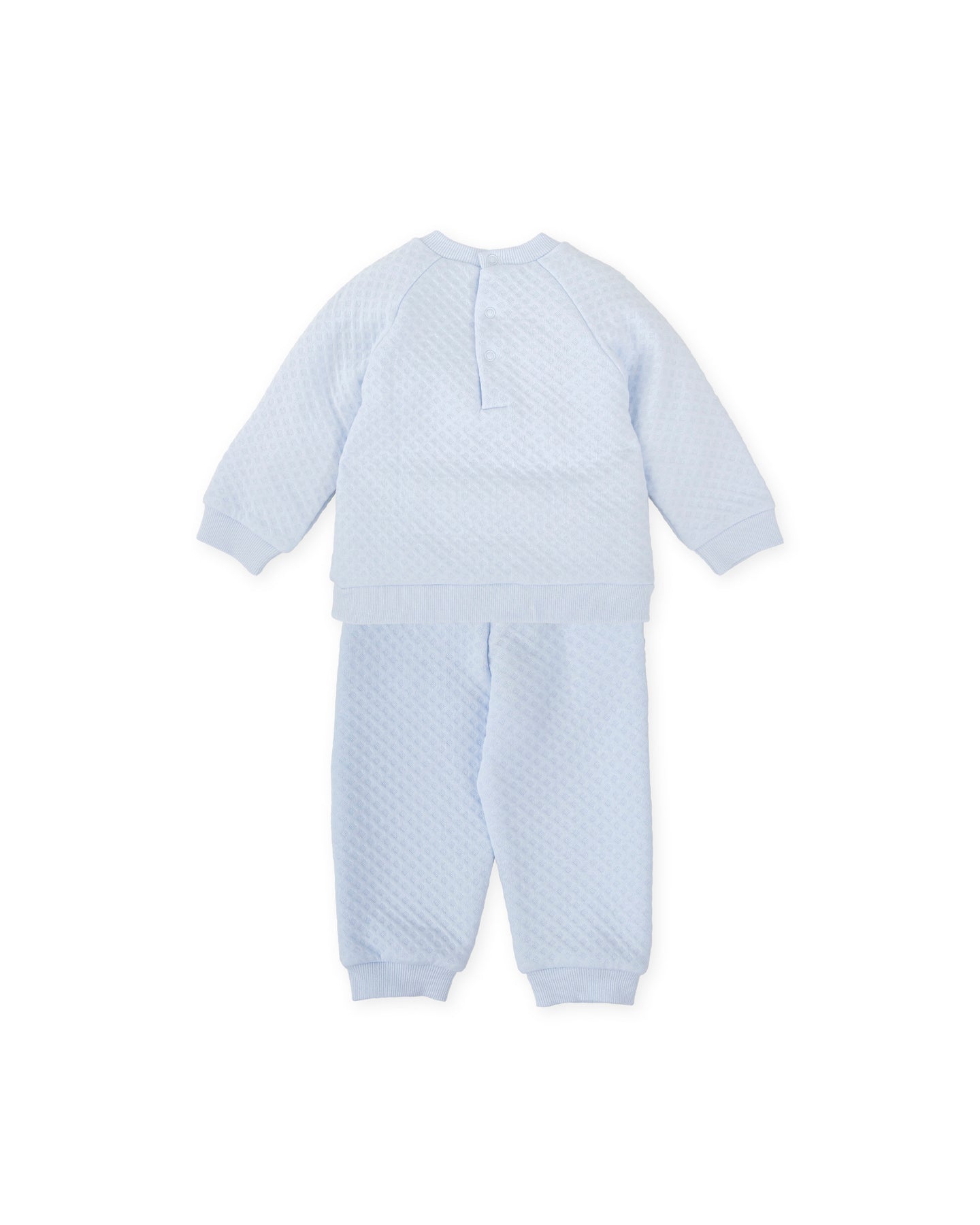 Two-pieces set without feet, light blue quilted interlock T-shirt with collar, hem and cuffs in soft ribbing, logo print decoration. Trousers in the same fabric with ribbing at the hem and waist, side pockets.