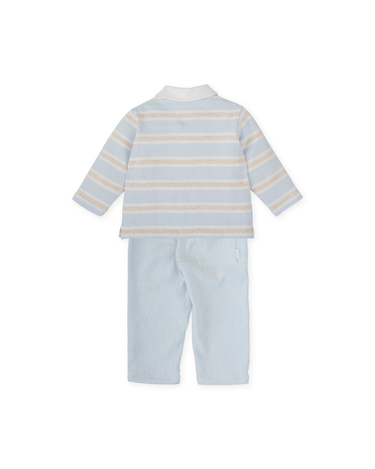 Light blue and sand-coloured striped interlock polo shirt set combined with light blue micro corduroy. Embossed logo detail. Front opening with buttons. Trousers with adjustable waist and button.