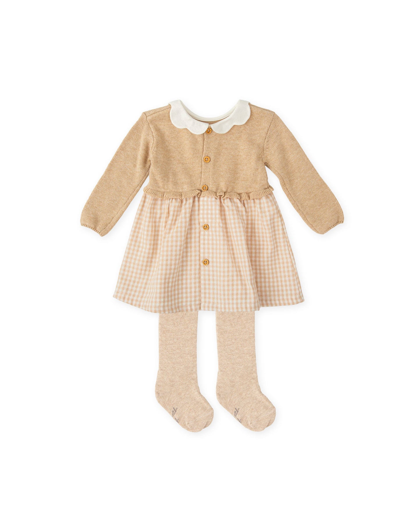 Abito con corpetto in maglia color sabbia abbinato a gonna in velluto a quadretti vichy tono su tono. Collo a onde in velluto bianco sporco. Apertura posteriore con bottoni. Si abbina a calze color sabbia.