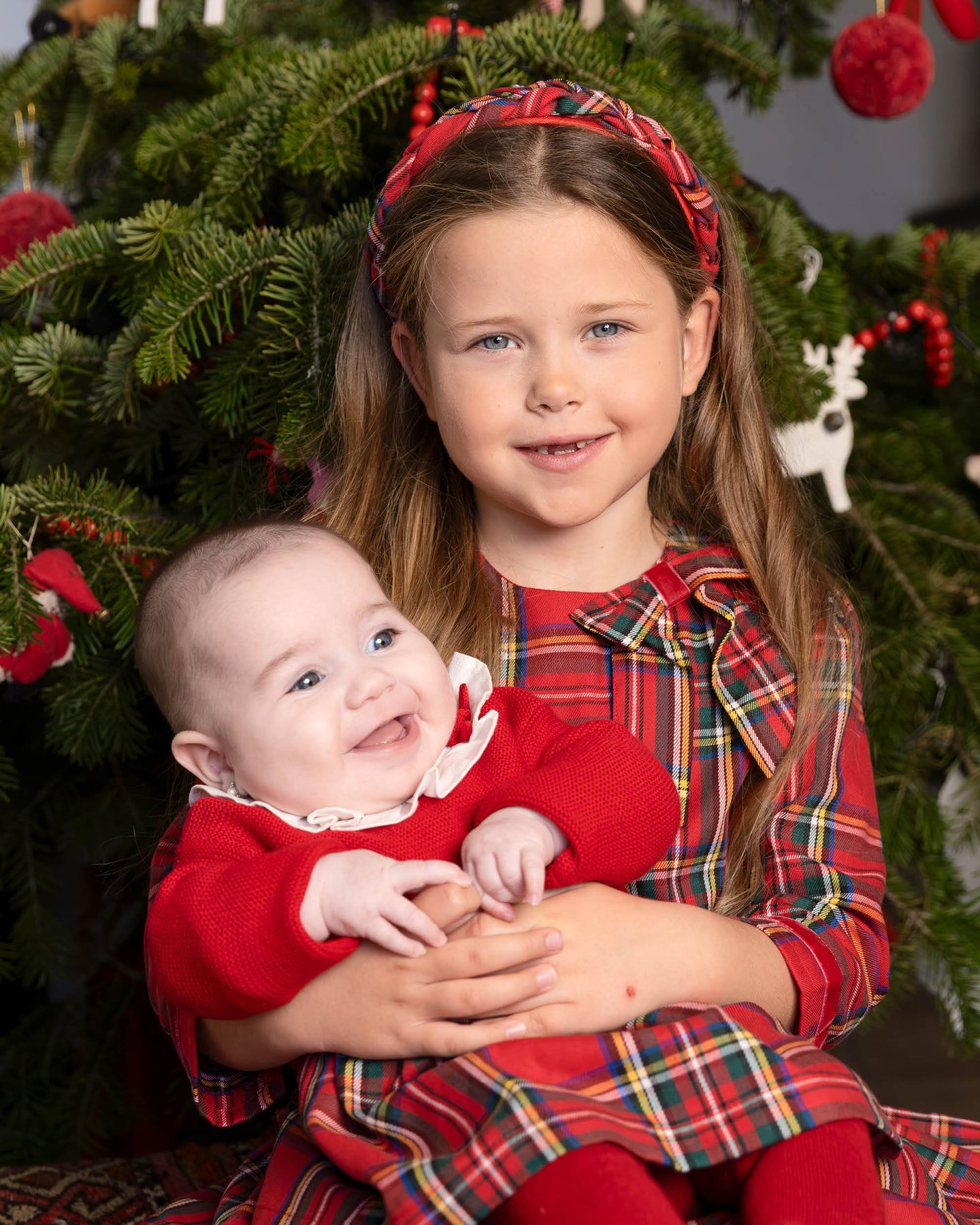 Abito combinato in maglia e viyella a quadri rossi, decorazione con fiocco sul davanti e apertura posteriore con bottoni. Abbinabile a collant rossi.