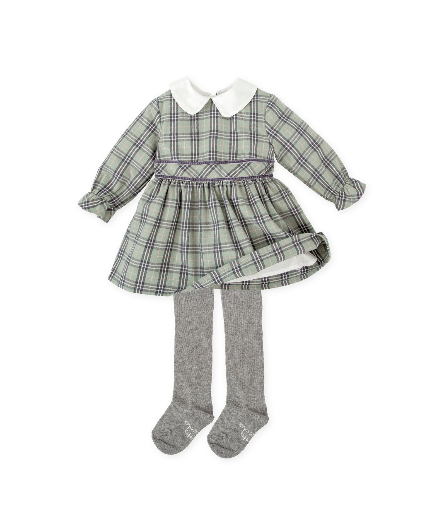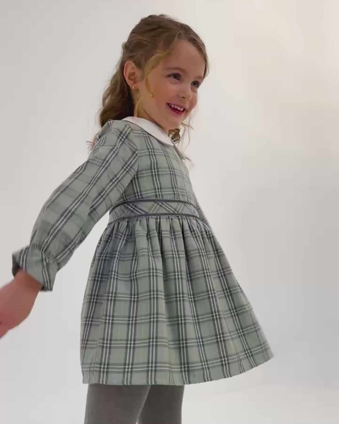 Abito in flanella a quadri nei toni del verde e del grigio. Collo in viyella bianco sporco. Morbido elastico ai polsini. Apertura posteriore con cerniera. Abbinabile a una calzamaglia grigia.