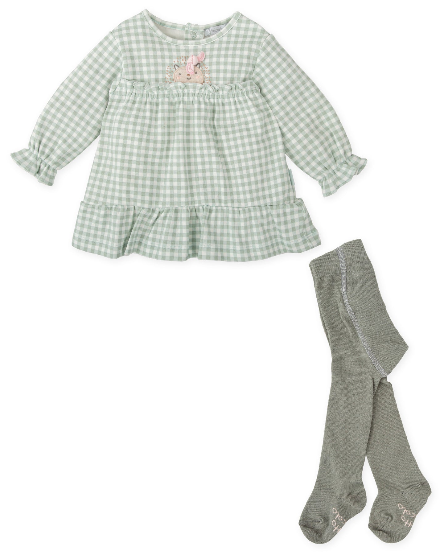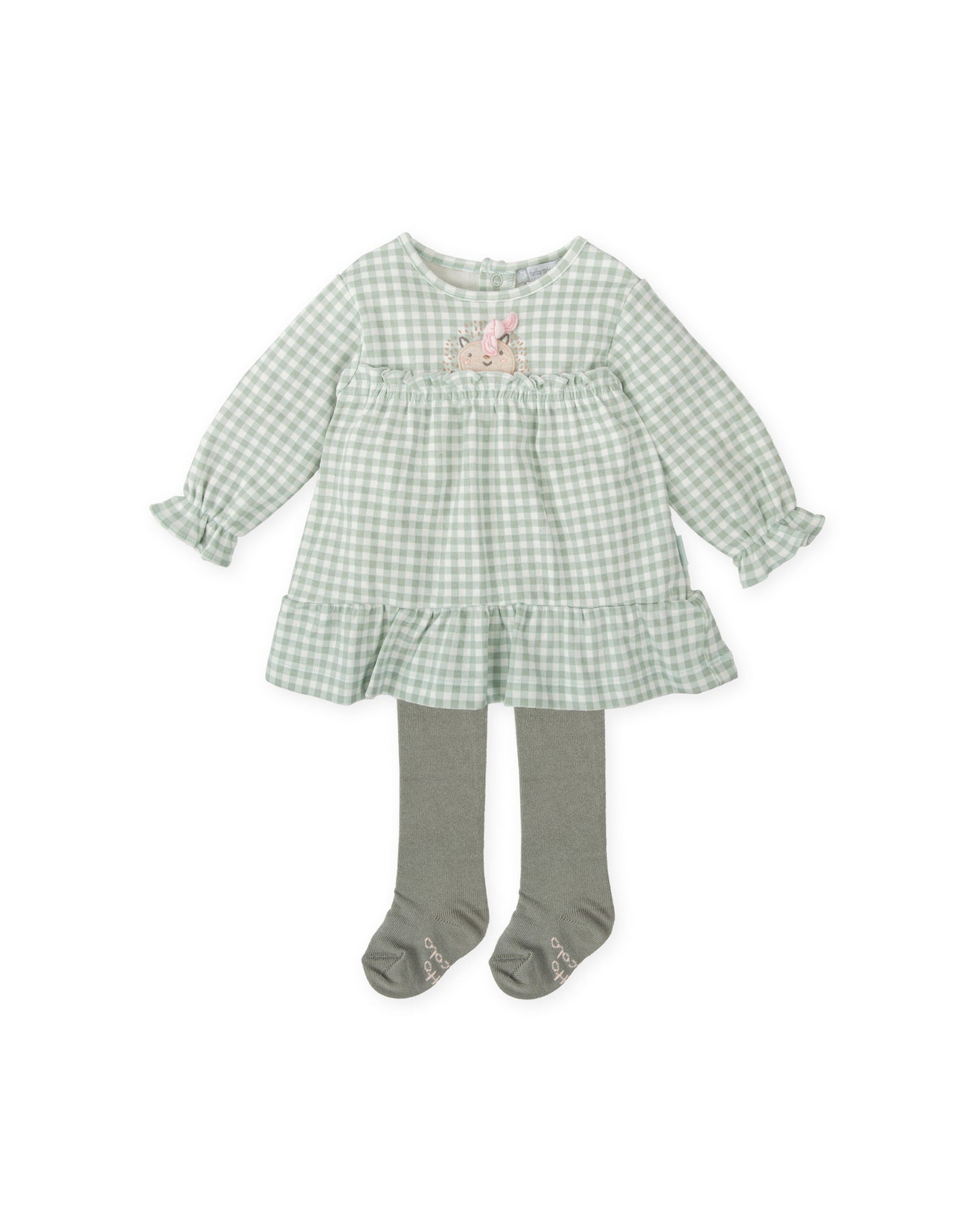 Abito in interlock stampato a quadretti con volant nella parte inferiore e elastico ai polsini, apertura posteriore con bottoni a pressione. Si abbina a collant di colore verde.