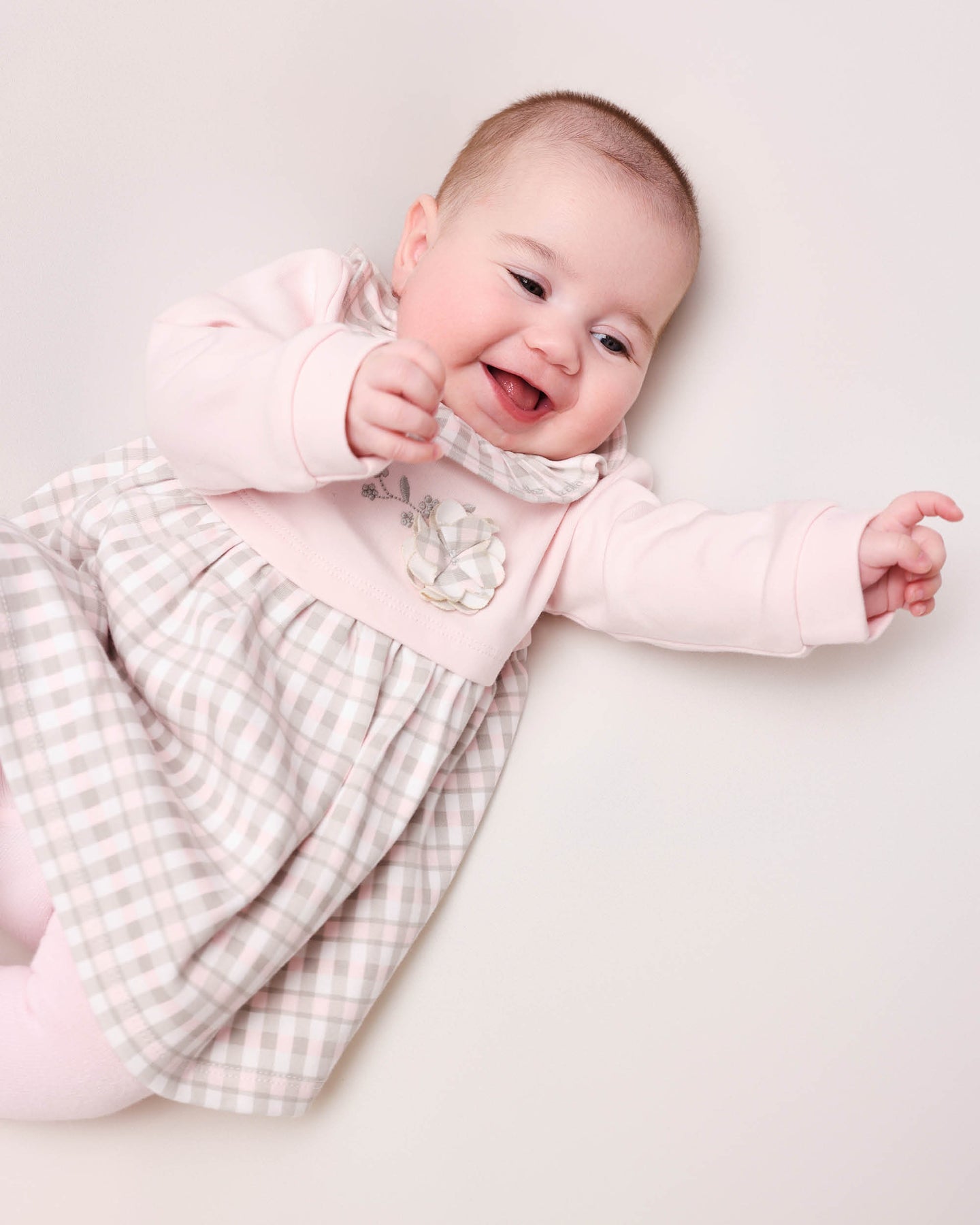 Abito combinato in interlock rosa e stampa a quadri, volant sul collo, decorazione floreale e ricamo, apertura posteriore con bottoni a pressione. Abbinabile a collant rosa.