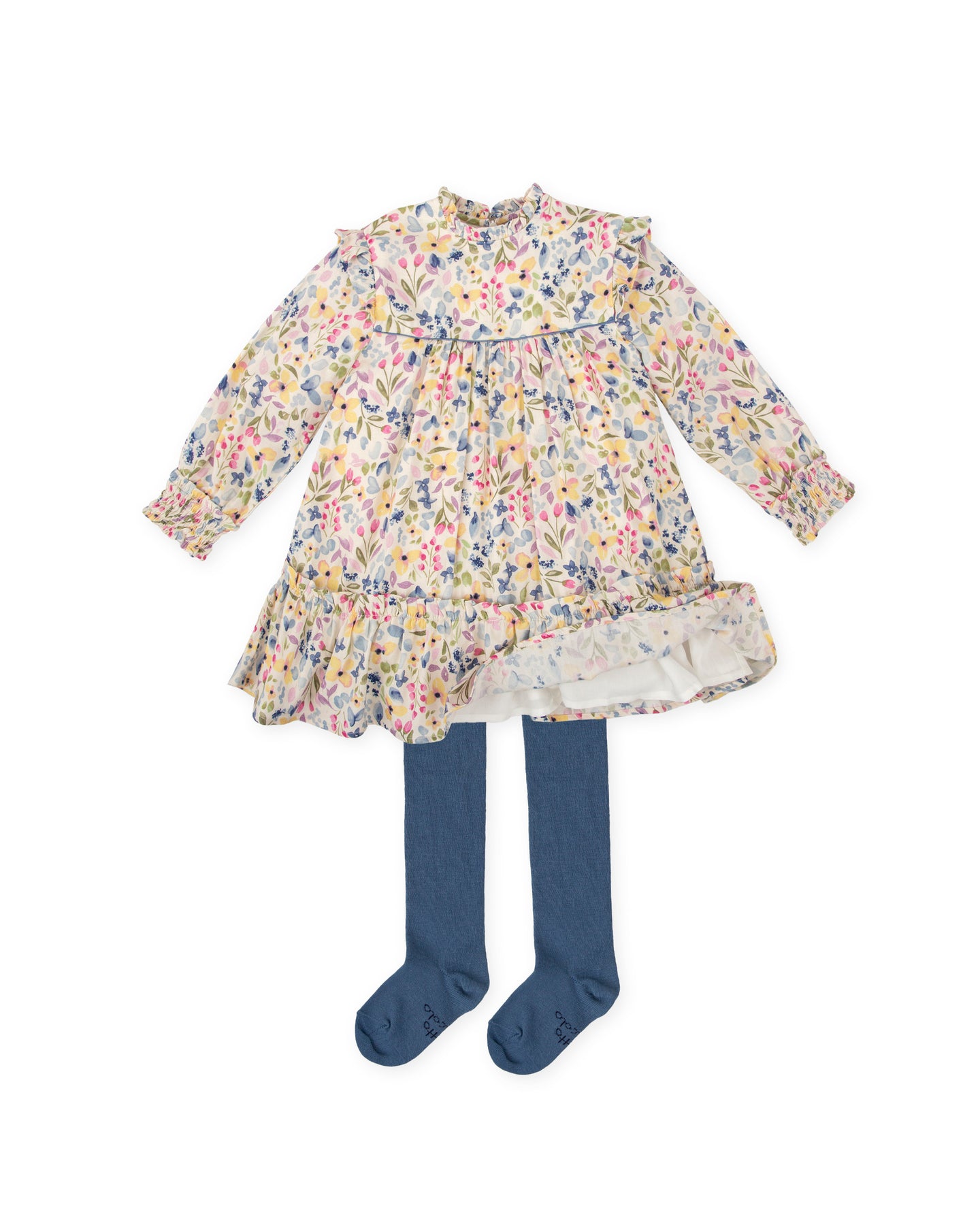 Abito in tessuto viyella stampato a fiori di colore viola con morbida fodera in voile. Apertura posteriore con cerniera. Abbinalo a collant di colore blu.