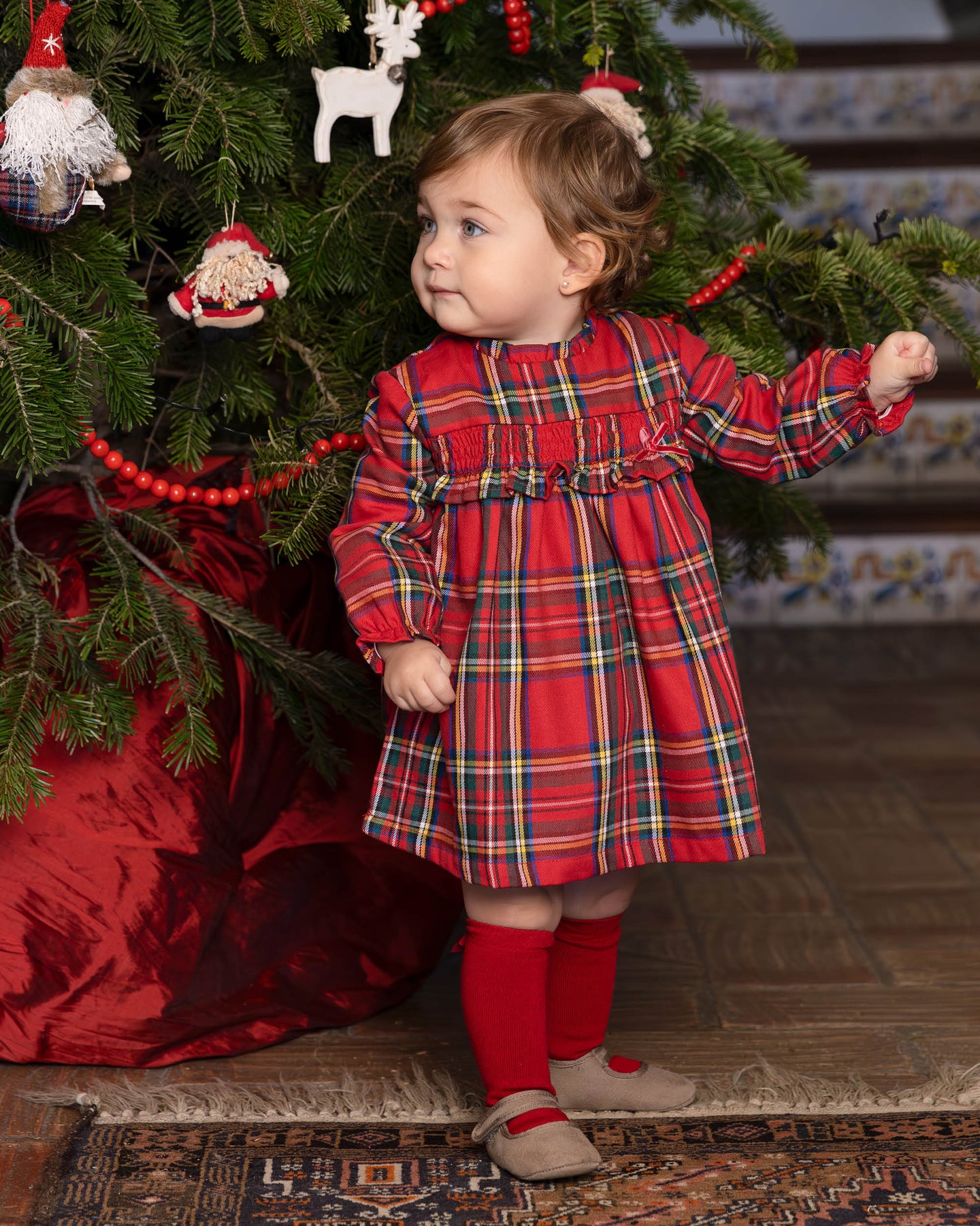 Abito con mutandine in viyella a quadri rossi. Apertura posteriore con cerniera invisibile. Foderato in morbido voile rosso. Mutandine dello stesso tessuto con morbido elastico su cosce e vita. Abbinabile a calzini rossi.