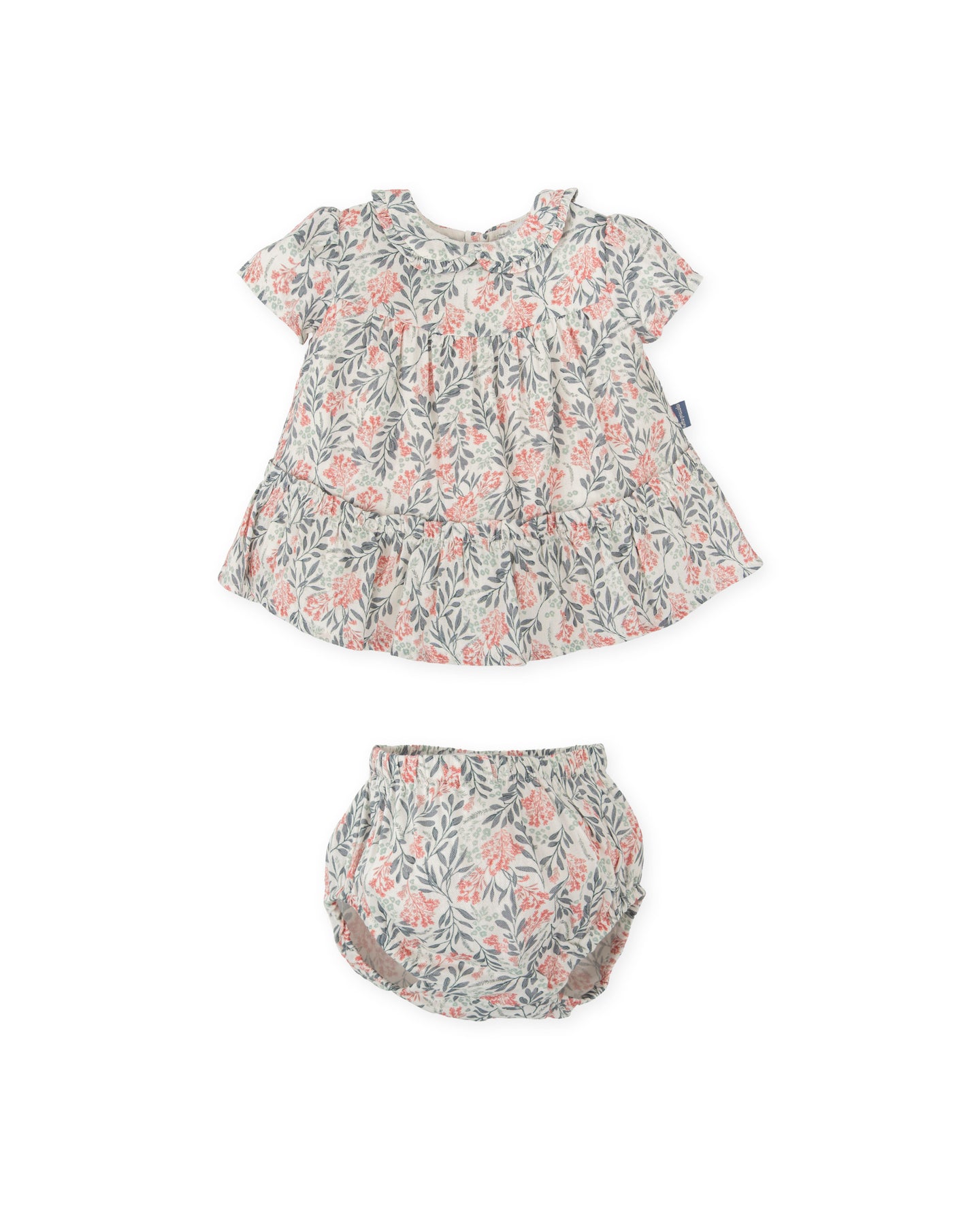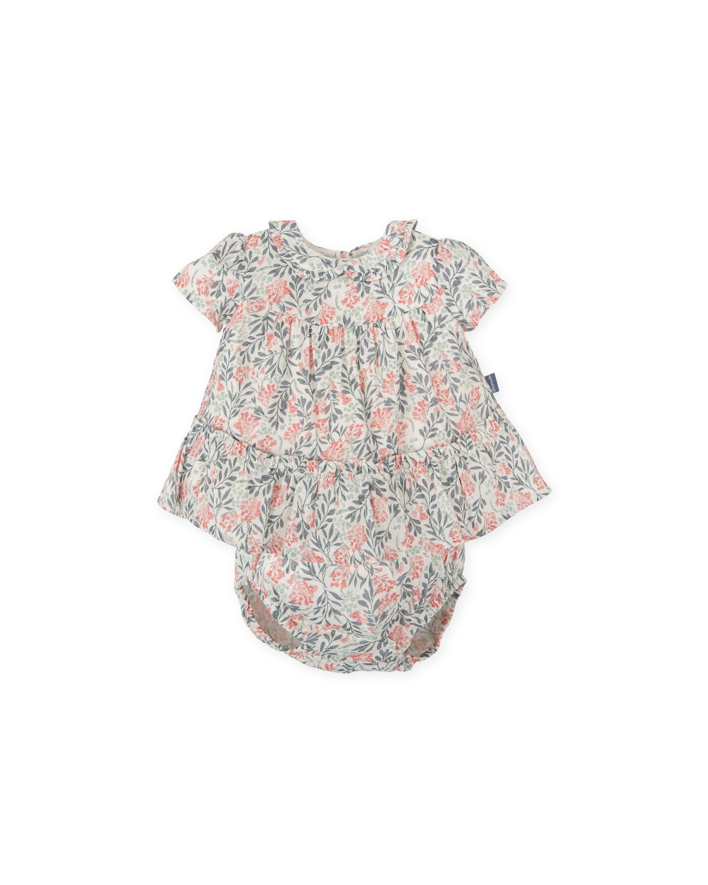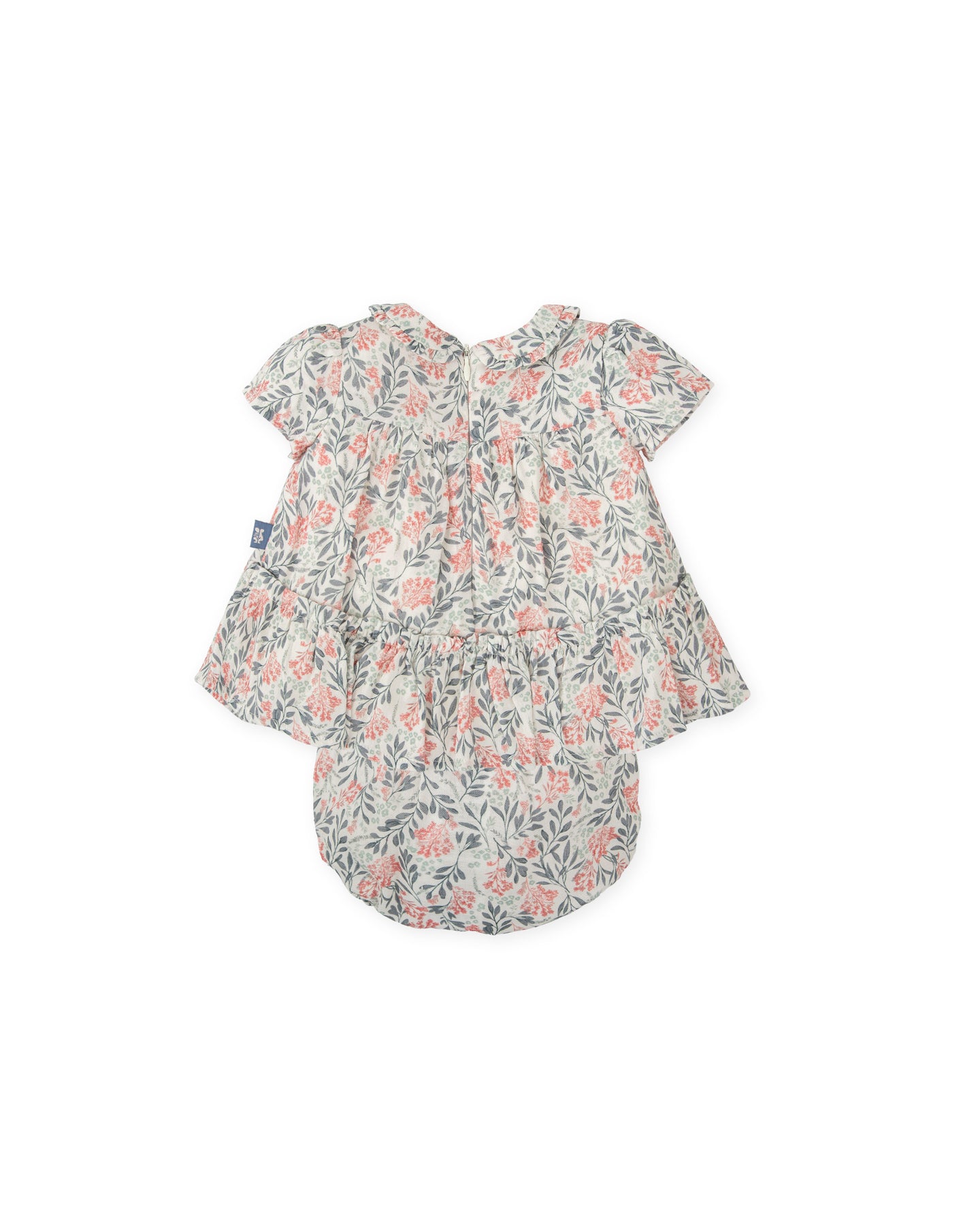 Abito con mutandine in viyella stampata a fiorellini con morbida fodera. Dettaglio volant sull'orlo. Apertura posteriore con cerniera. Mutandine con morbido elastico in vita e sulle cosce.