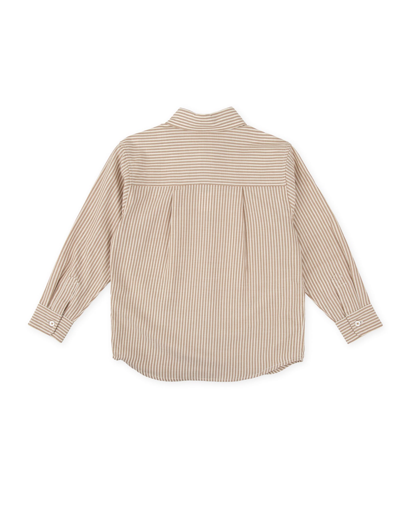 Camicia a maniche lunghe in velluto a coste a righe color sabbia. Dettaglio logo ricamato. Apertura frontale con bottoni.