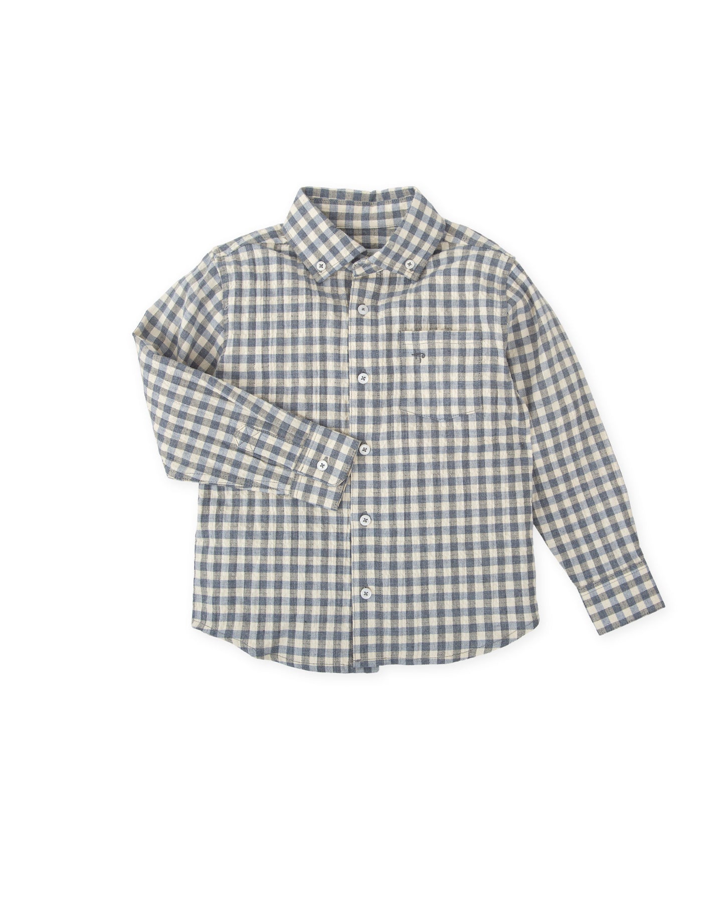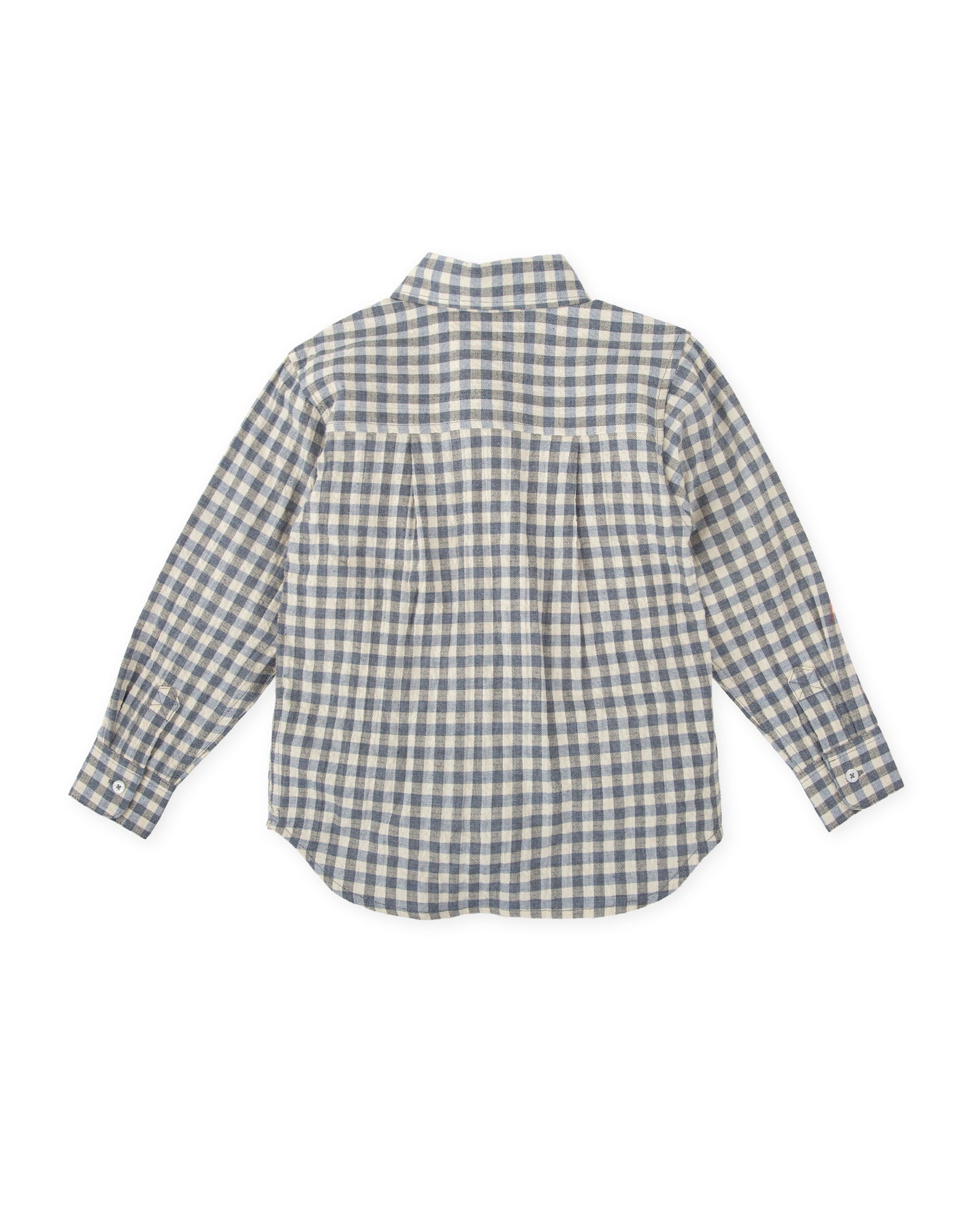 Camicia a maniche lunghe in oxford seersucker colore blu. Tasca frontale e apertura frontale con bottoni.