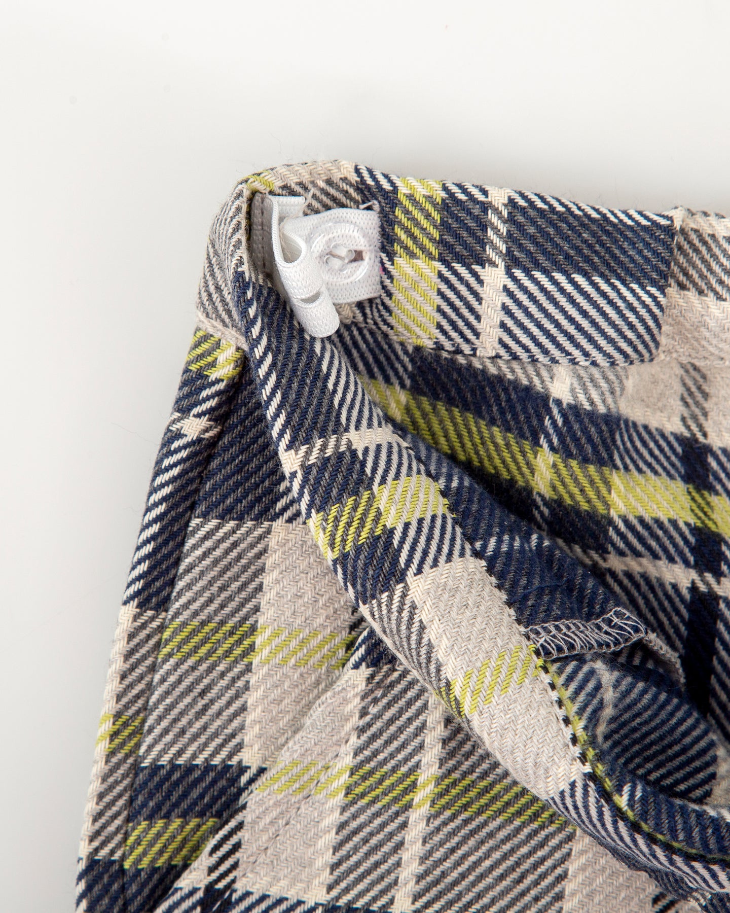 Pantaloncini in flanella a quadri nei toni del blu navy e del verde. Dettaglio risvolto sul fondo. Morbida fascia elastica in vita. Apertura laterale con cerniera. Abbinabili a calzini blu navy.