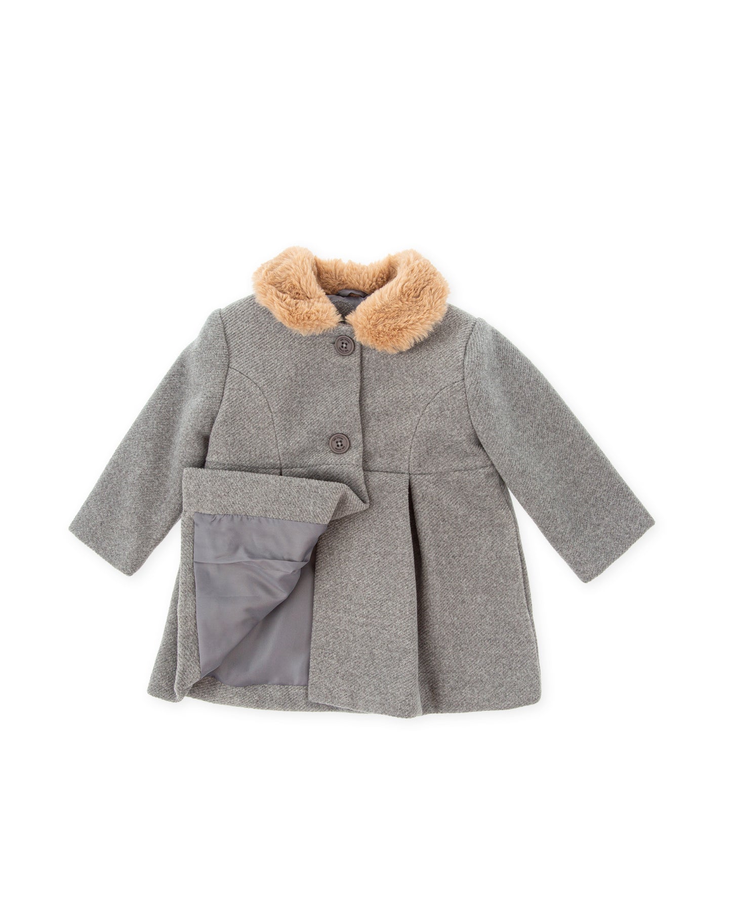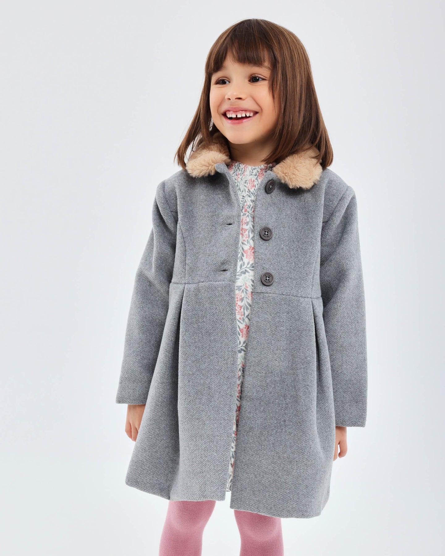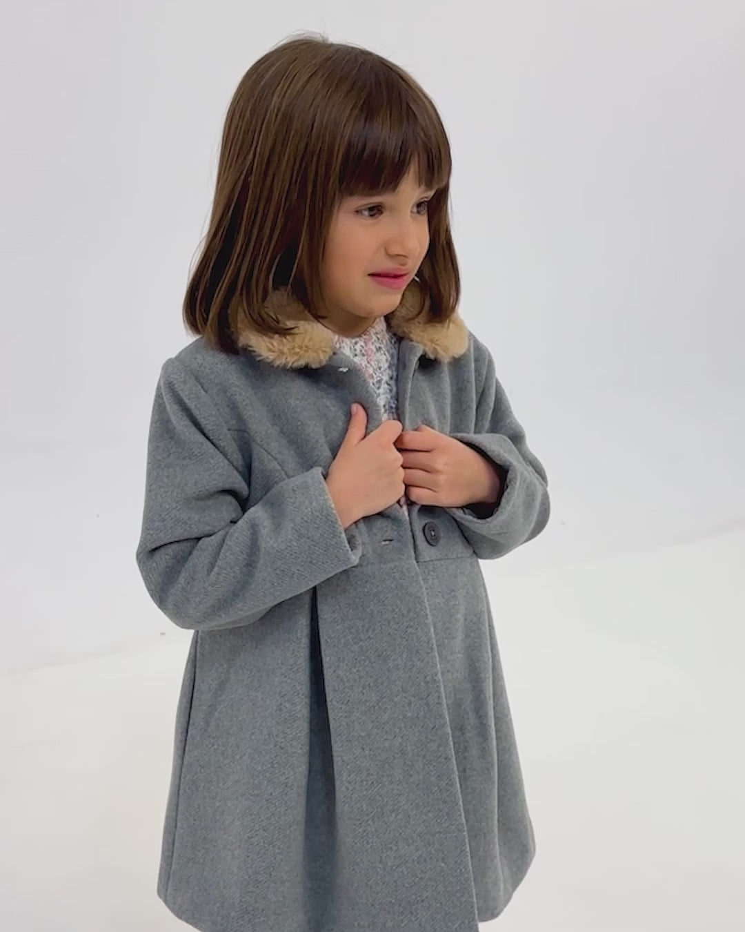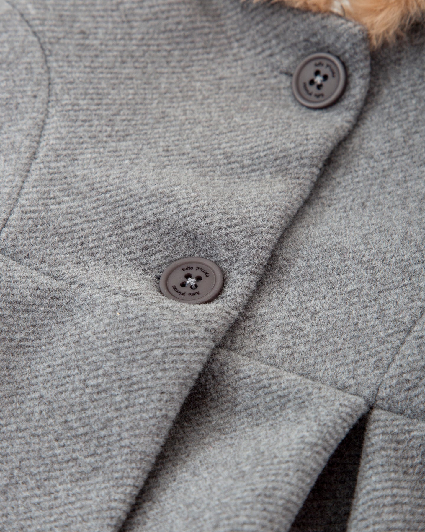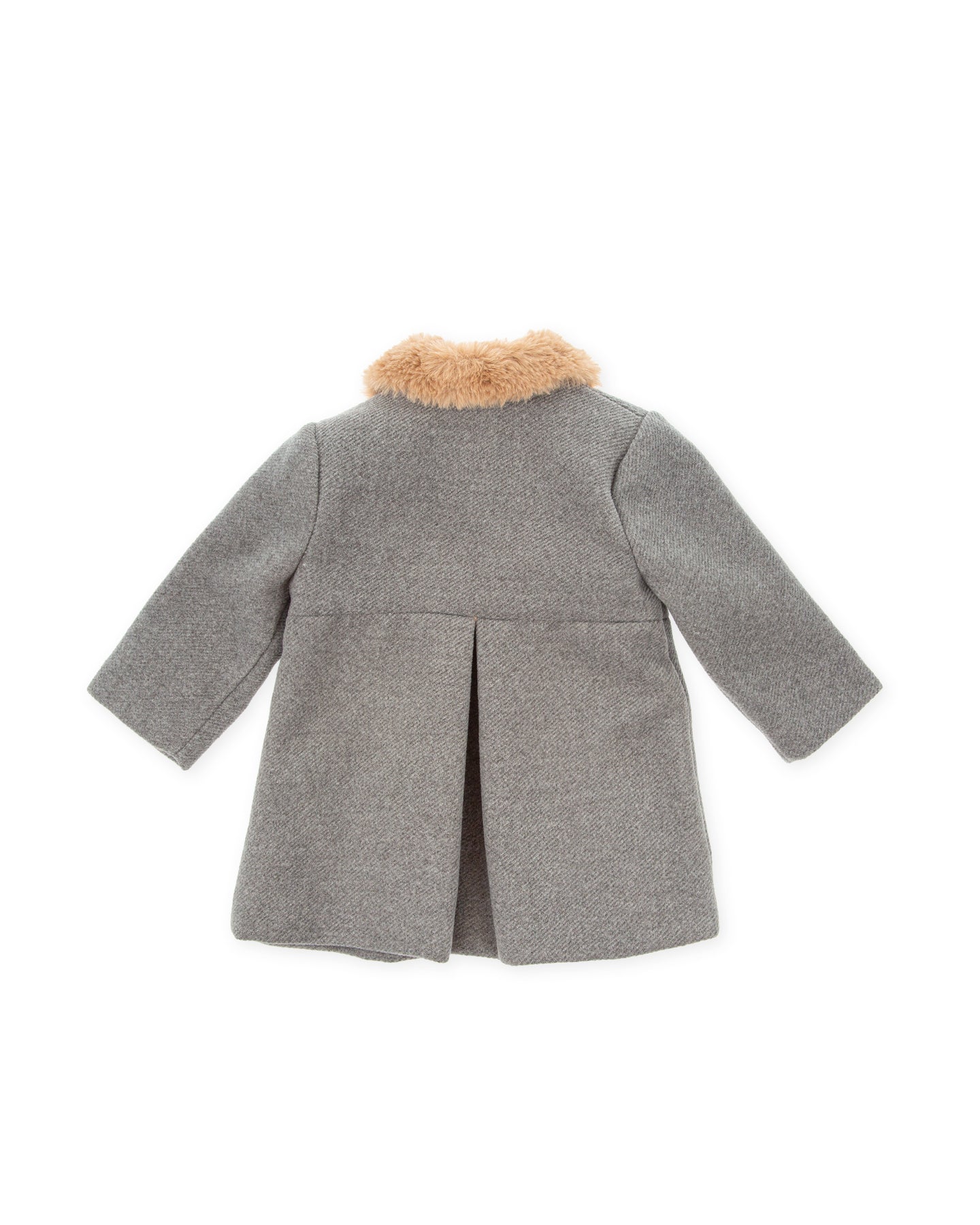 Abrigo de paño en gris con suave forro al tono. Cuello de pelo en color arena. Abertura delantera con botones.