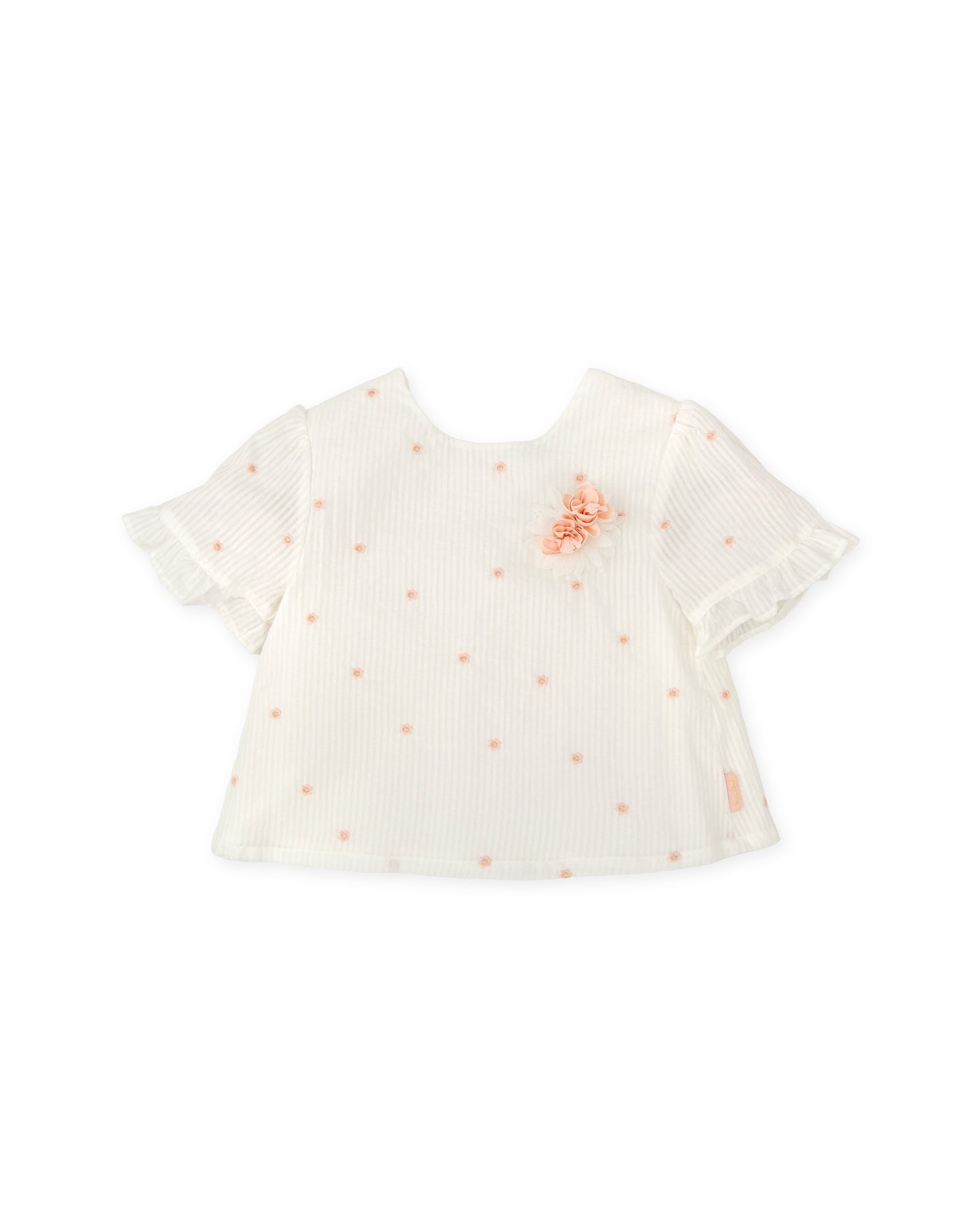 Blusa de manga corta de muselina a rayas y flores, mangas con volantes y elástico en la parte trasera. Decoración de flores en el delantero.