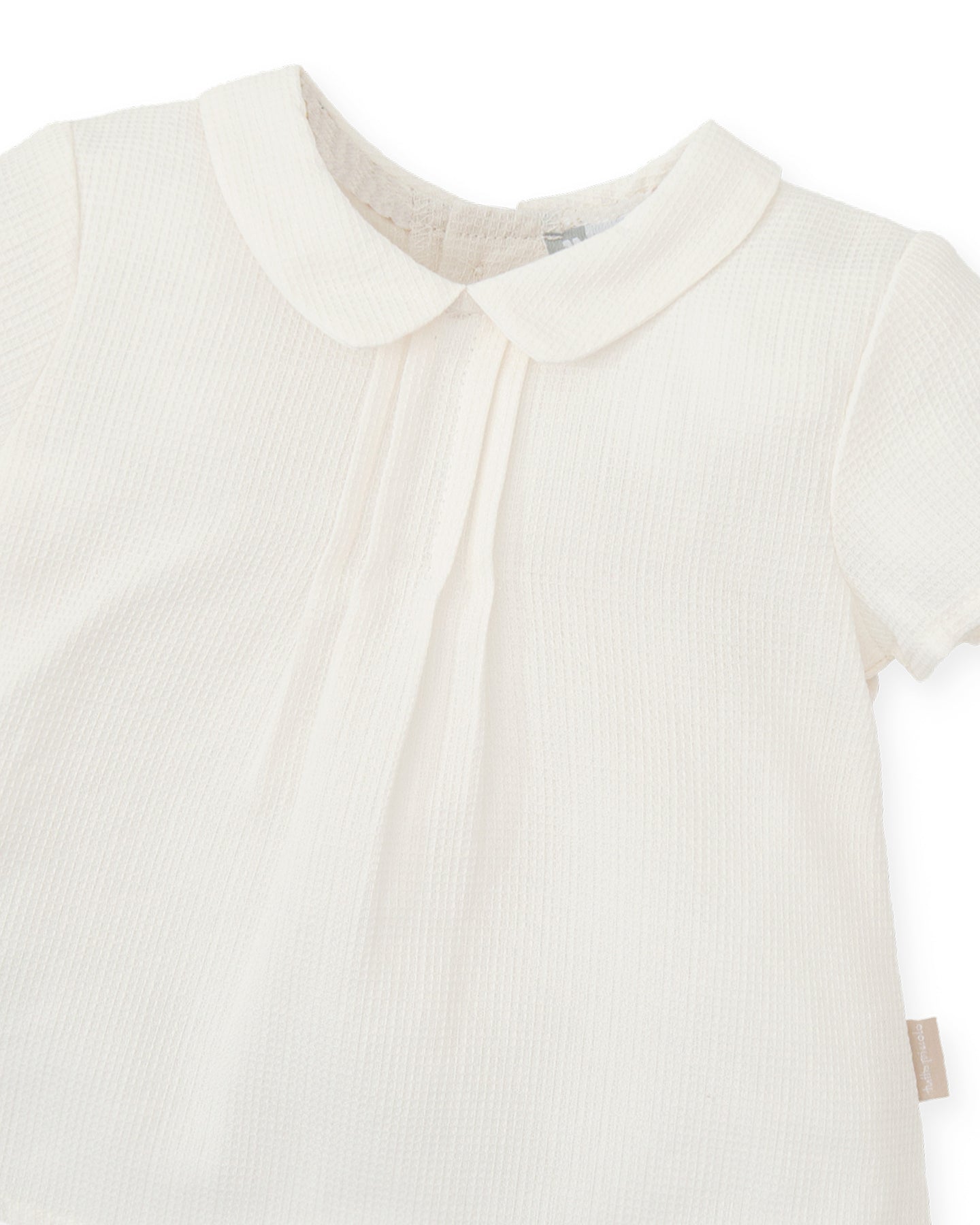 Blusón de manga corta en piqué pastilla especial color blanco. Detalle de pliegues en delantero. Abertura en espalda con botones.