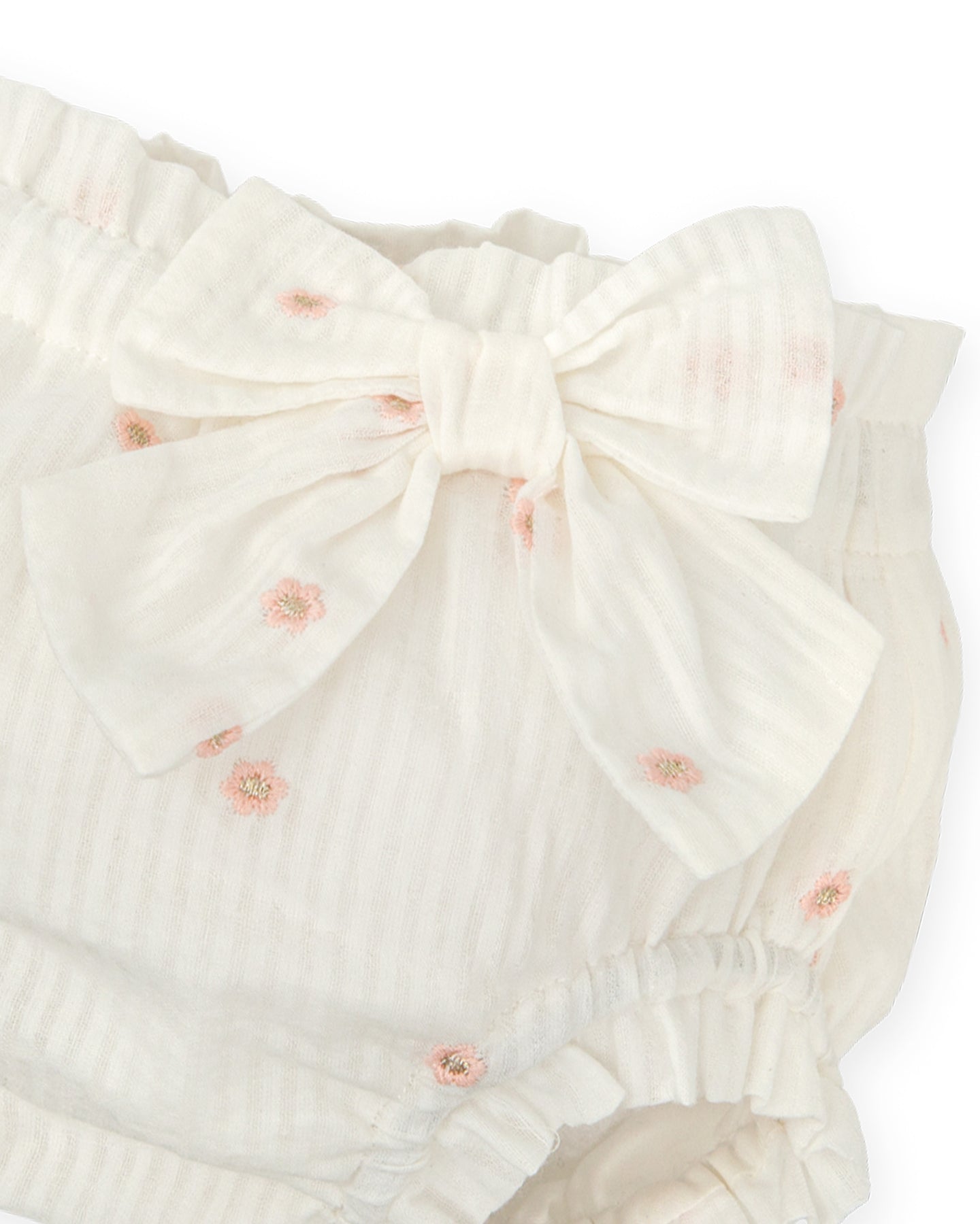 Bombacho de muselina de rayas con flores. Detalle lazo en el lateral de la cintura. Suave elástico en cintura y muslos.