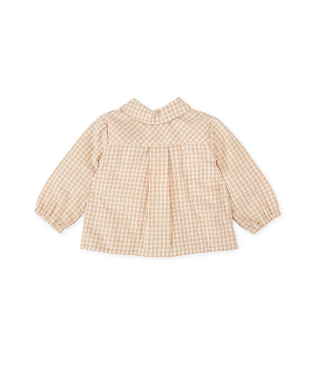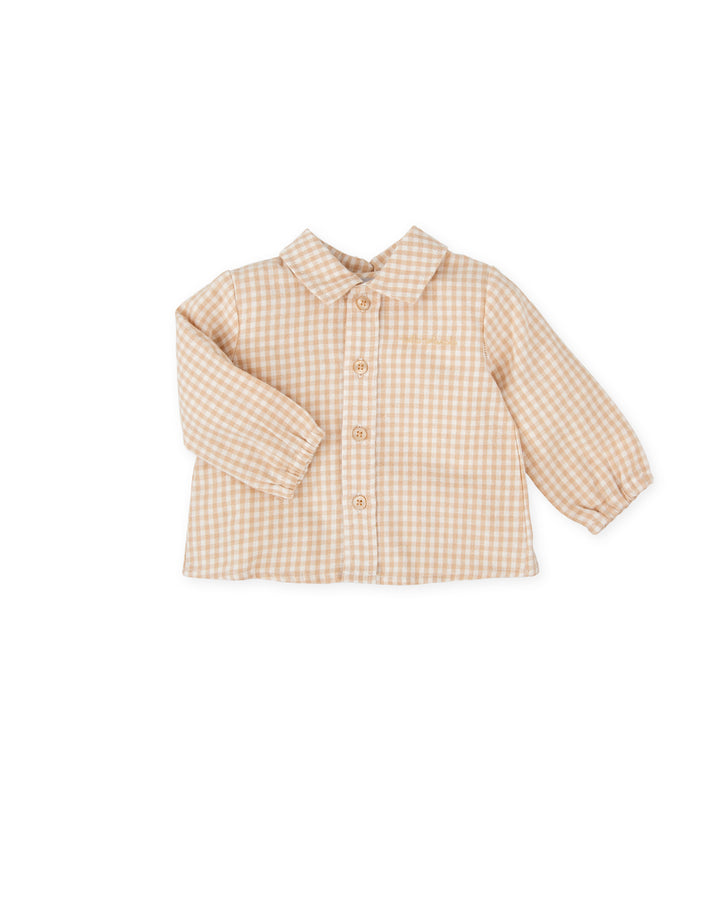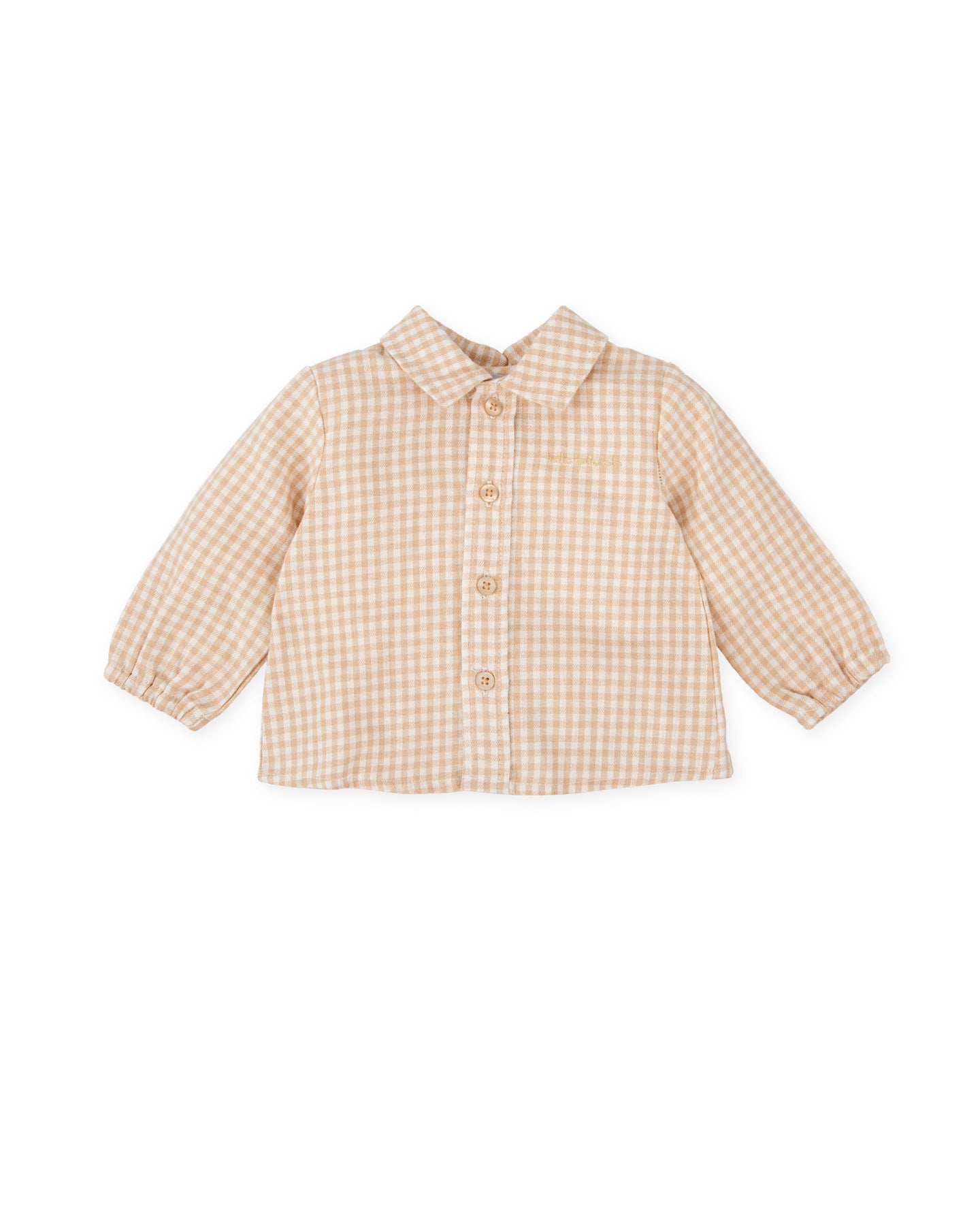 Camisa manga larga en viyela vichy en color arena. Detalle logo bordado y suave elástico en puños. Abertura delantera con botones.