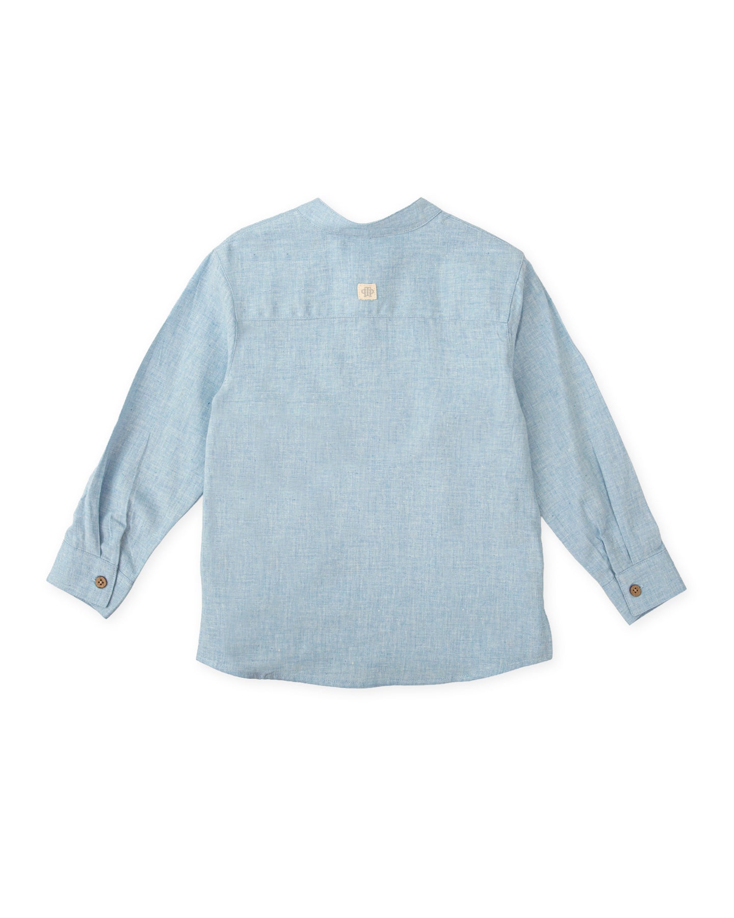 Camisa de manga larga de lino en color azul. Abertura delantera con tapilla y botones, bolsillo con cinta decorativa y aberturas laterales.