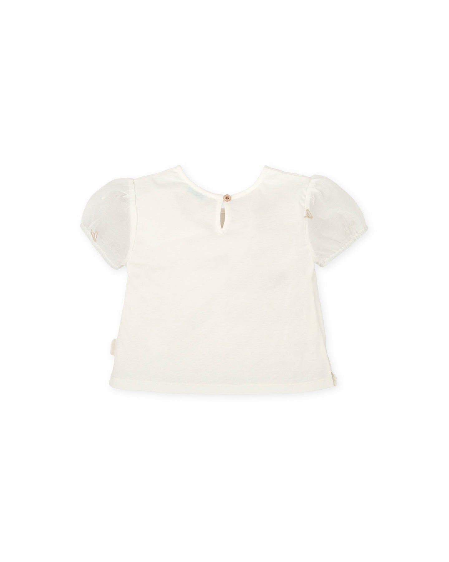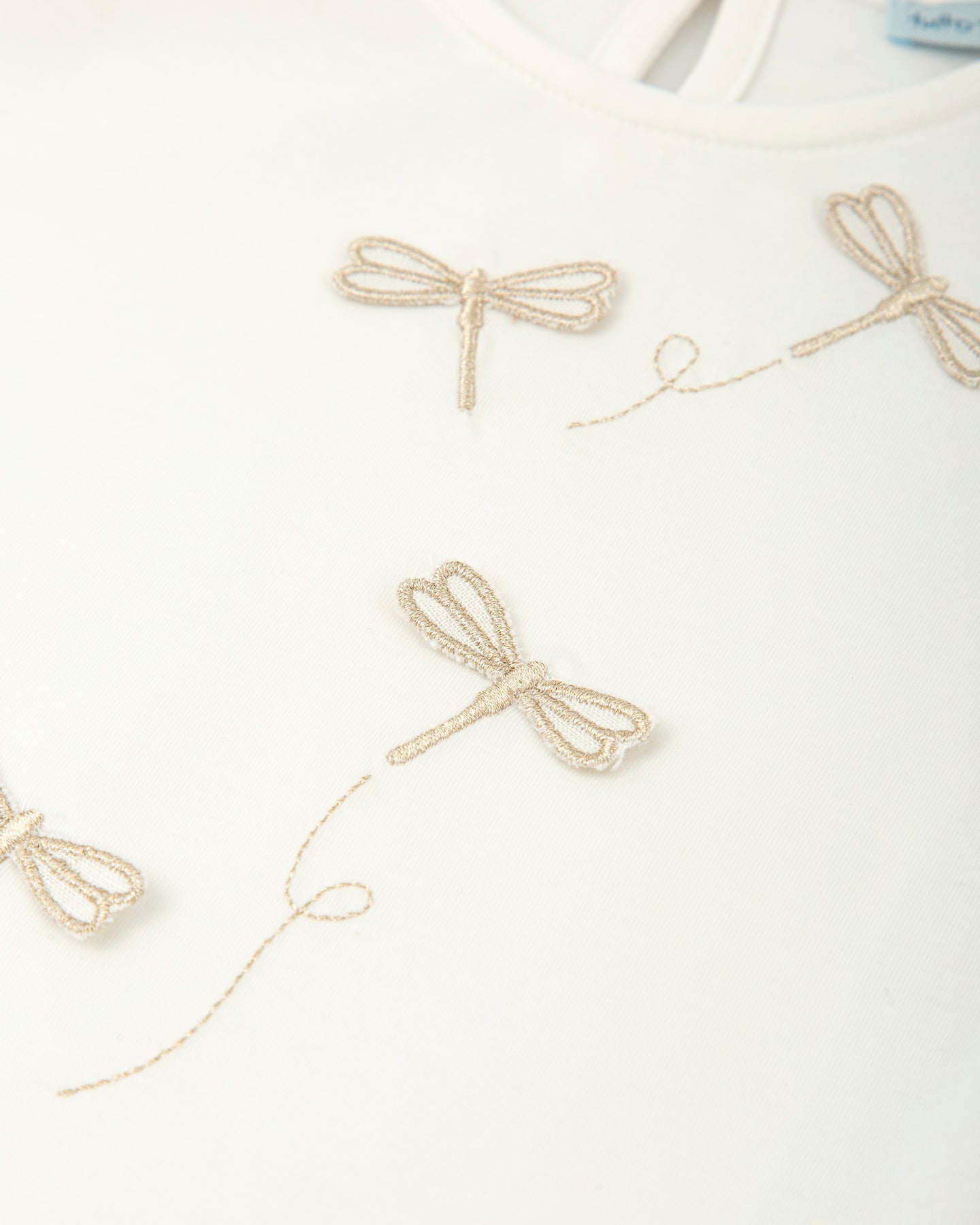 Camiseta de manga corta de punto liso viscosa en blanco químico. Mangas de organza acabadas con elástico. Decoración de libélulas bordadas en el delantero y abertura trasera con botón.