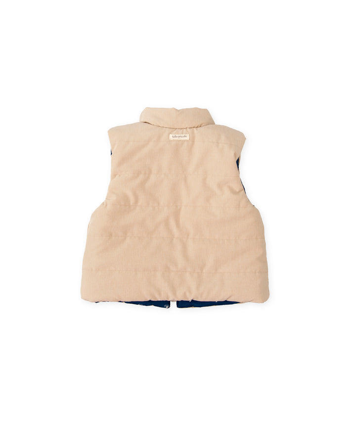 Chaleco reversible de microfibra estampada barcos en color azul marino y microfibra color arena con acolchado interior. Abertura delantera con cremallera.