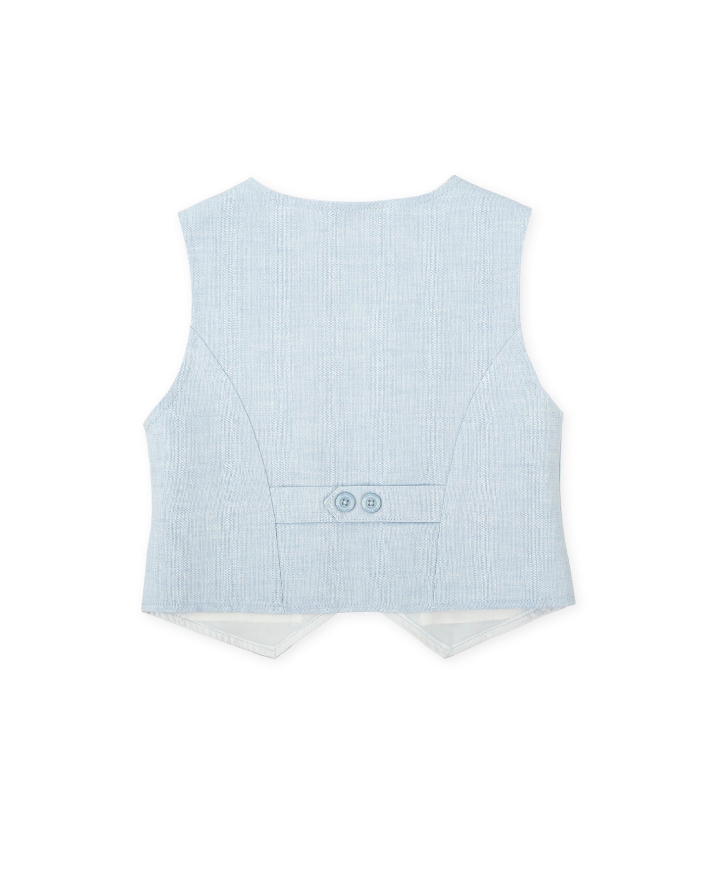 Chaleco de lino en color porcelana con suave Forro. Abertura delantera con botones. Detalle logo bordado.