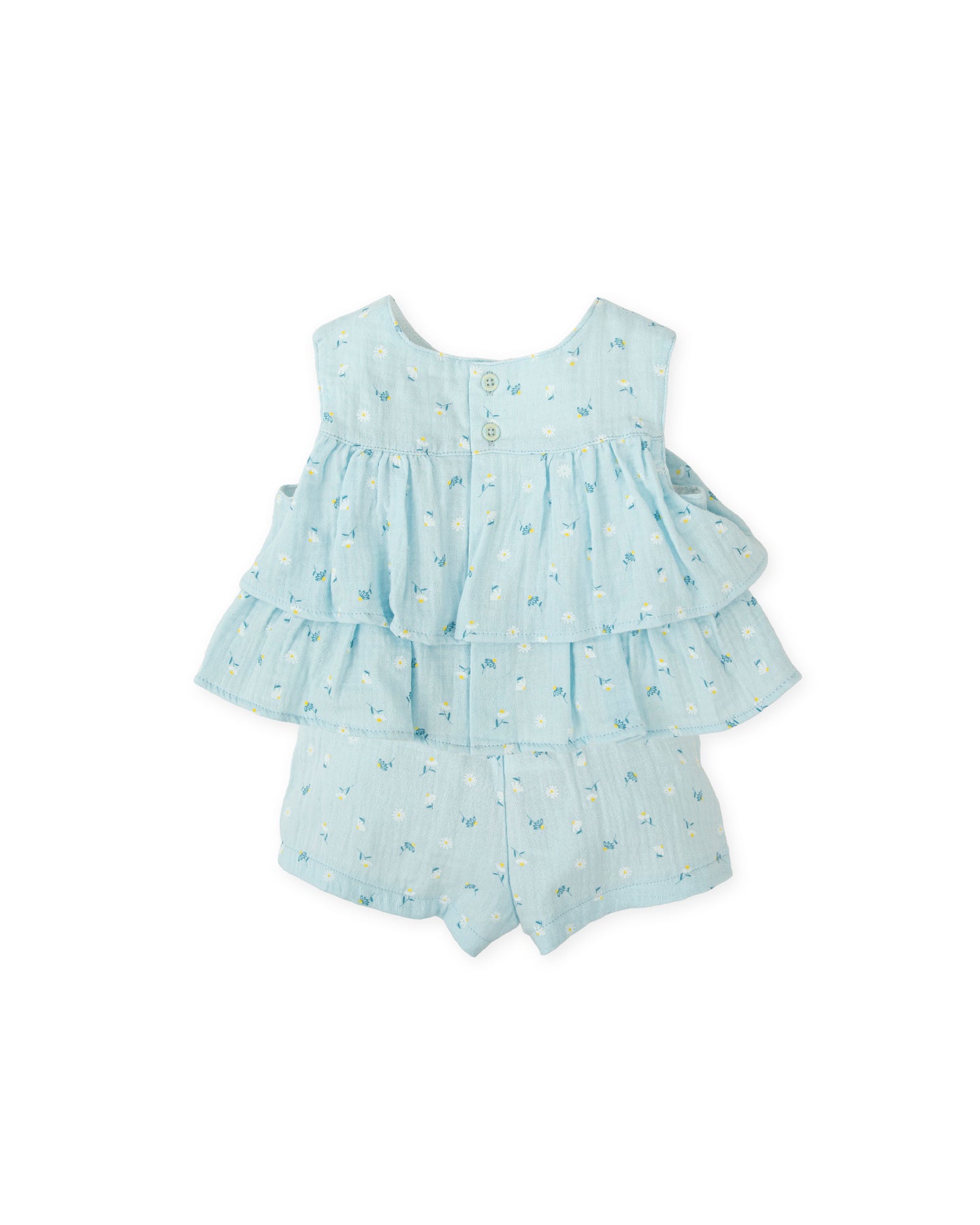 Conjunto de dos piezas sin mangas de muselina estampado flores. Blusa con volantes y abertura trasera con botones. Pantalón con elástico ajustable en la cintura trasera y decoración de lazos en el bajo.
