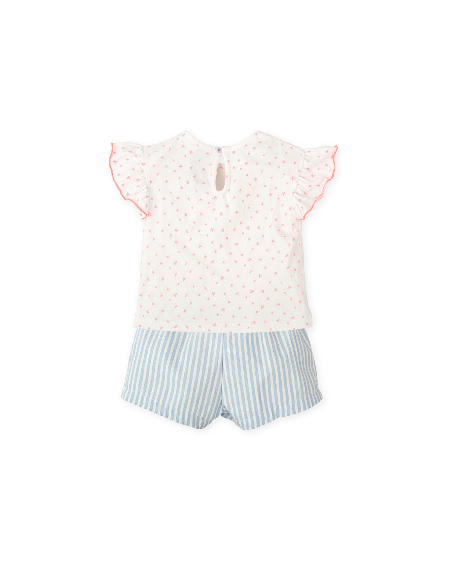 Conjunto de dos piezas de manga corta. Camiseta de punto liso con estampado estrellas, mangas con volante y abertura trasera con botón. Pantalón de popelín a rayas con cinturón decorativo de estrellas y elástico alrededor de la cintura.