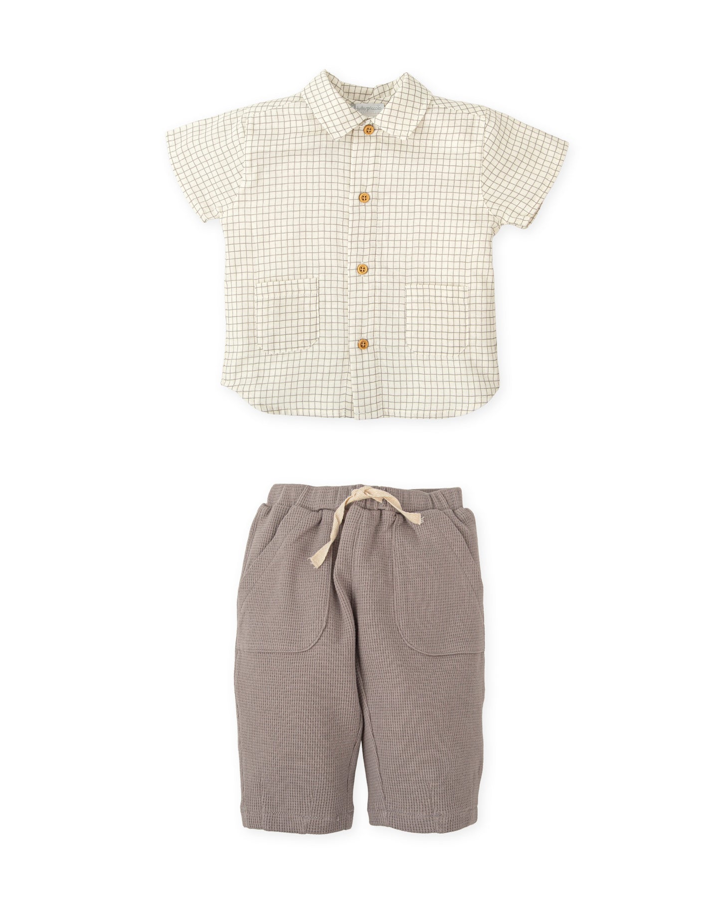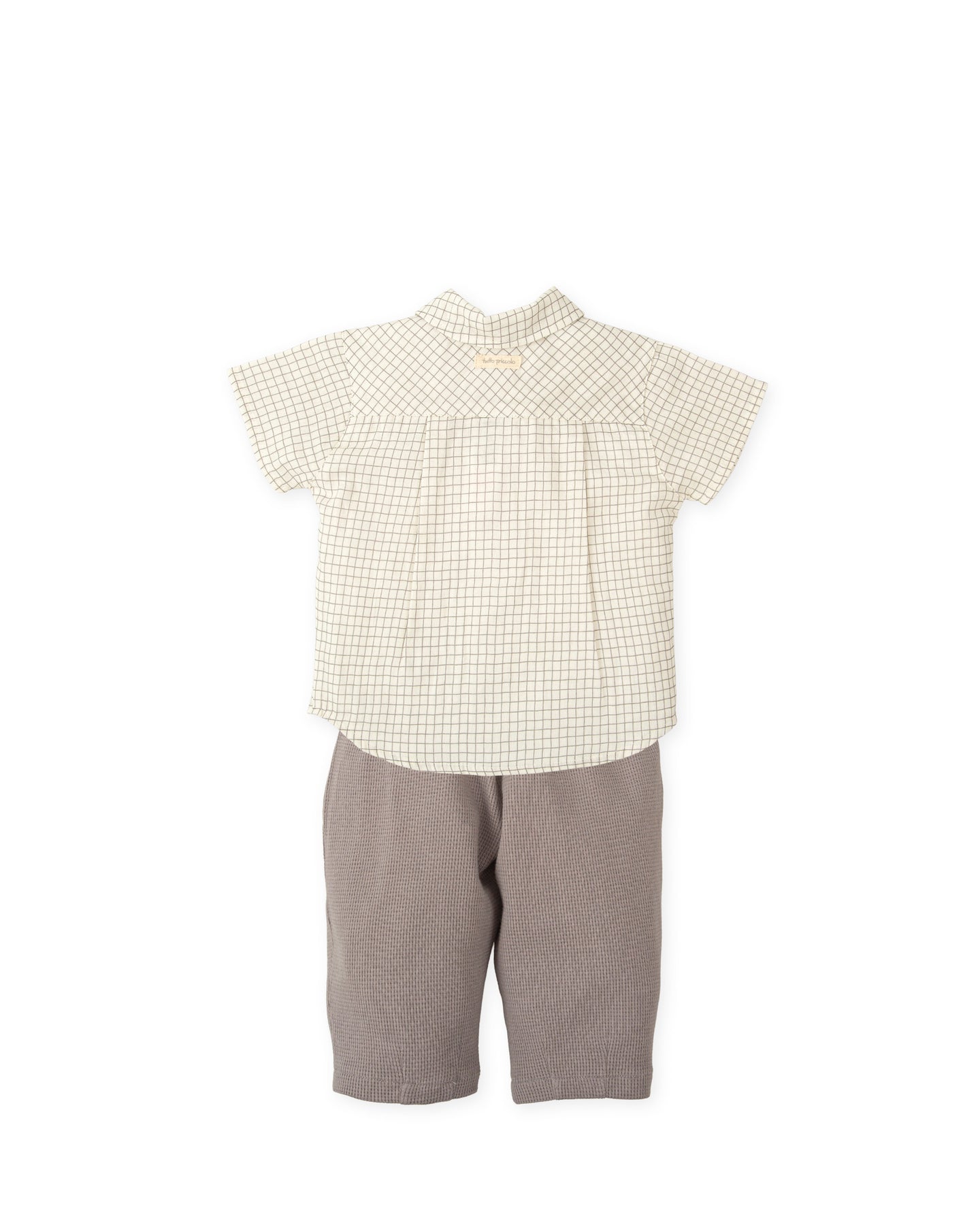 Conjunto de dos piezas de manga corta. Camisea de gasa a cuadros con abertura botones. Pantalón de tejido especial gris, con pinza en el bajo, elástico alrededor de la cintura y cordón decorativo de algodón cosido en el centro.