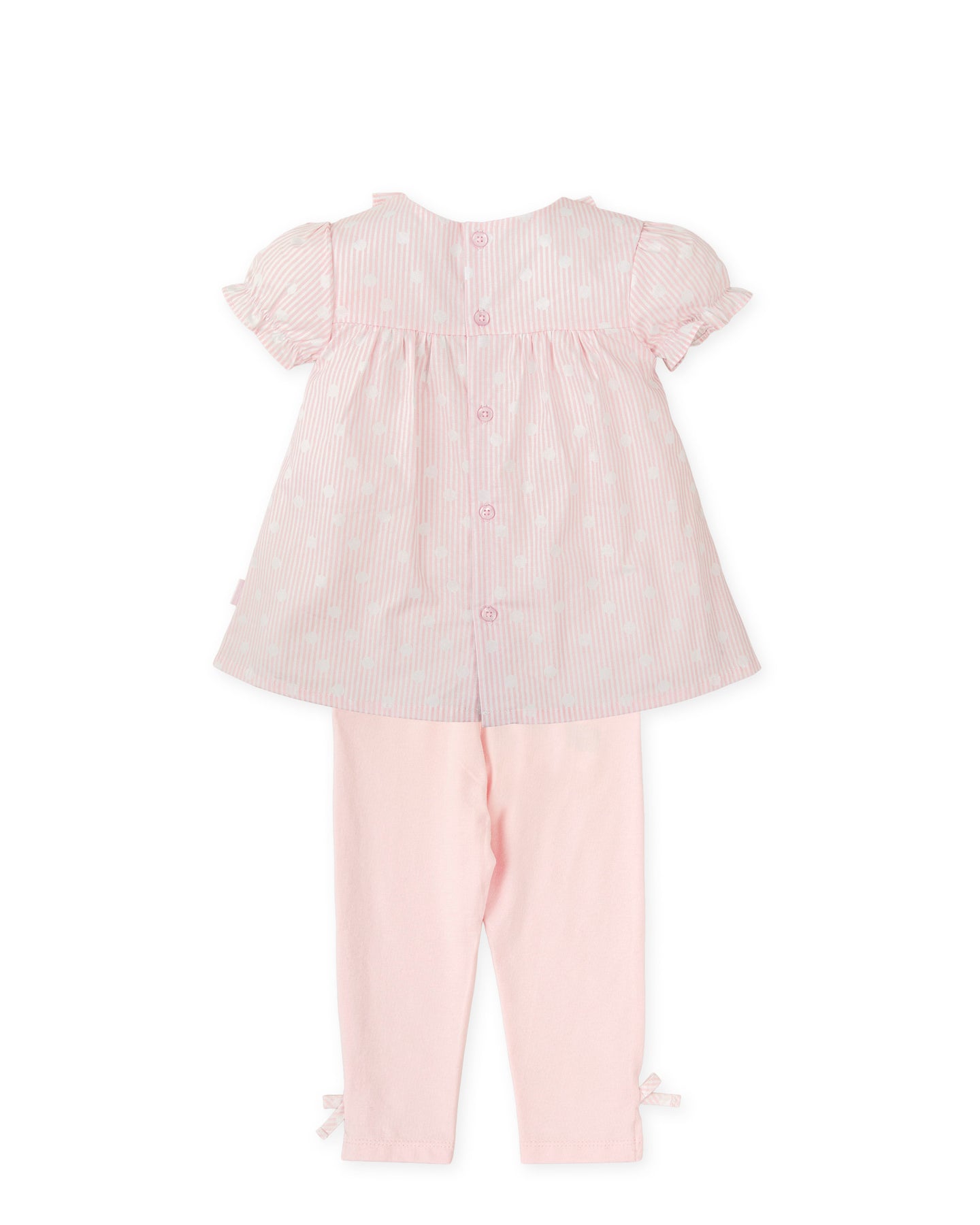 Conjunto de dos piezas de manga corta. Camisa de popelín rayas con motas con volante y mangas con elástico, abertura con botones. Leggins de punto liso con elastano, suave elástico en la cintura y aberturas en los laterales con lazo de adorno.